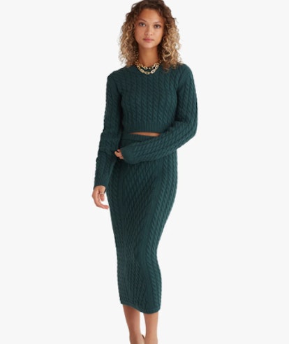 Favorite Daughter's official launch comes on Dec. 3, after "many arguments over colors, fabrics, styles, and who should be the fit model," jokes Erin. "[It's] a mix of pieces you can wear as you WFH and some great options as we all get dressed to go out again (eventually!)" With pieces ranging in price from $98 to $498, you'll find ribbed cardigan bodysuits in lavender hues ($198), knit bra tops in a pale gray ($98), and cable knit pencil skirts in forest green ($249). Each of these pieces are great for wearing in their prescribed co-ords, or mixing and matching with jeans — as both Foster sisters did throughout the campaign.