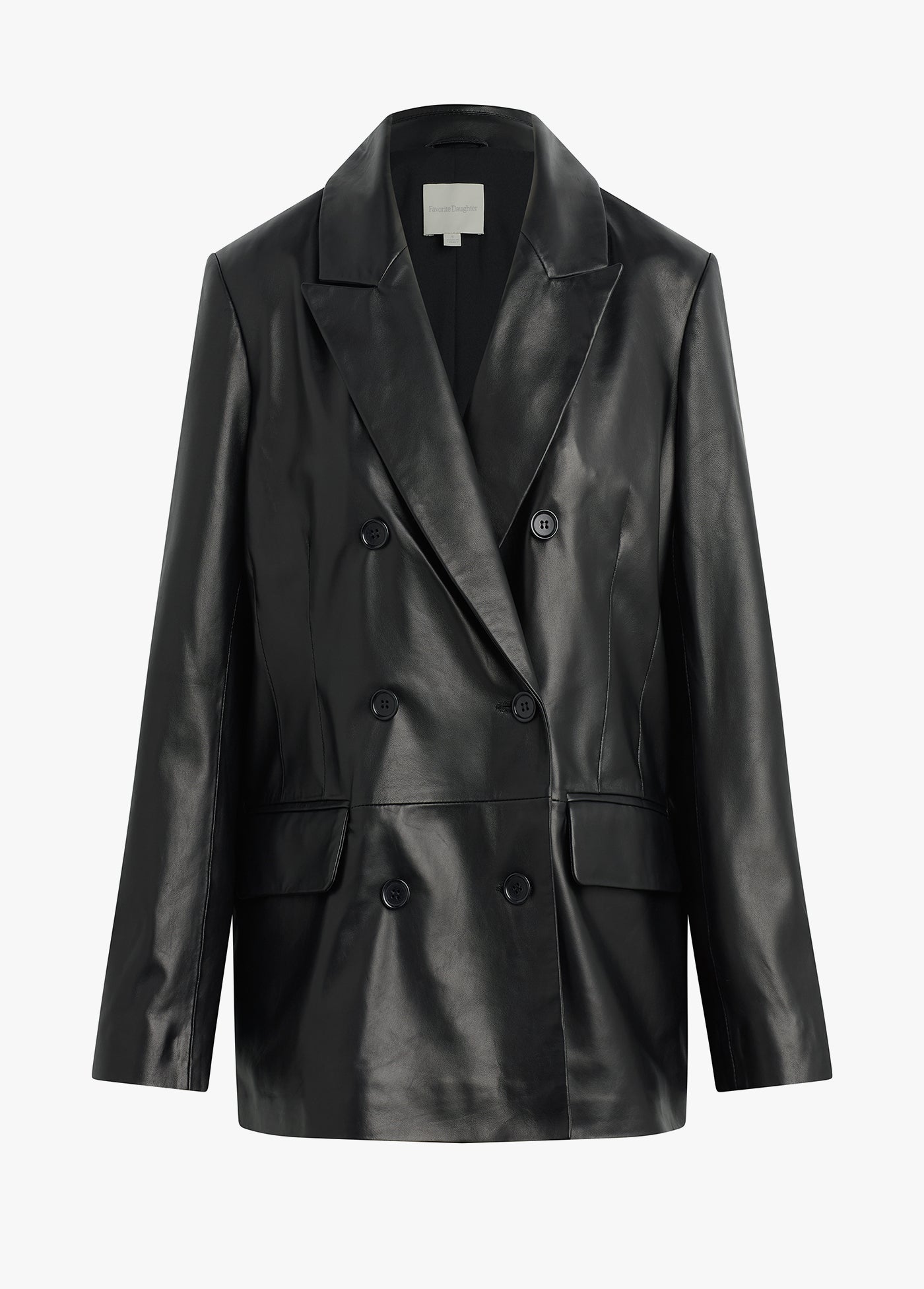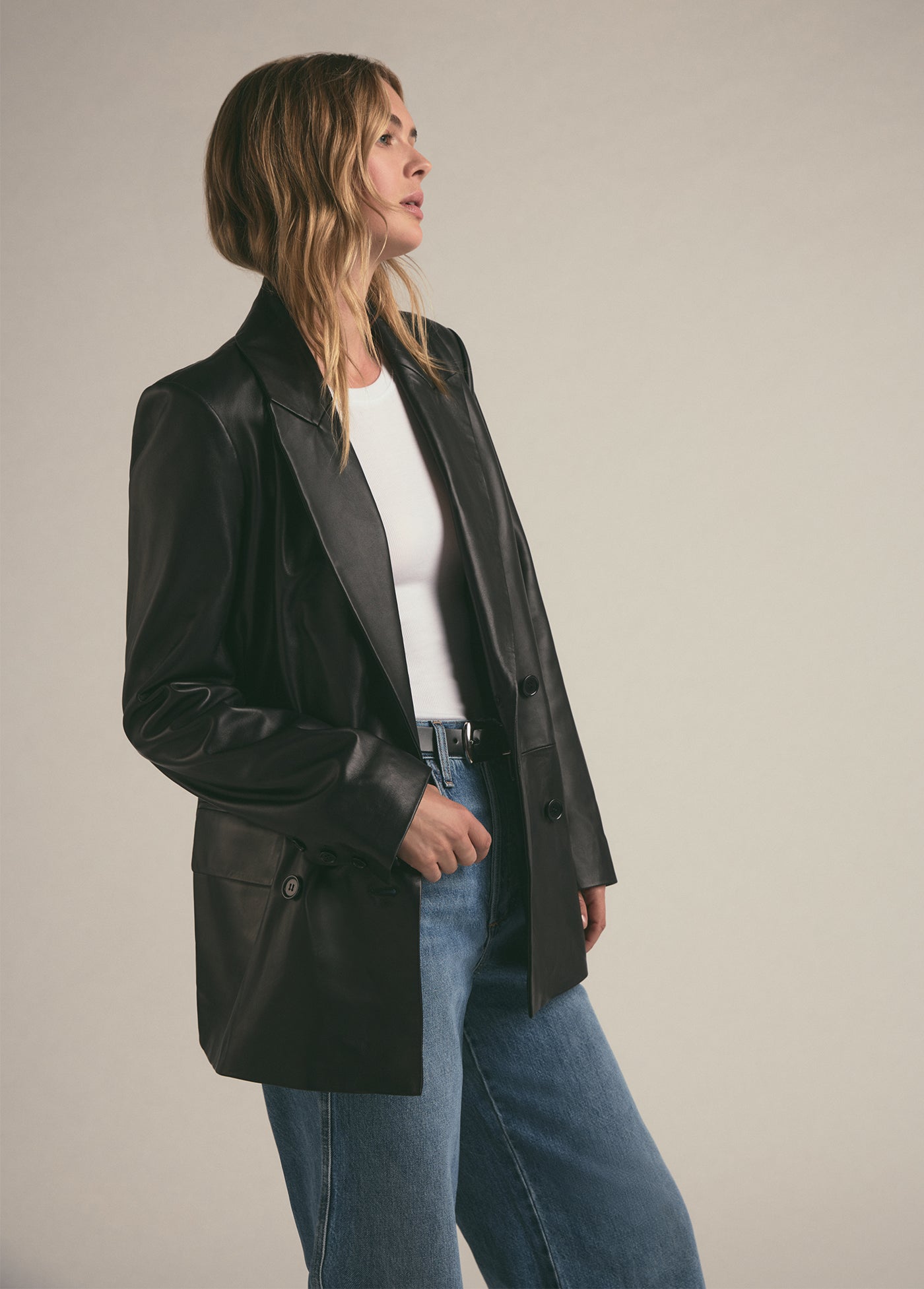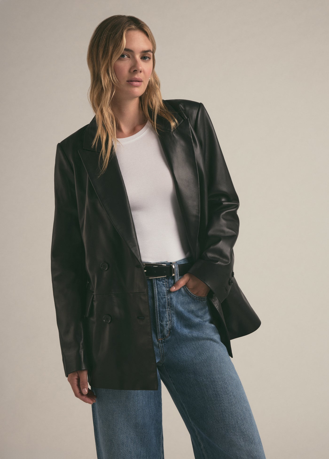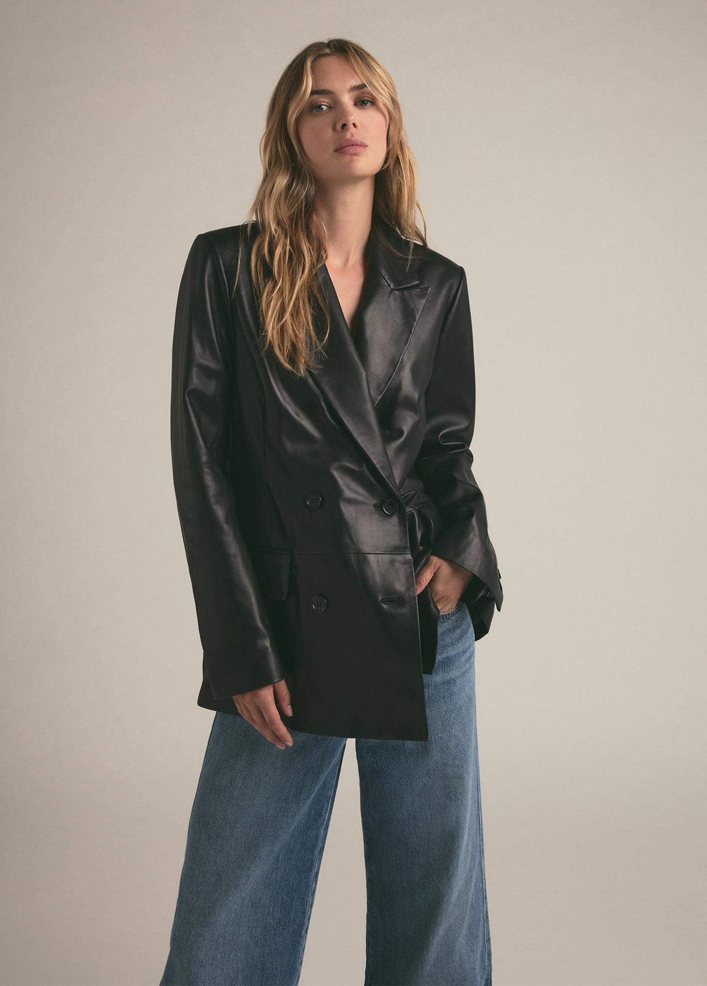 The Agnes Blazer in buttery-soft leather is bound to be a favorite for years to come. The double-breasted style is slightly oversized yet tailored, finished with a notch lapel, flap pockets and matching black buttons.