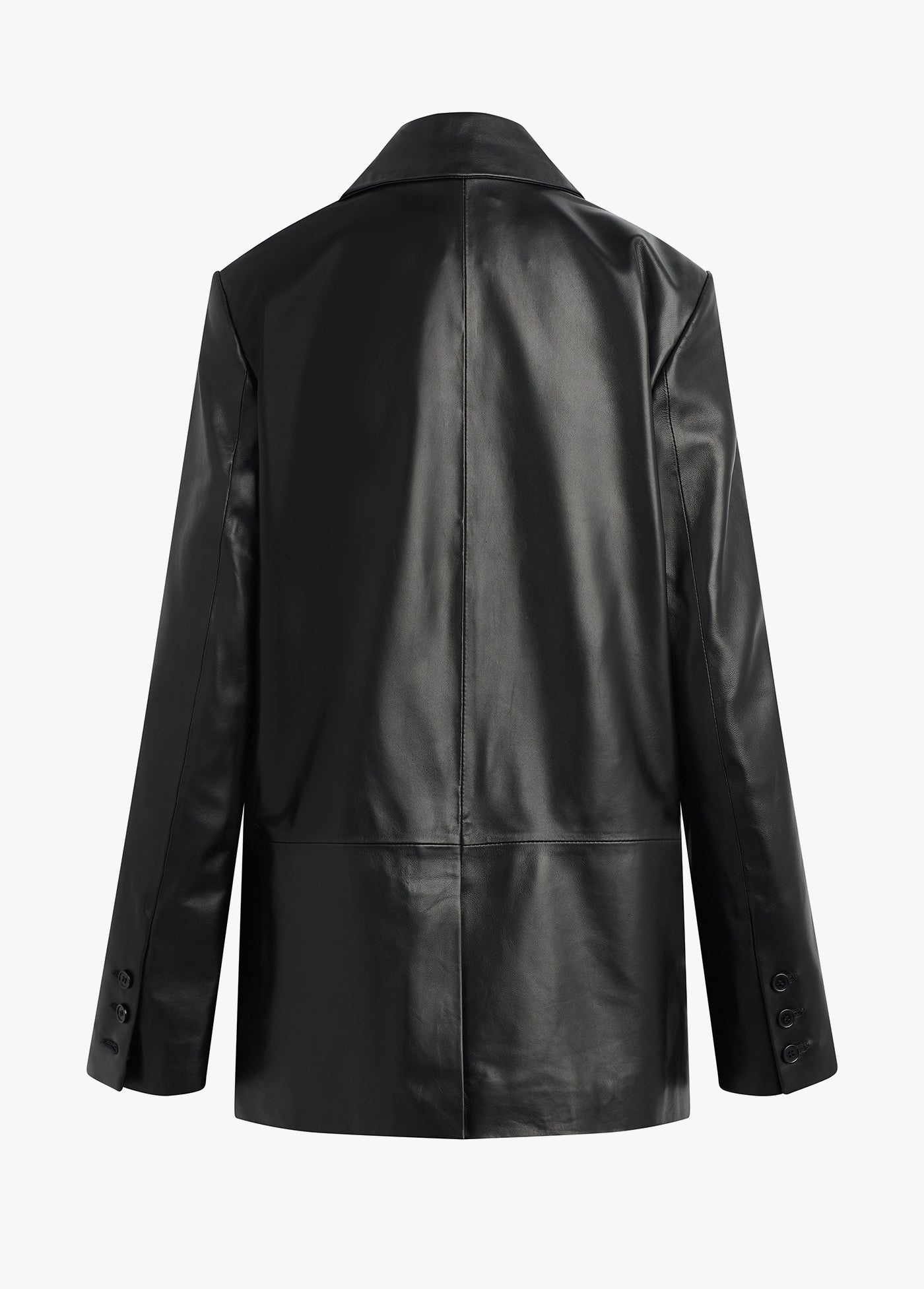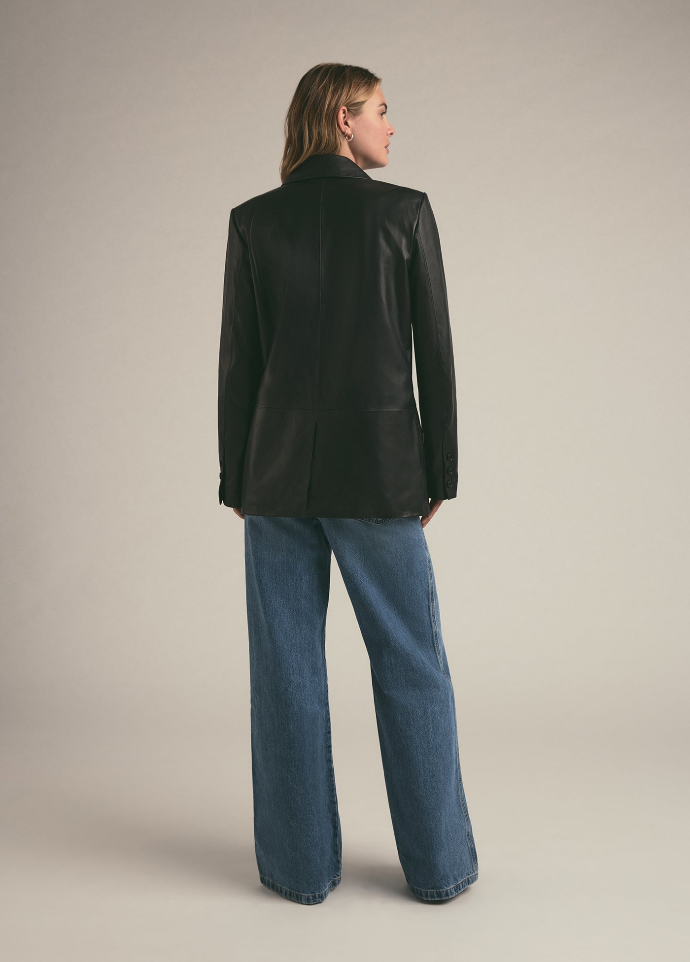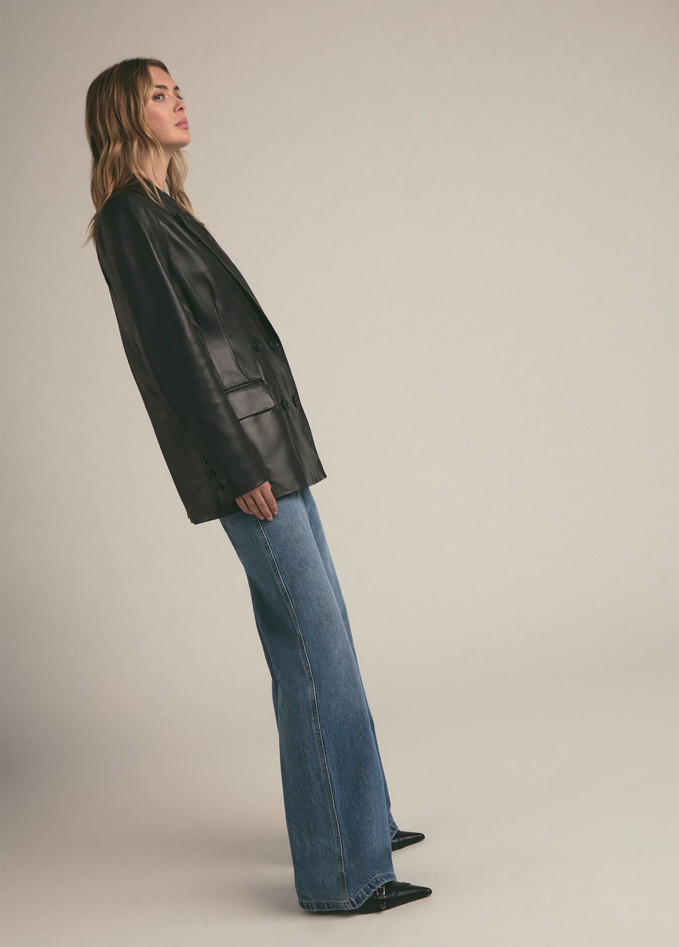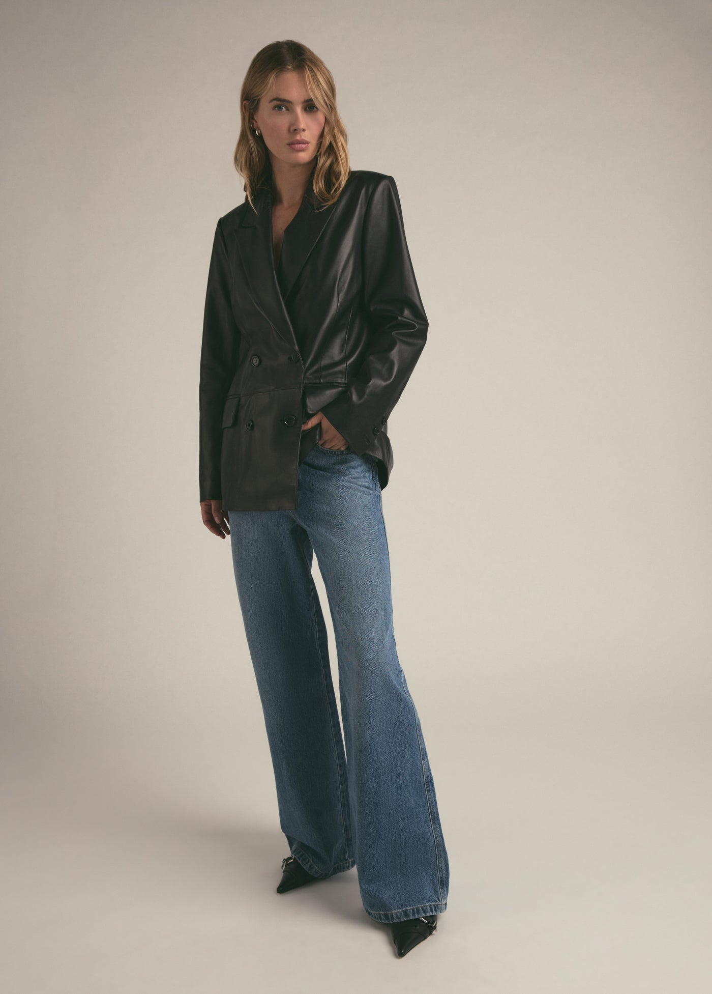 The Agnes Blazer in buttery-soft leather is bound to be a favorite for years to come. The double-breasted style is slightly oversized yet tailored, finished with a notch lapel, flap pockets and matching black buttons.