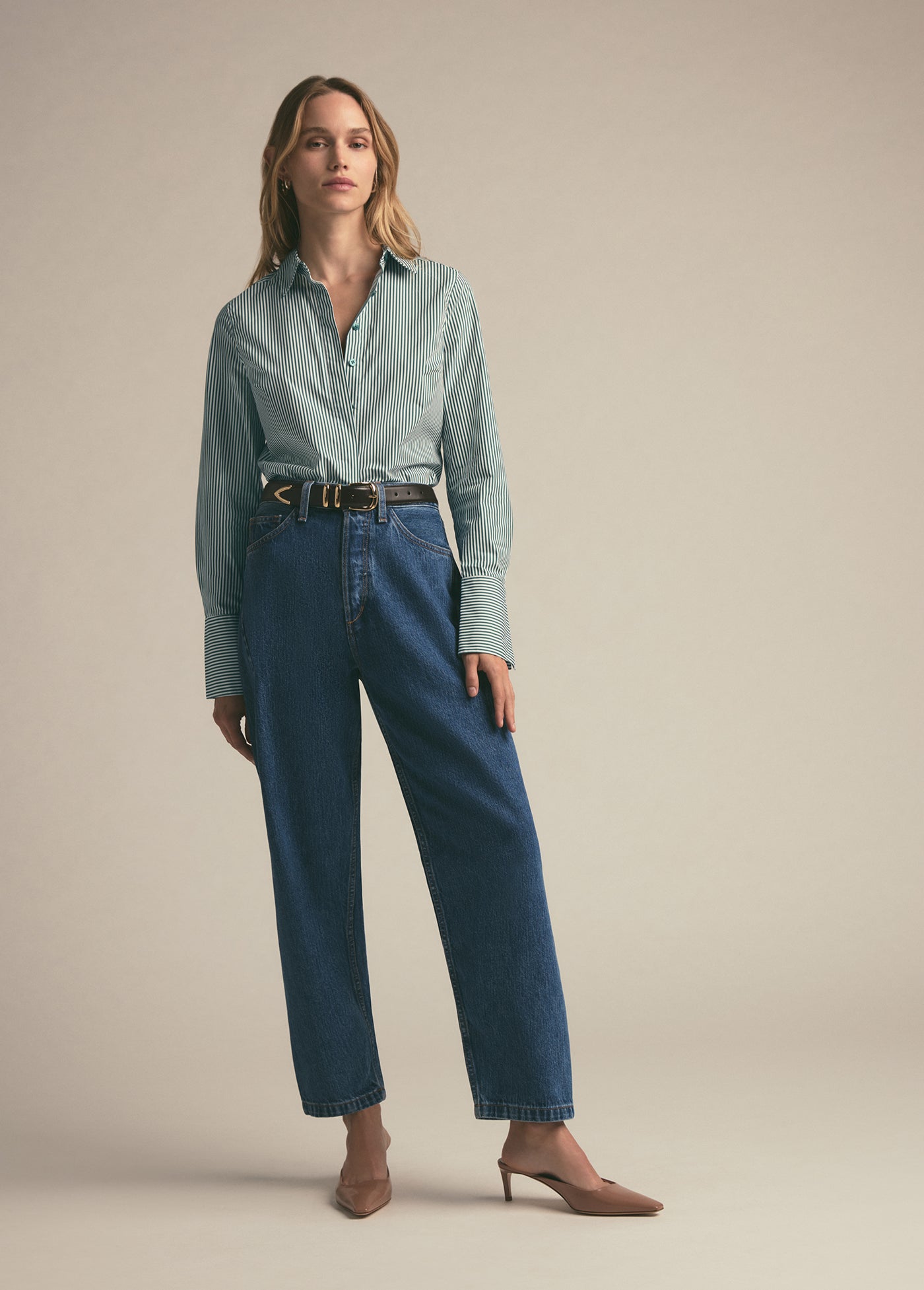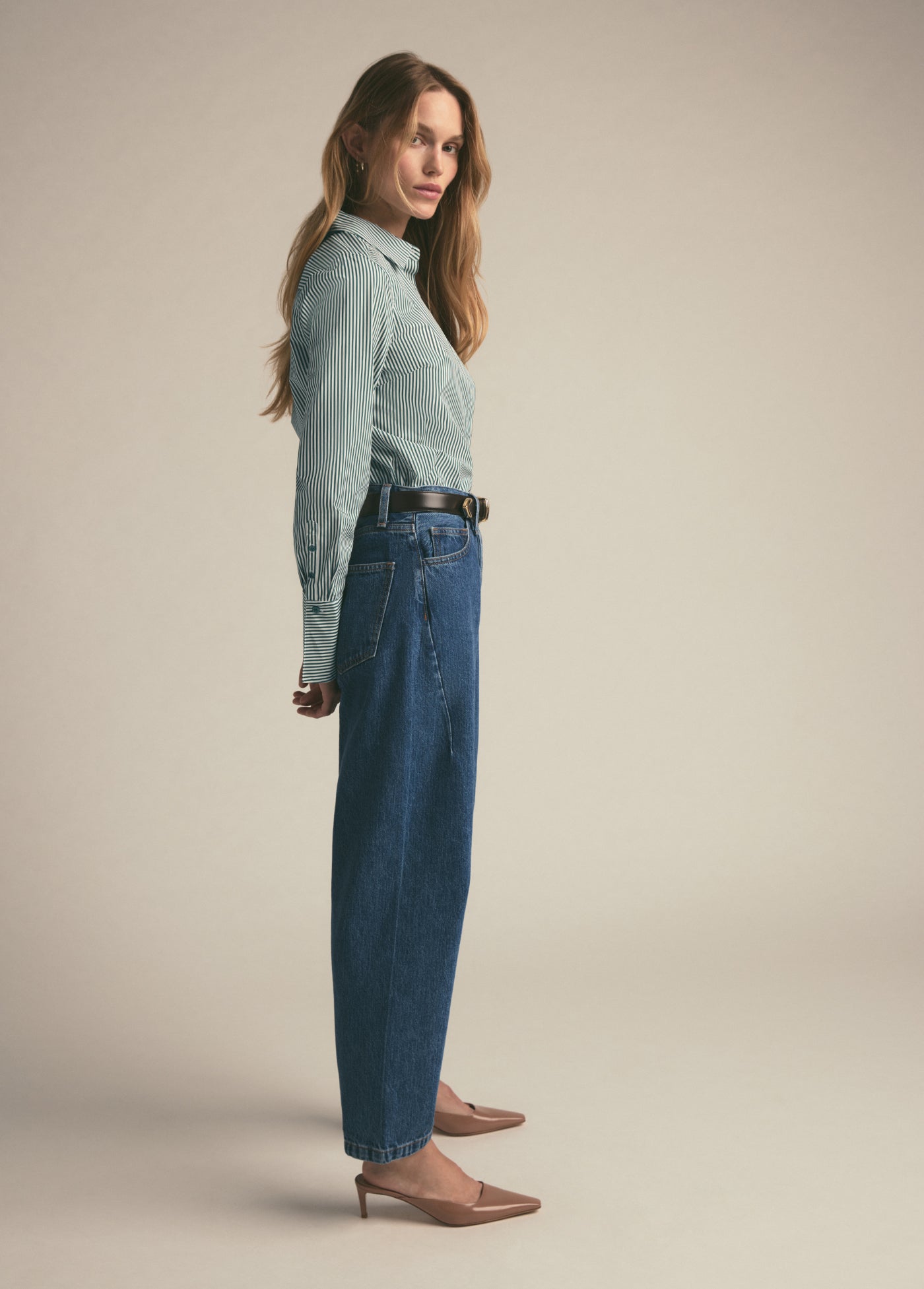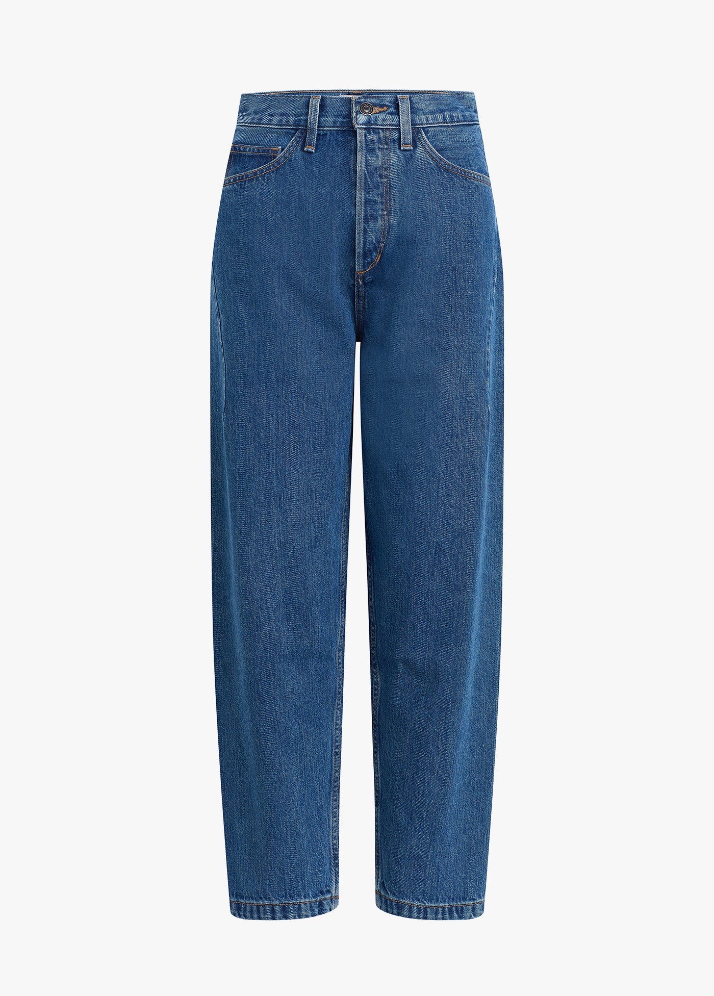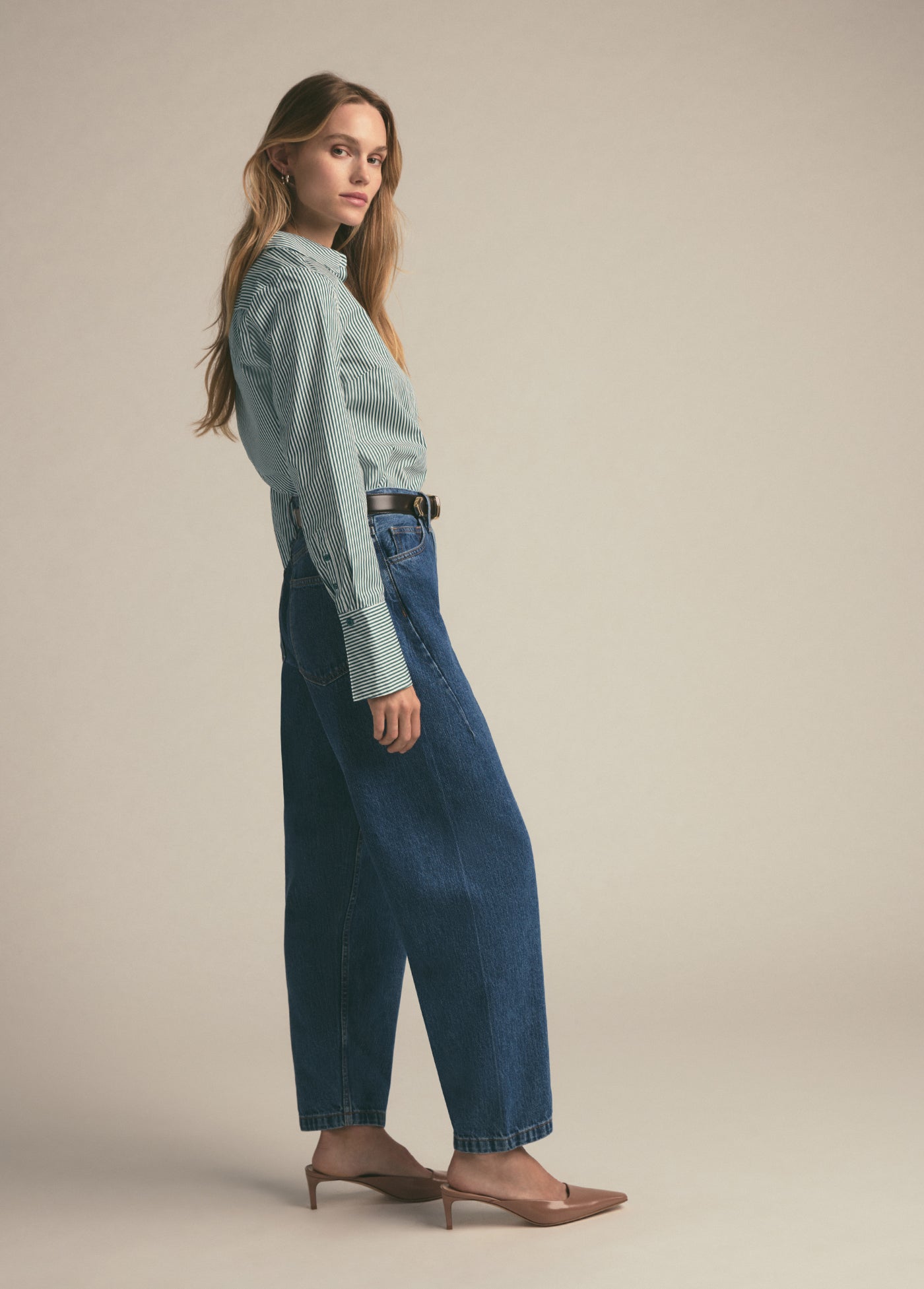 - Leg: Easy at the thigh and slightly barreled/curved to a tapered hem