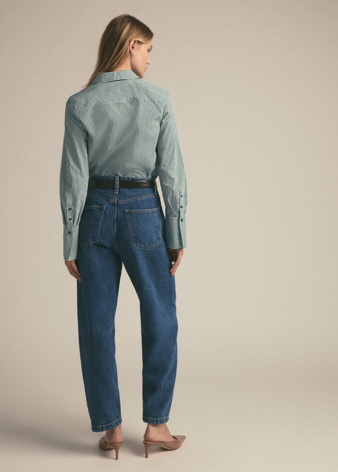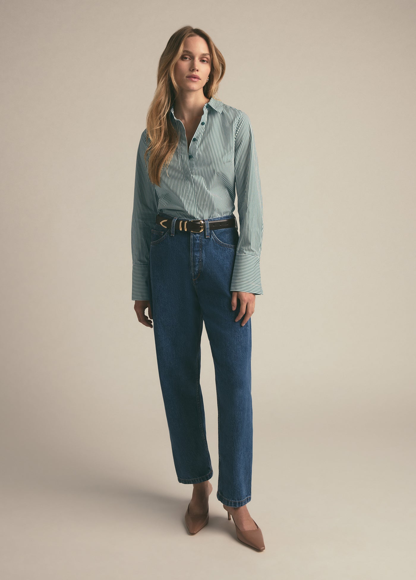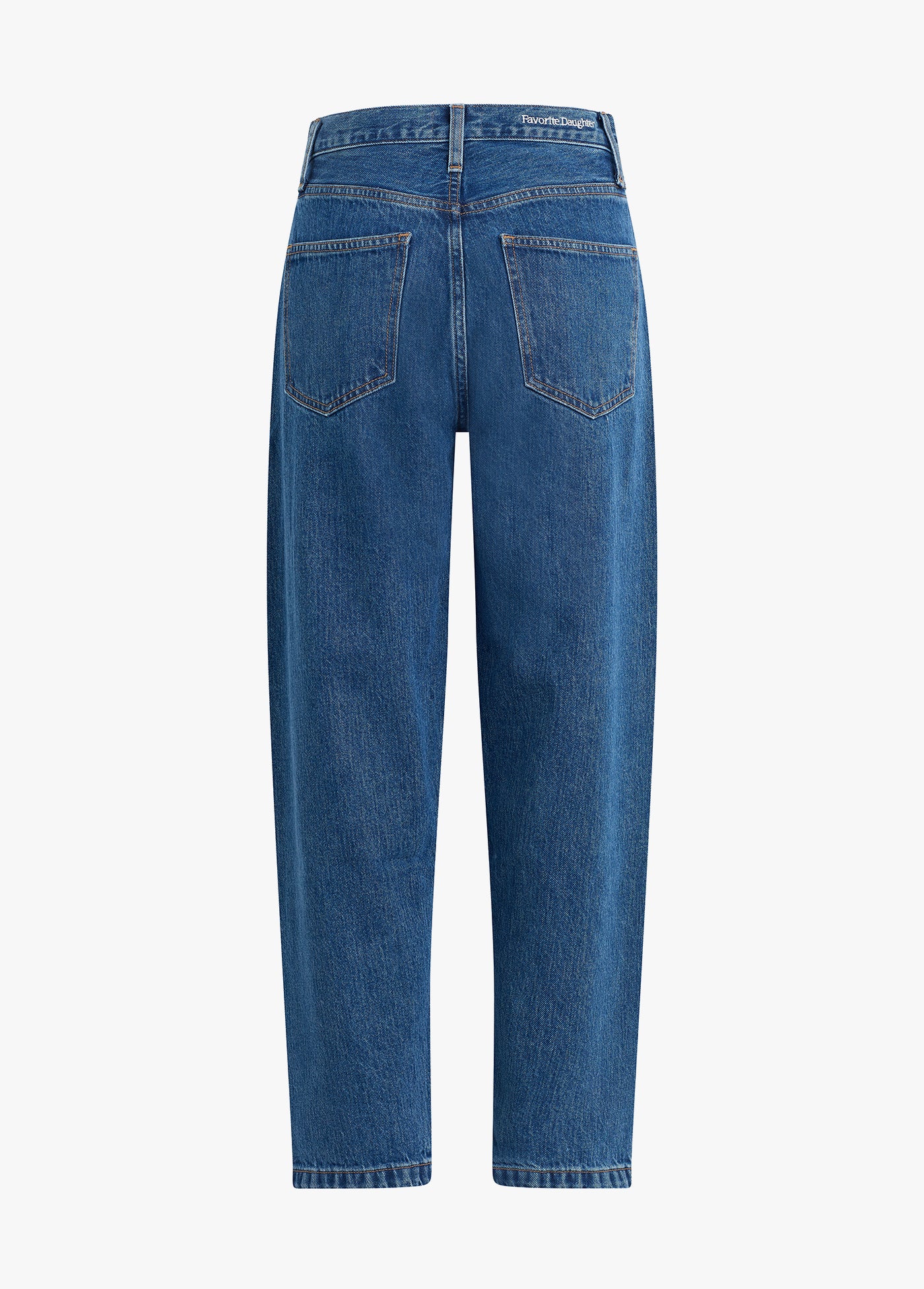 Easy does it with the Nikki. The mid-rise fit is easy at the hips and thighs with a slight barrel, tapered hem. The pair is a true medium-blue shade to show the highs and lows of the wash. Unlike most traditional five-pocket pairs, The Nikki has no side seam but we've added a slightly asymmetrical dart towards the front. (And Favorite Daughter embroidery at the back waistband, of course.)