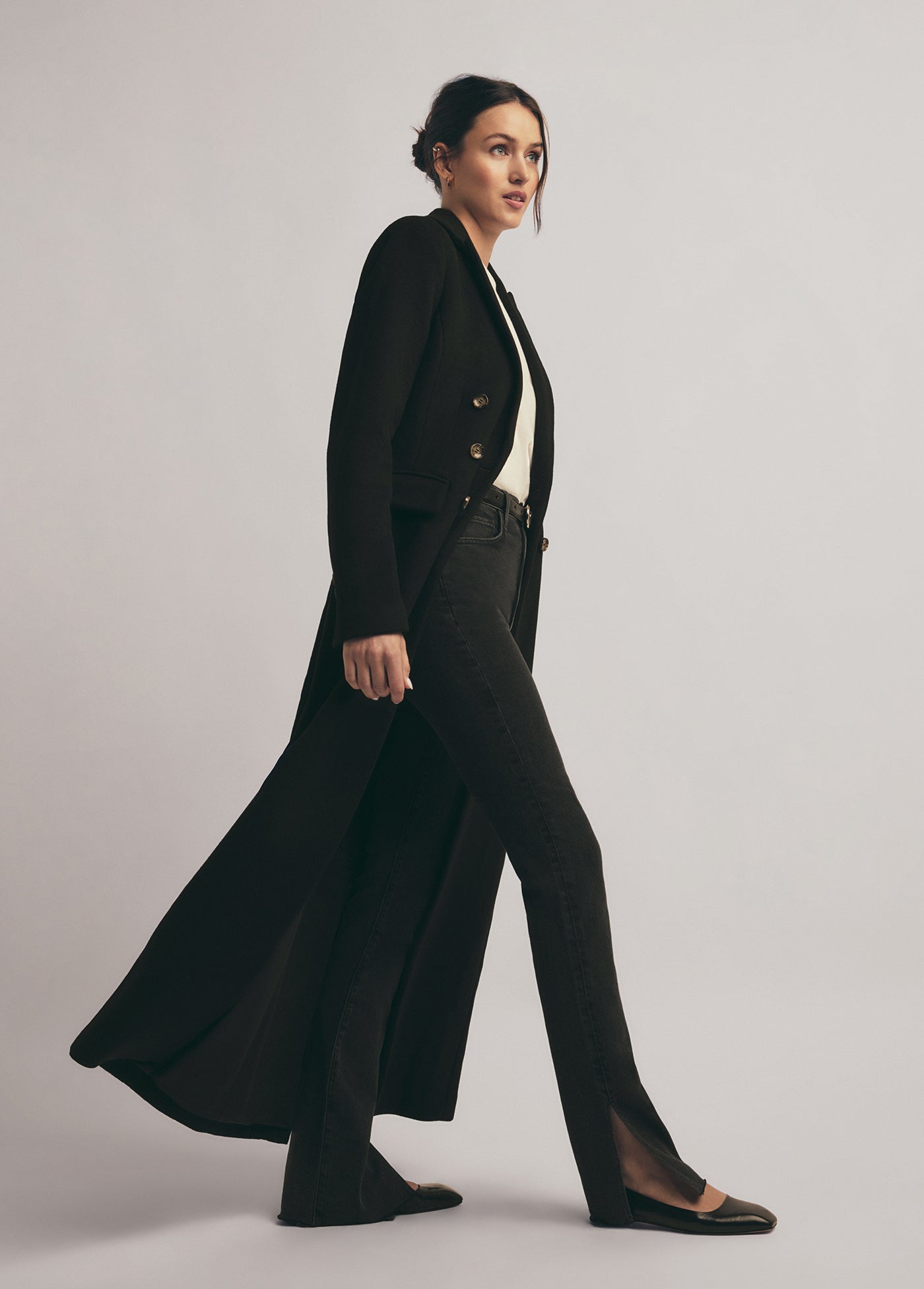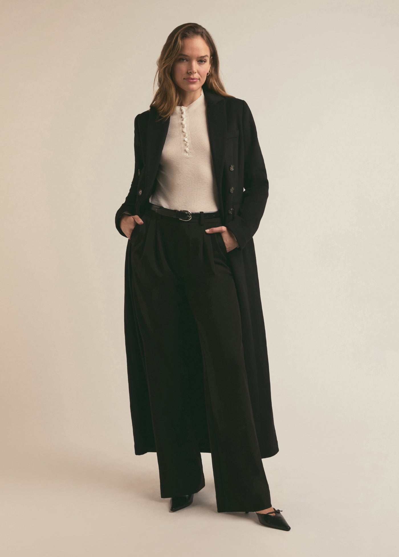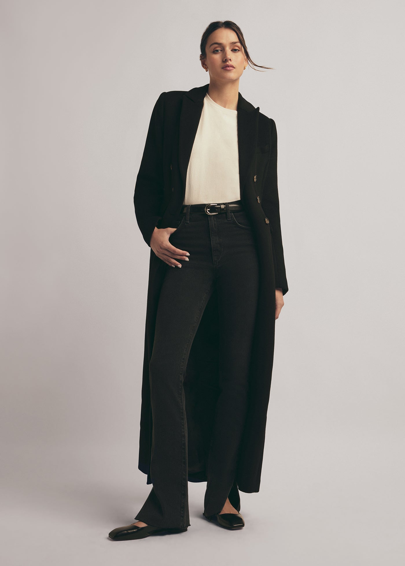 Tailored for winter, the double-breasted Simon Coat is both pretty and practical. The ankle-sweeping style has a slimmer fit cut from a double-faced wool blend with a hint of cashmere. (It’s also fully lined for added warmth.) With front flap pockets and marble buttons, this classic black coat may make winter your favorite season of style.