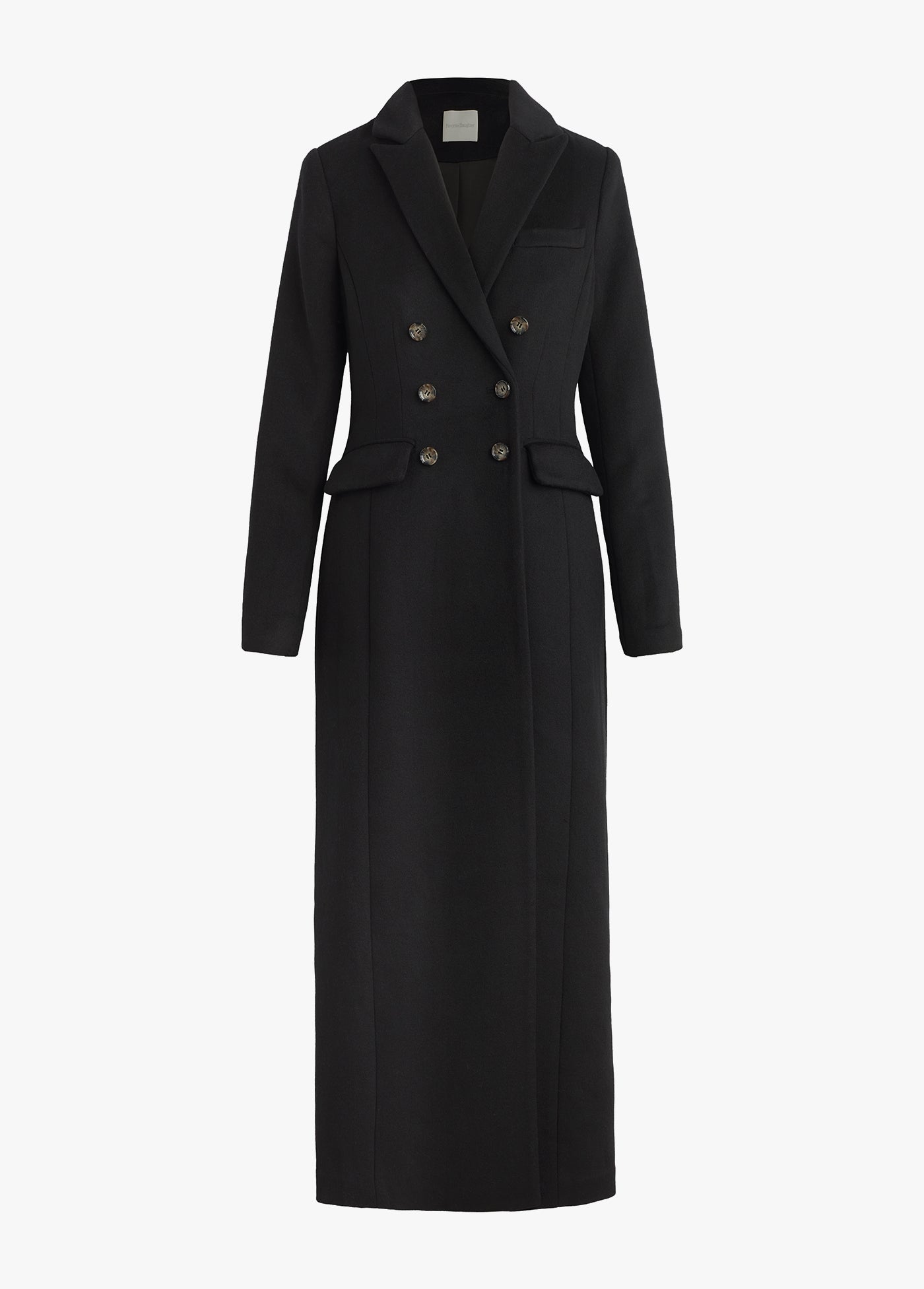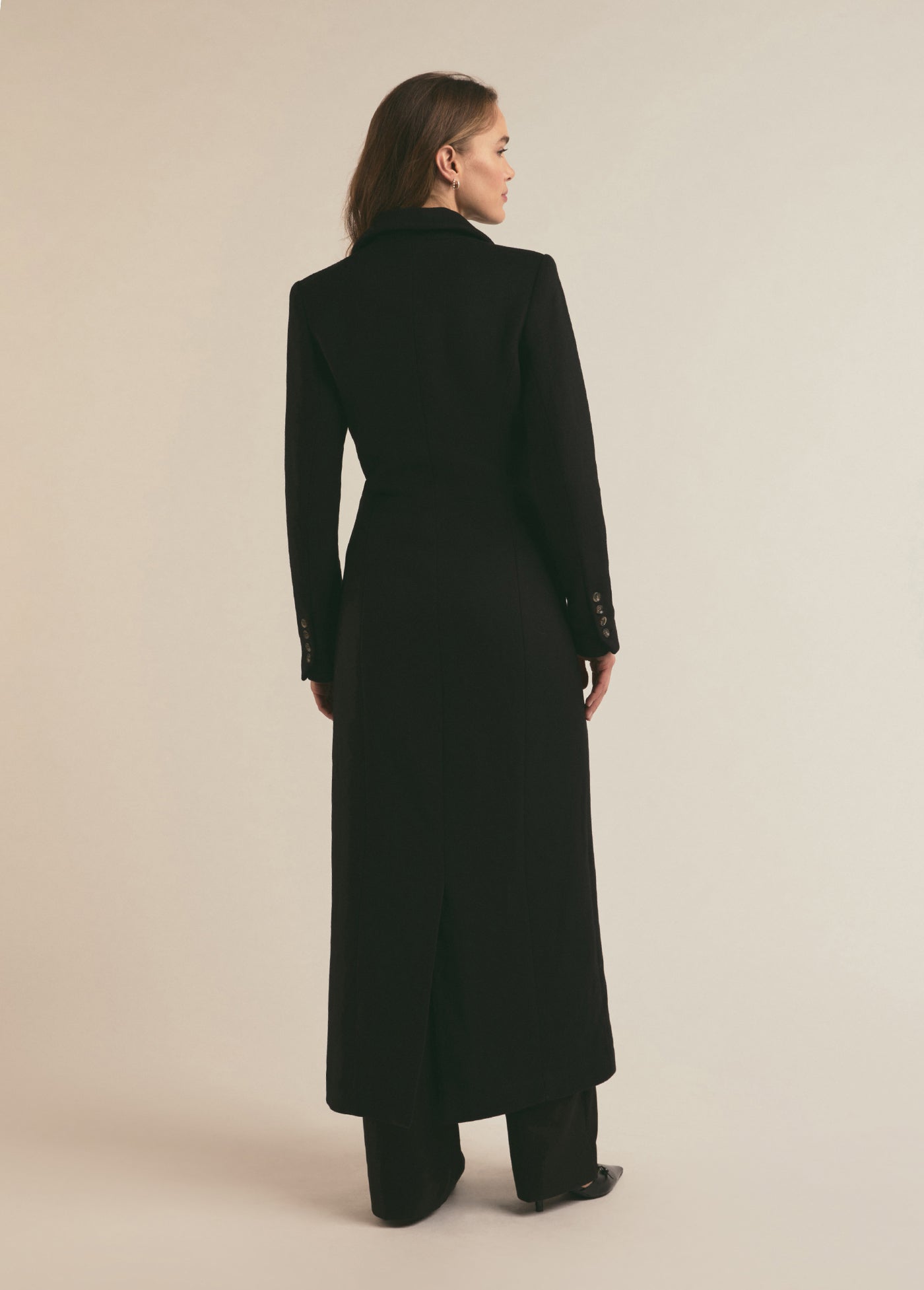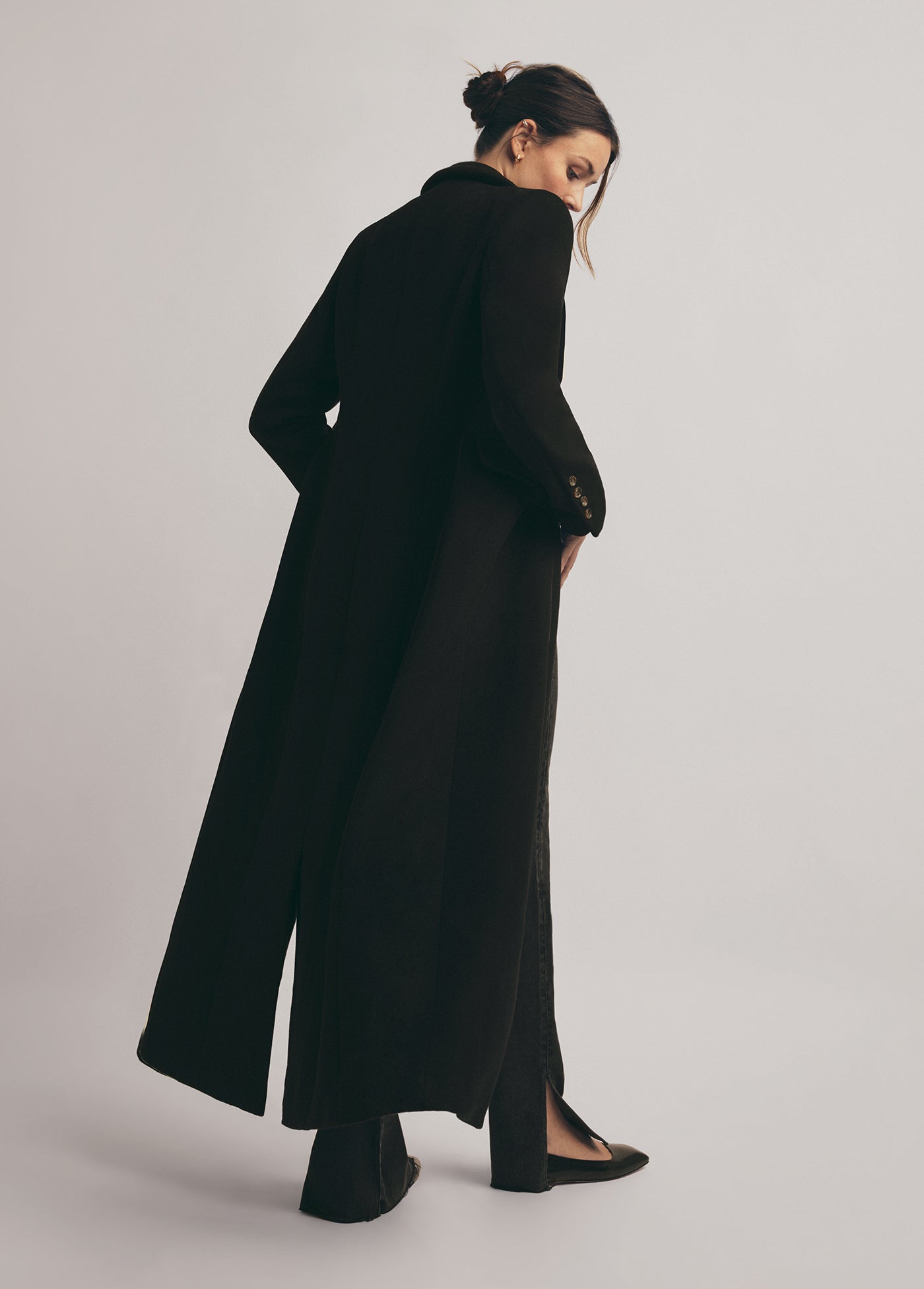 Tailored for winter, the double-breasted Simon Coat is both pretty and practical. The ankle-sweeping style has a slimmer fit cut from a double-faced wool blend with a hint of cashmere. (It’s also fully lined for added warmth.) With front flap pockets and marble buttons, this classic black coat may make winter your favorite season of style.