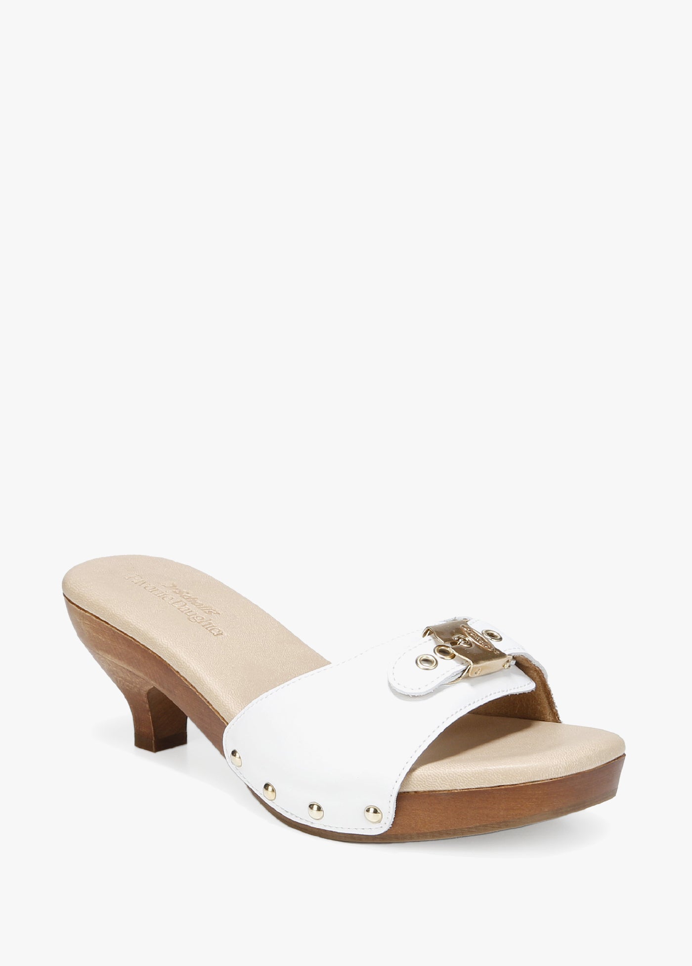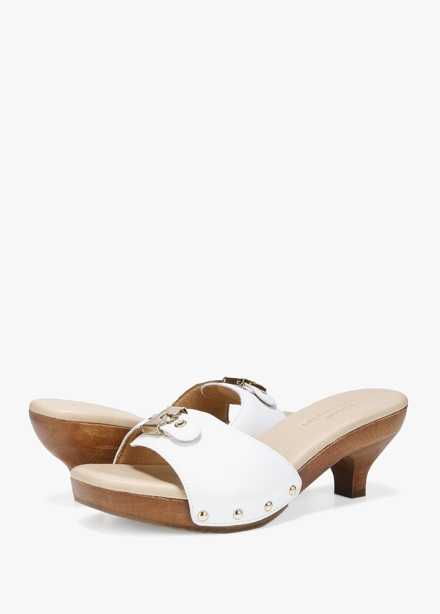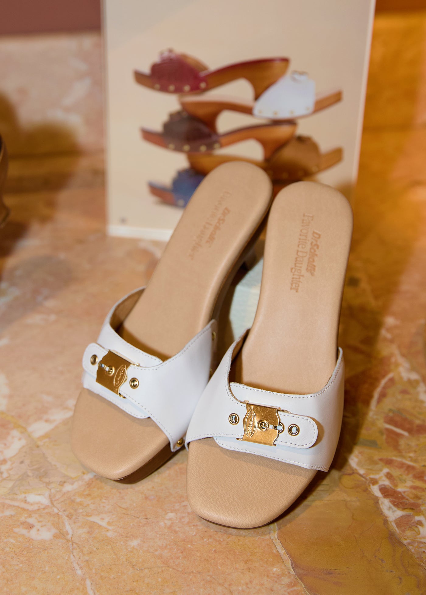 We created a fresh take on our favorite Dr. Scholl's Original Sandal--a walkable kitten heel, polished white leather and all the nostalgic charm we loved growing up (iconic buckle & handmade artisanal wood clog sole). Easy and elevated—just the way we like it.
