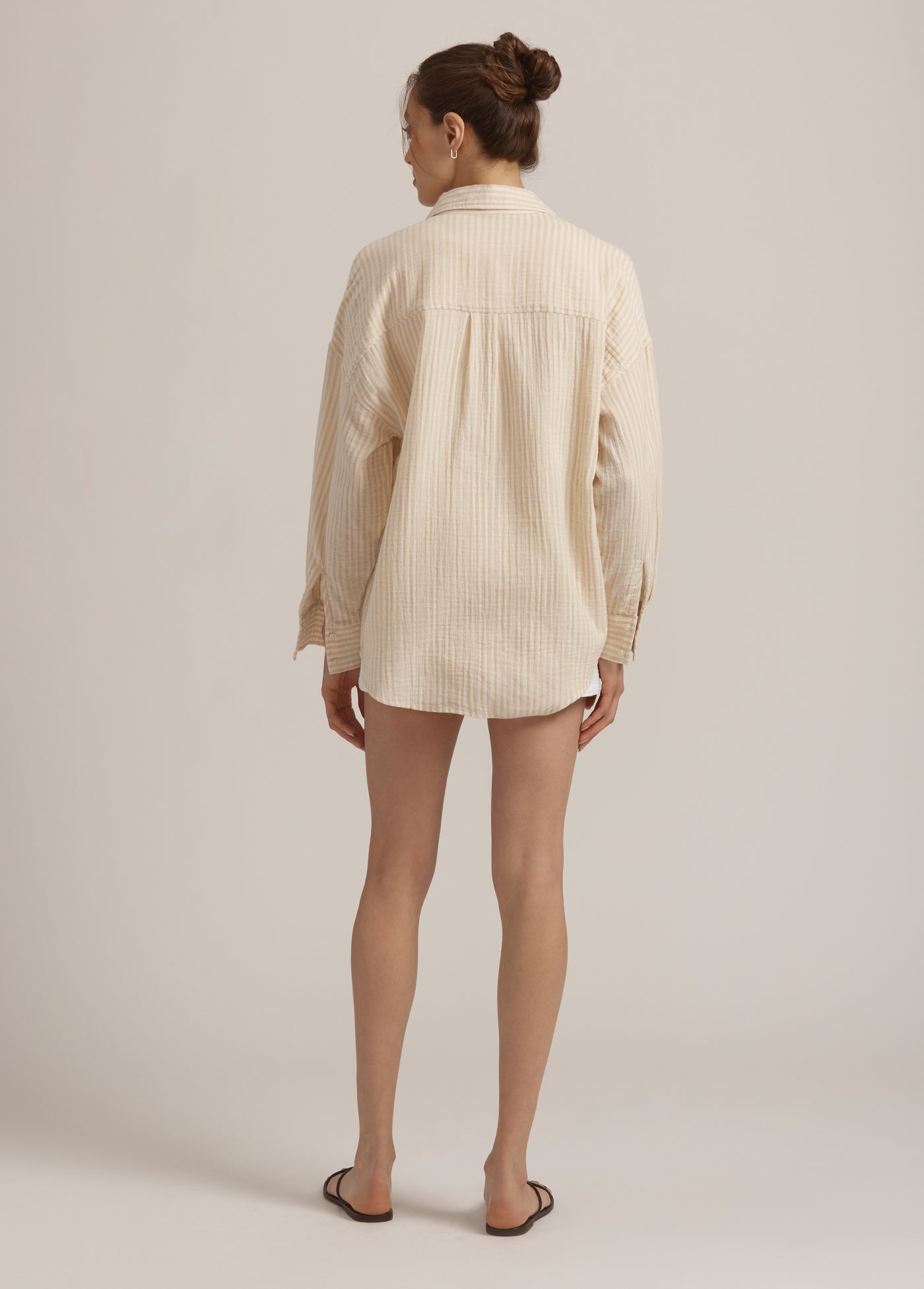 With a relaxed fit and pointed collar, the Ex-Boyfriend Shirt is an oversized button up cut from a lightweight gauze, perfect for breezy summer days. Our favorite way to wear this shirt is, actually, any way–tied, tucked, half-tucked, and unbuttoned with the coordinating Beach Walk Pant.