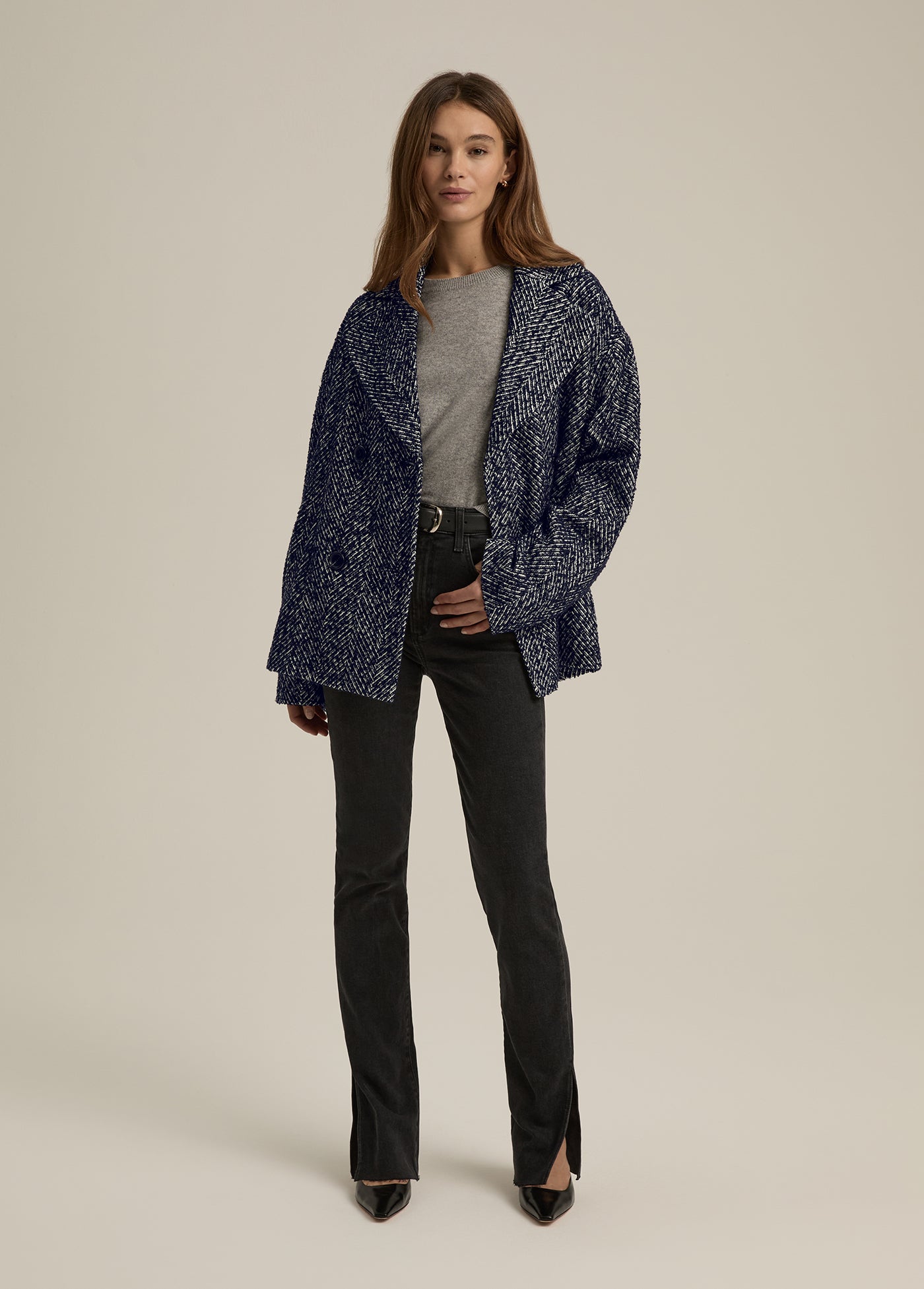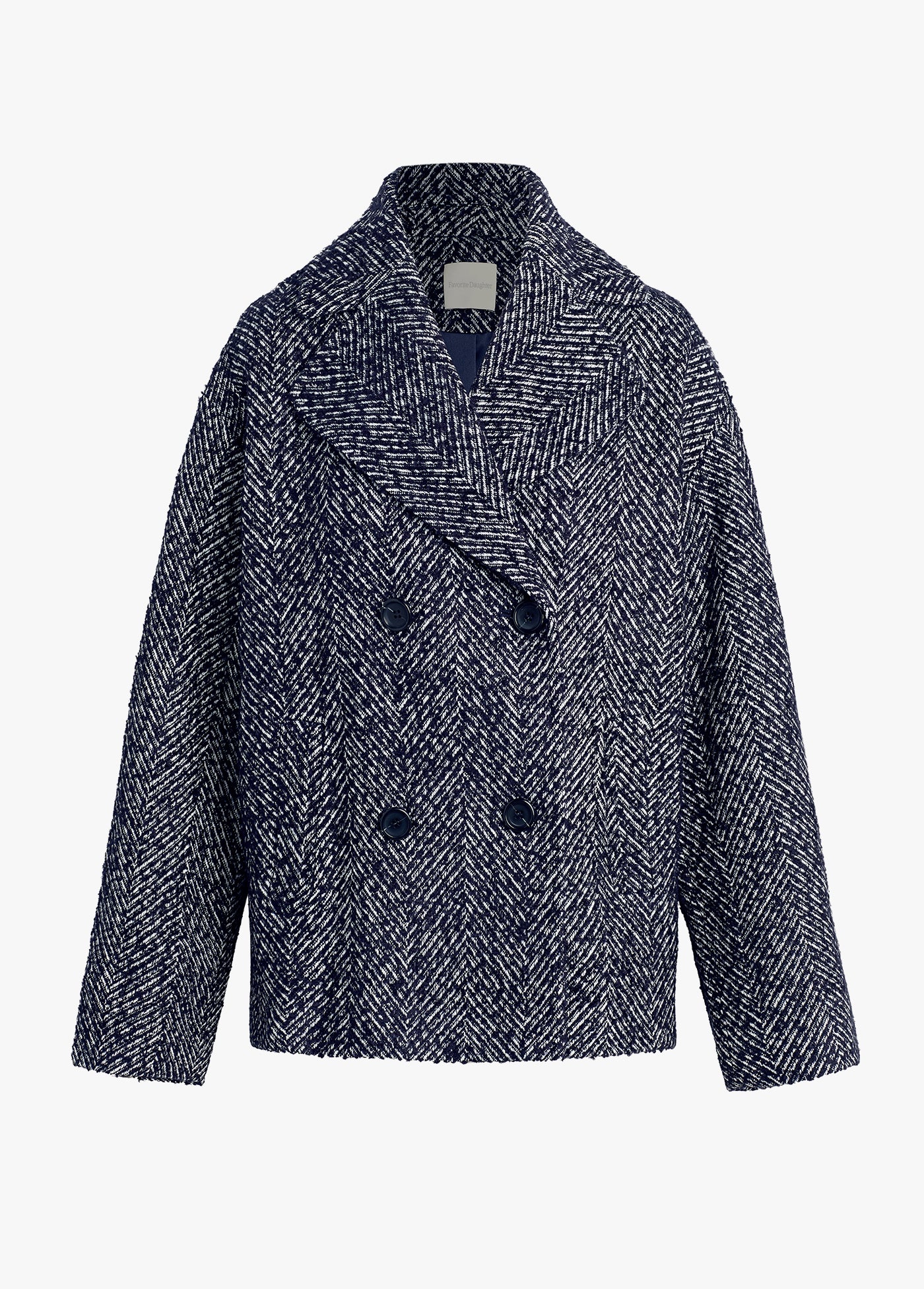 Crafted from navy herringbone, The Favorite Peacoat features a relaxed fit with classic double-breasted styling and dropped shoulders. A timeless favorite you’ll reach for season after season.