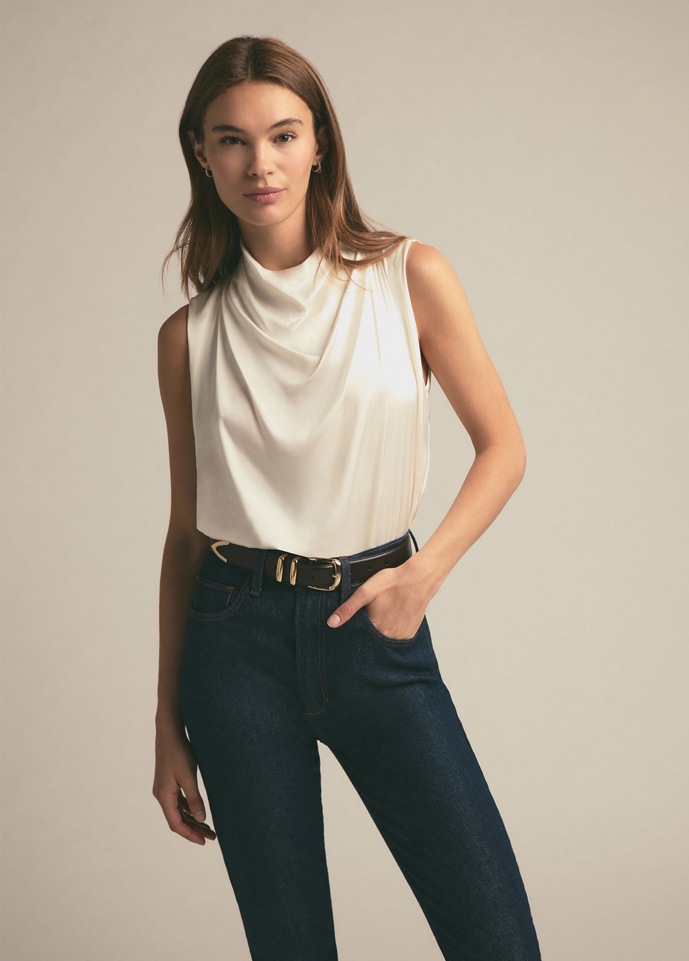 The Alice Top, cut from a comfort viscose blend, is a favorite on its own and looks especially great when paired with a blazer. Slim fit, sleeveless styling and the perfect amount of drape detailing.