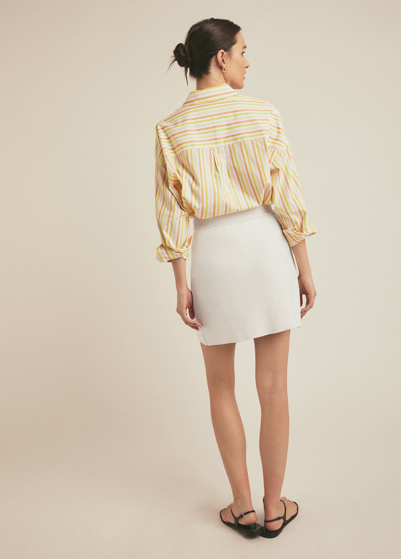 A true classic. Our new A-line mini with pull-on styling and a comfortable elastic waistband is cut from a structured cotton-comfort blend in an ivory knit pattern that looks so chic when paired with The Annabel Jacket (in matching ivory or our seasonal navy stripe).