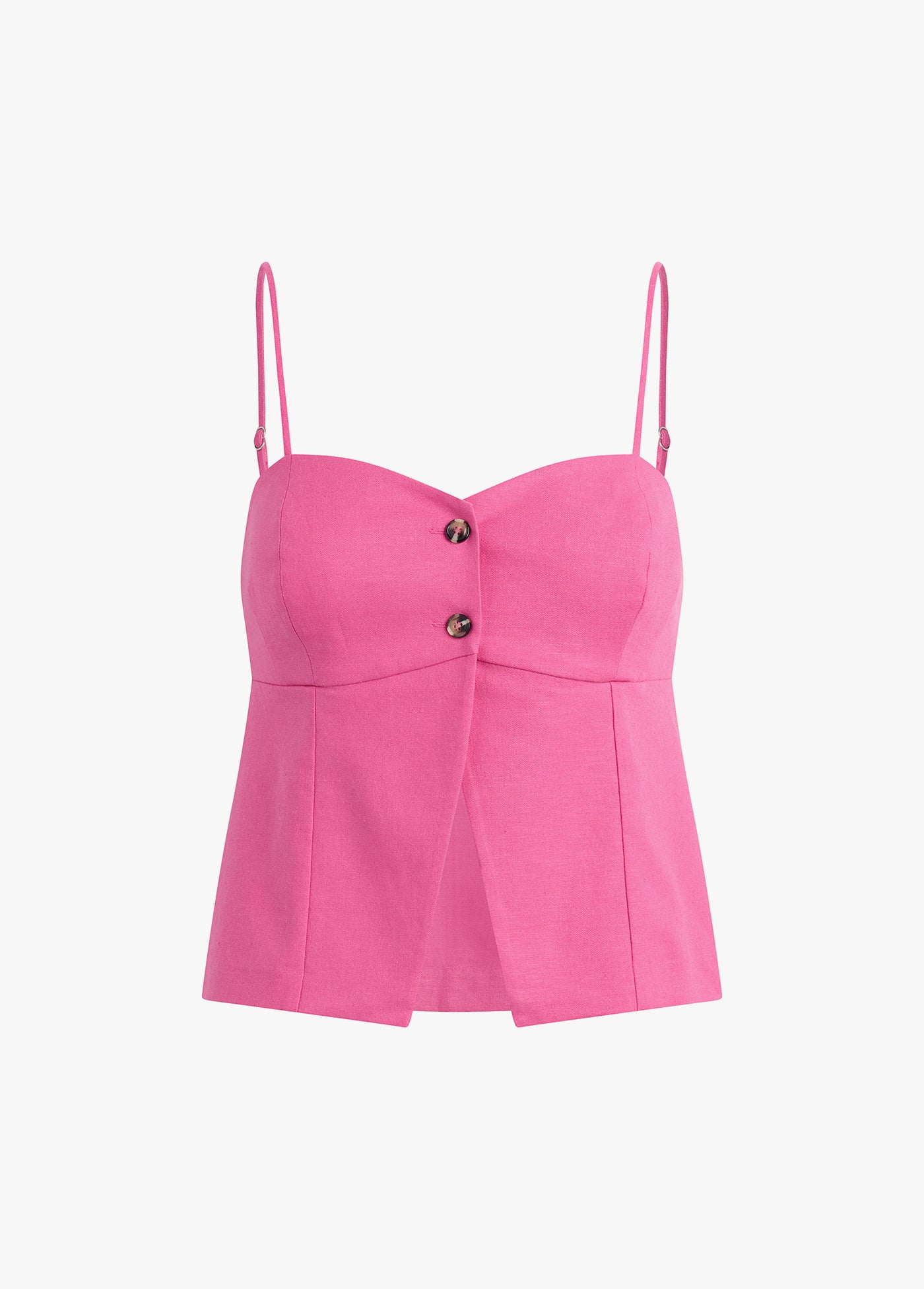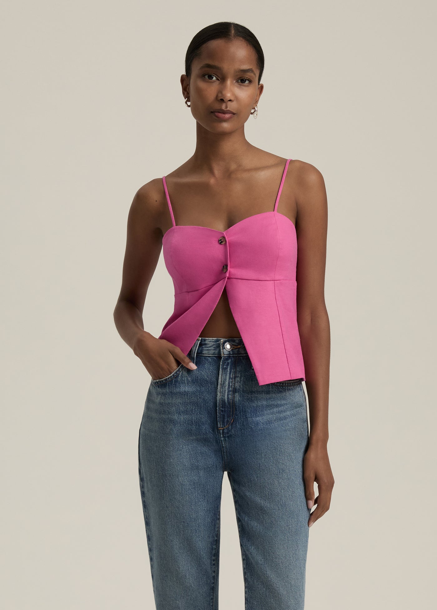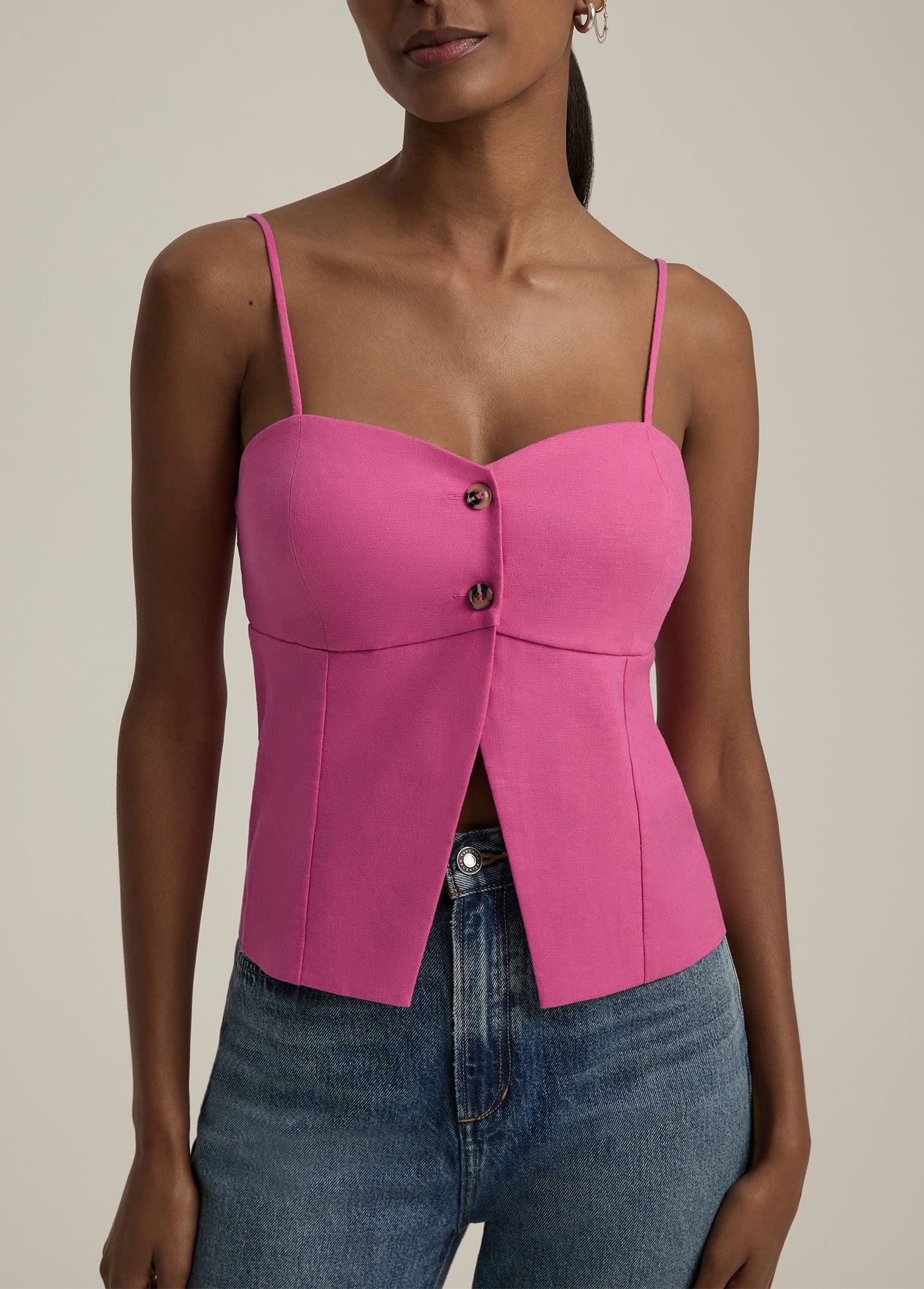 Nothing says sunny like a little strappy top. Cut from a comfortable linen blend with adjustable spaghetti straps, The Bea Top is detailed with faux horn front buttons and back smocking detail to create a slim fit. Pair it with your favorite denim, shorts or a midi skirt for an effortless warm weather look.