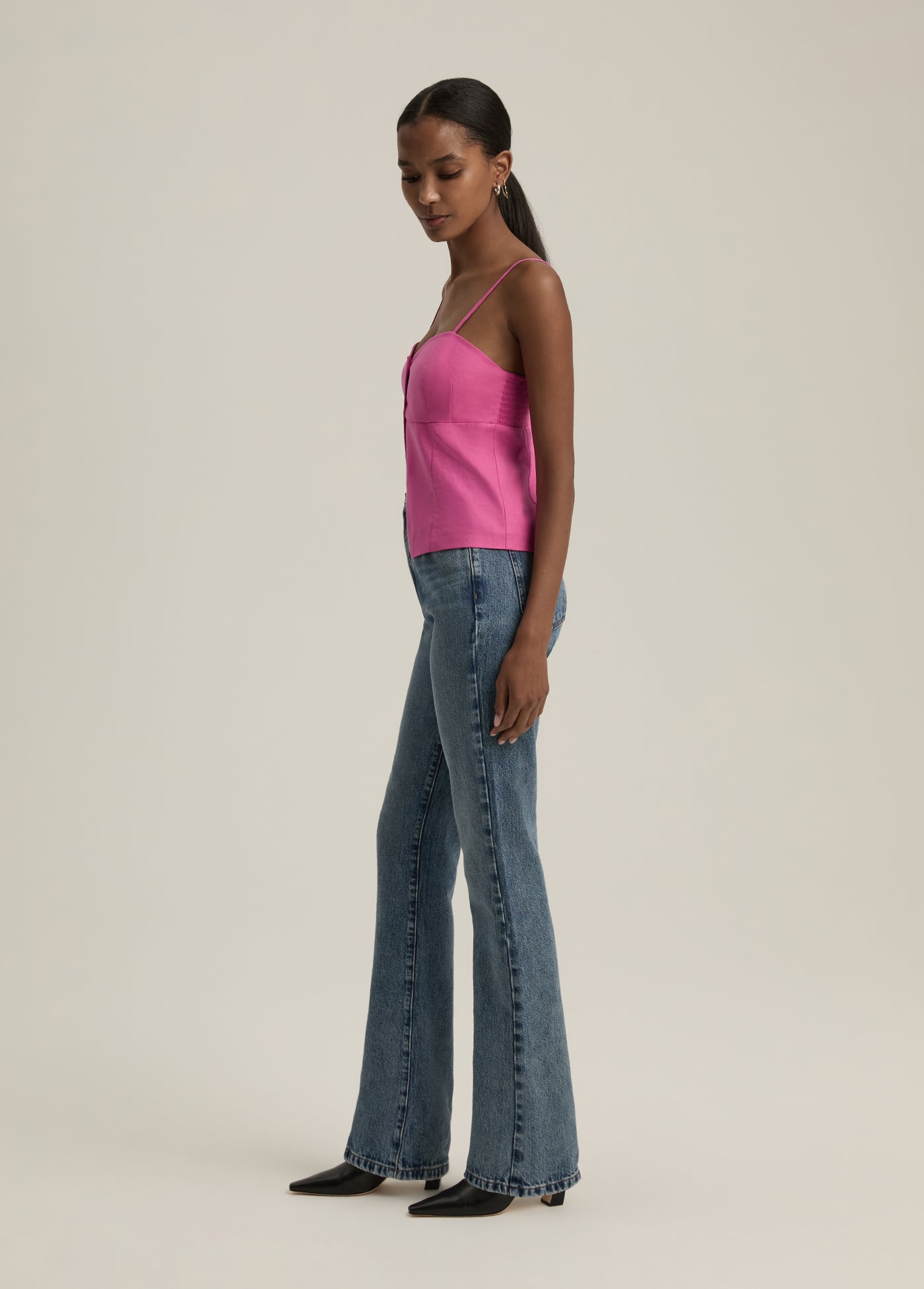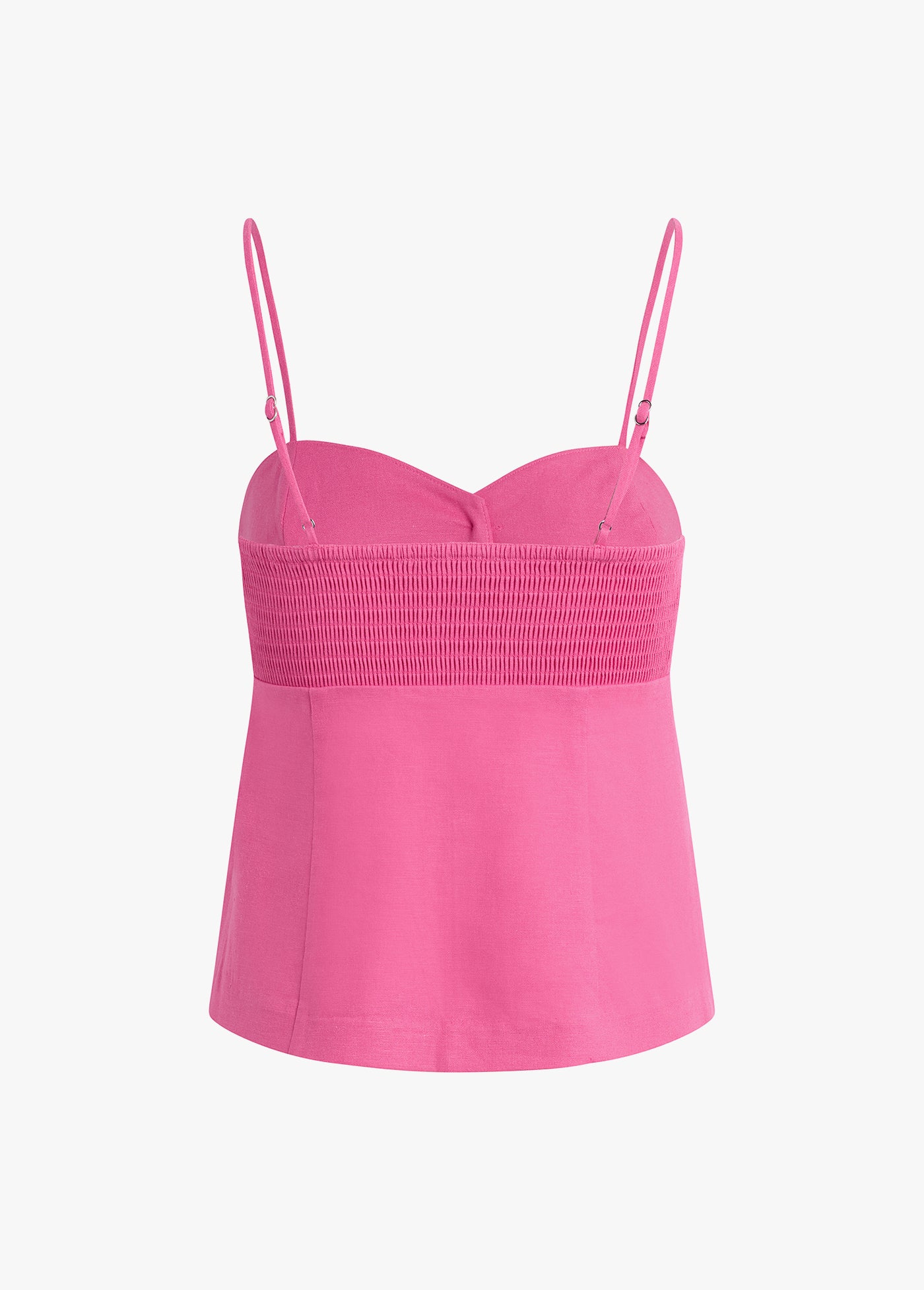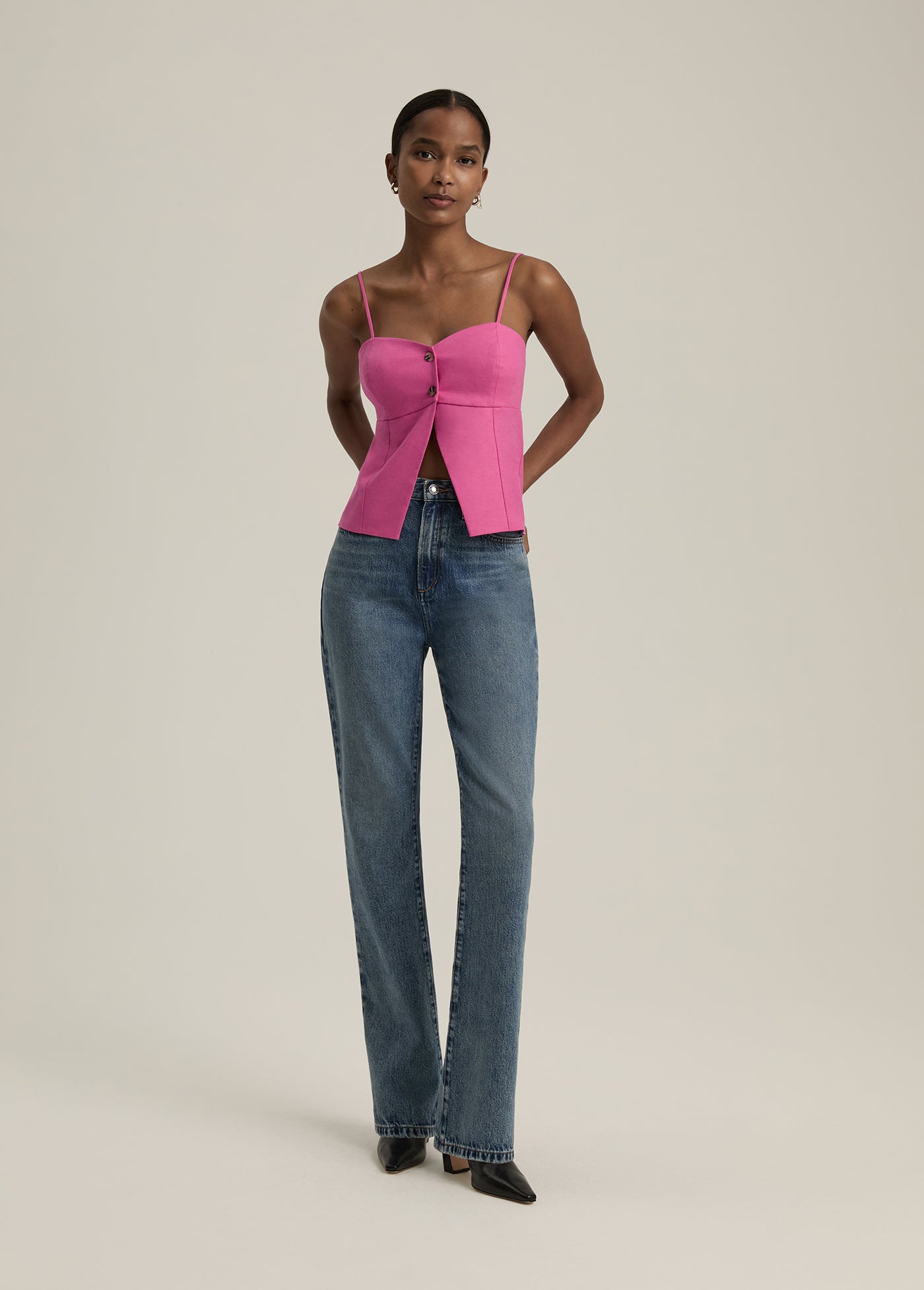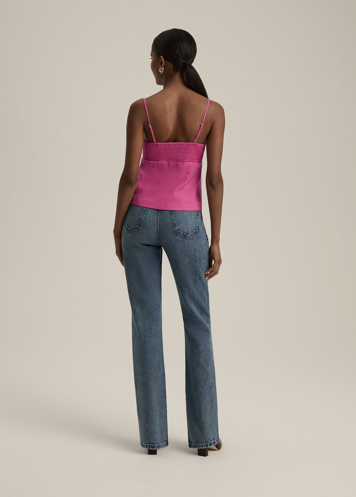 Nothing says sunny like a little strappy top. Cut from a comfortable linen blend with adjustable spaghetti straps, The Bea Top is detailed with faux horn front buttons and back smocking detail to create a slim fit. Pair it with your favorite denim, shorts or a midi skirt for an effortless warm weather look.