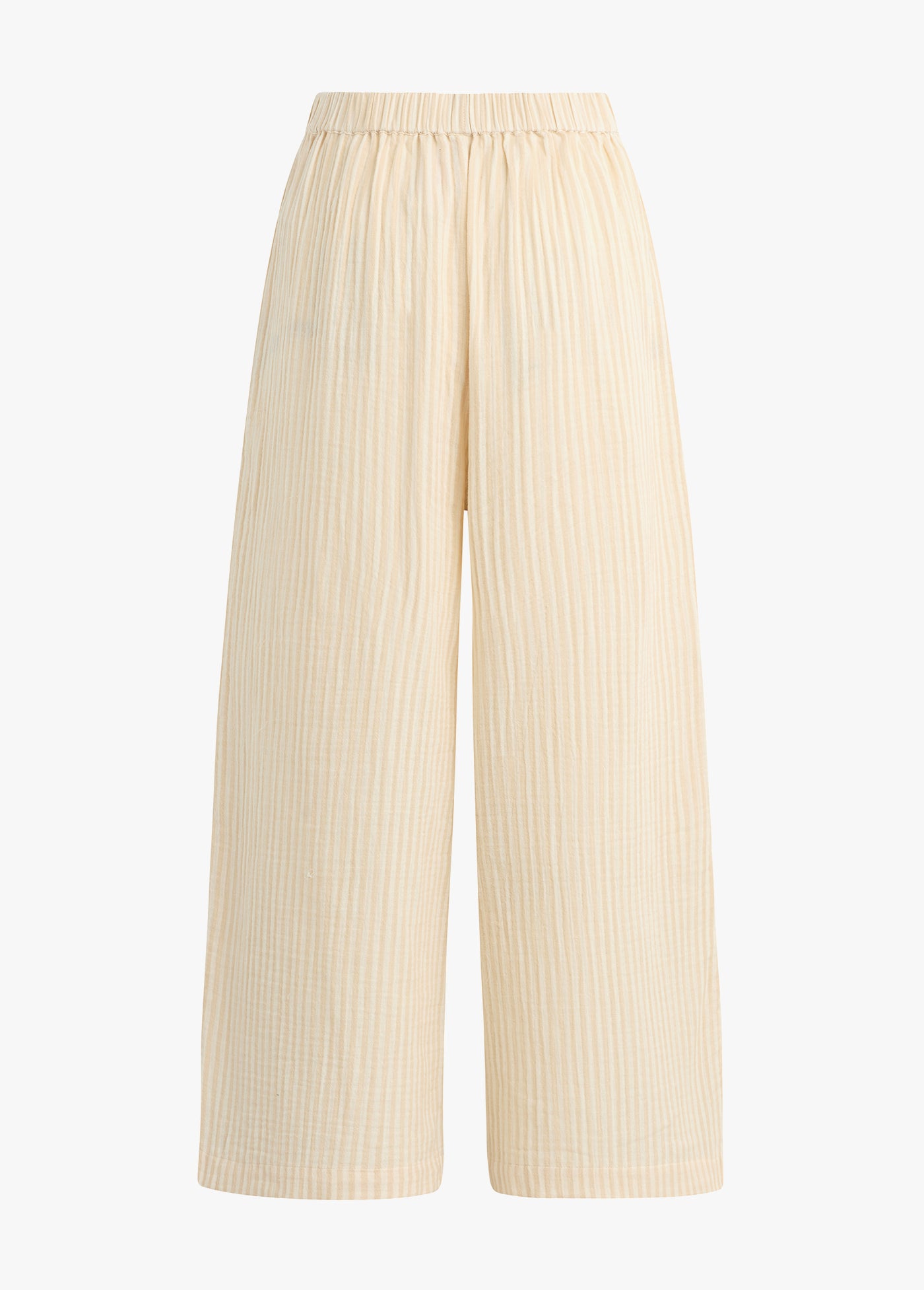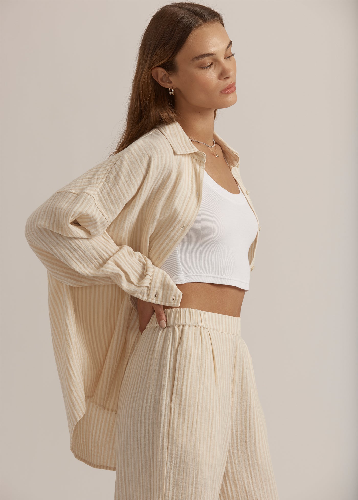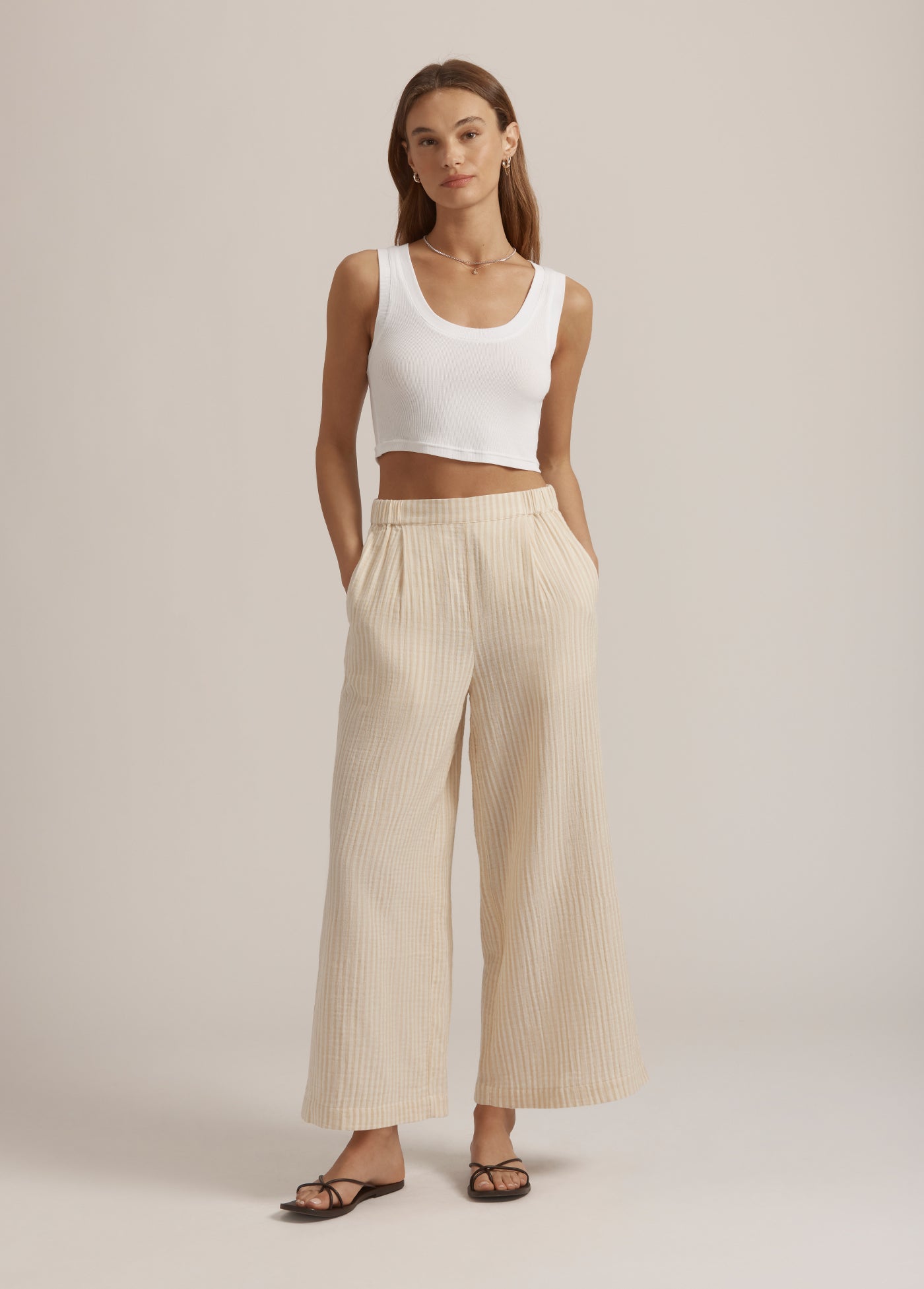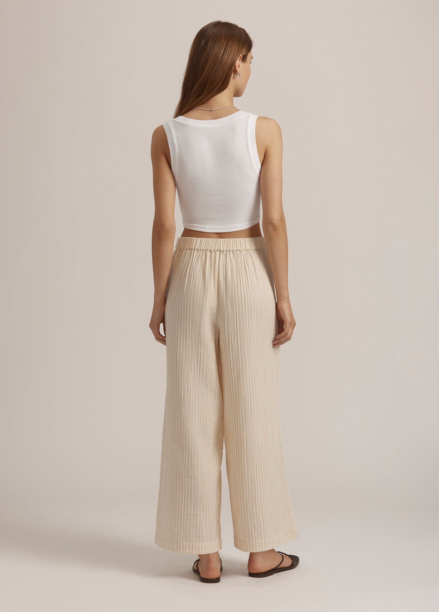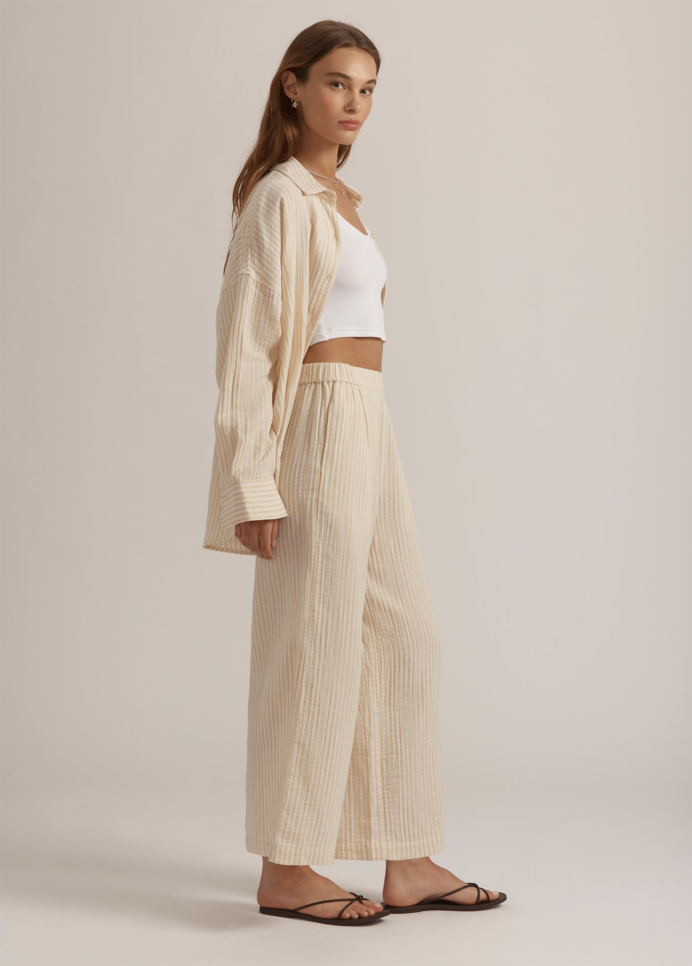 Perfect for those days with your toes in the sand. The Beach Walk Pant is made from lightweight gauze with a 12.75" rise, 26.5" inseam and a relaxed, wide-leg fit. Featuring side pockets, a clean front waistband (& comfy back elastic), these pants make a favorite sun-kissed set when paired with the matching Ex-Boyfriend Shirt.