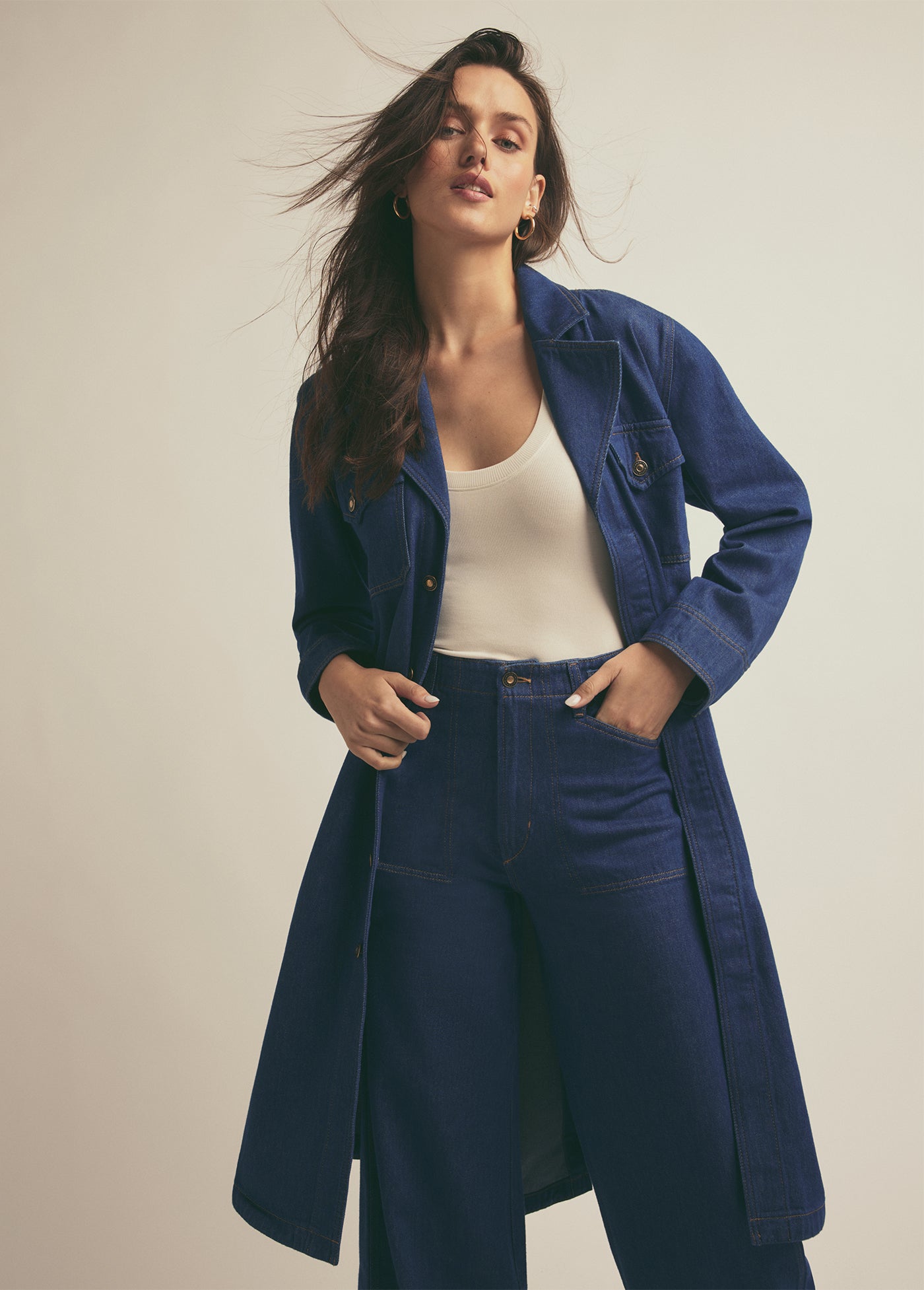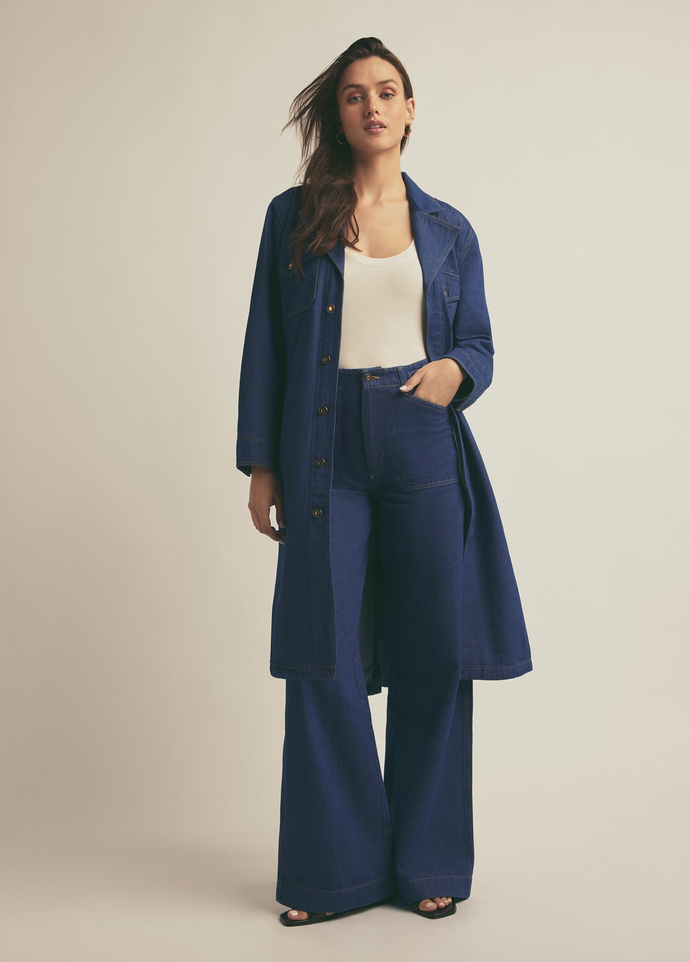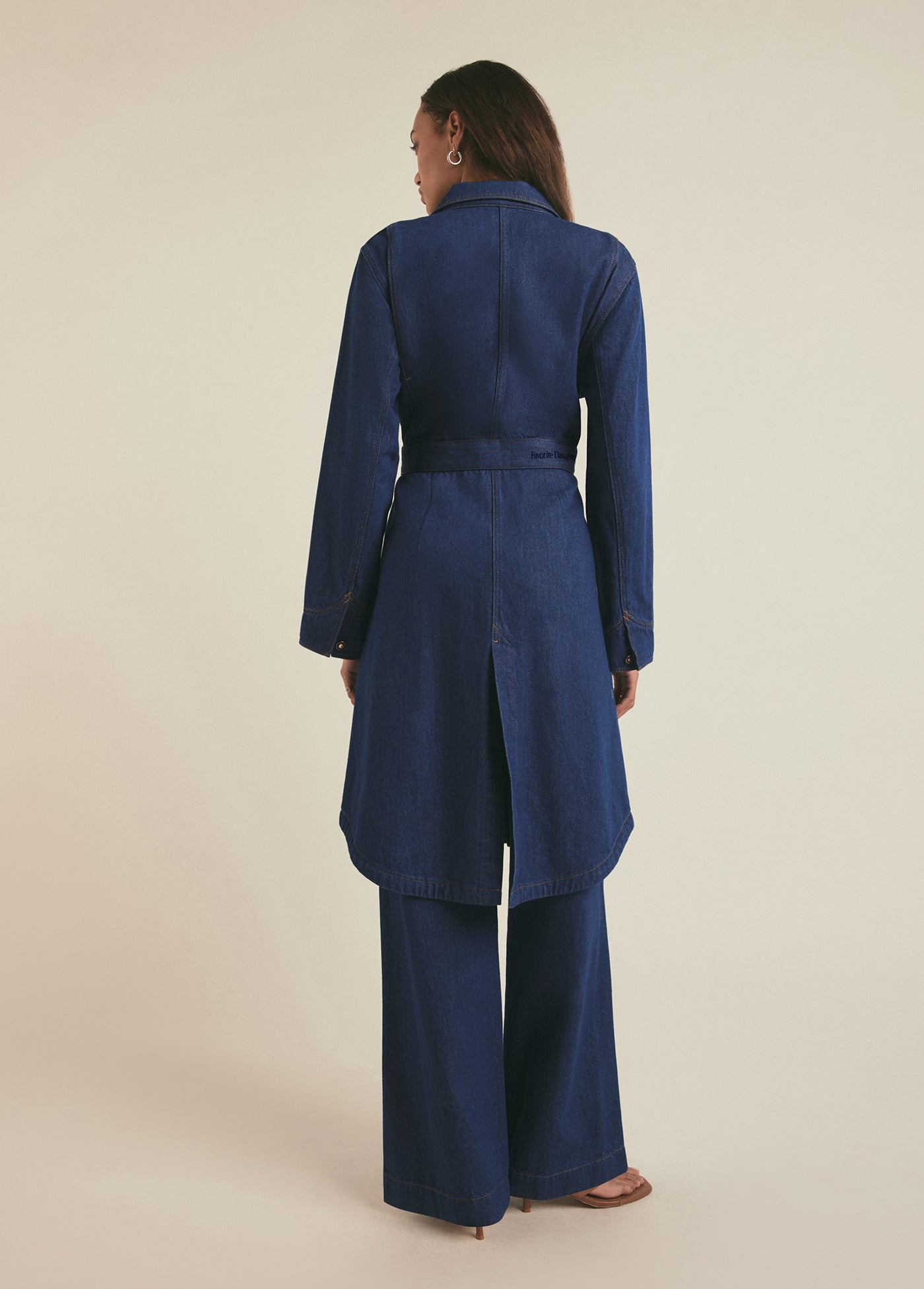 Our new take on the trench. Cut from dark-medium blue rigid denim just gets better over time, The Boulevard Trench has a drop shoulder and attached belt to cinch at the waist. With a fitted cut, this overcoat is styled with a pointed lapel collar, high-low hem, back kick pleat and front patch pockets. Our favorite way to style it (besides wearing it over everything) is with The Fancy Mischa Wide Leg in the matching Rome wash.