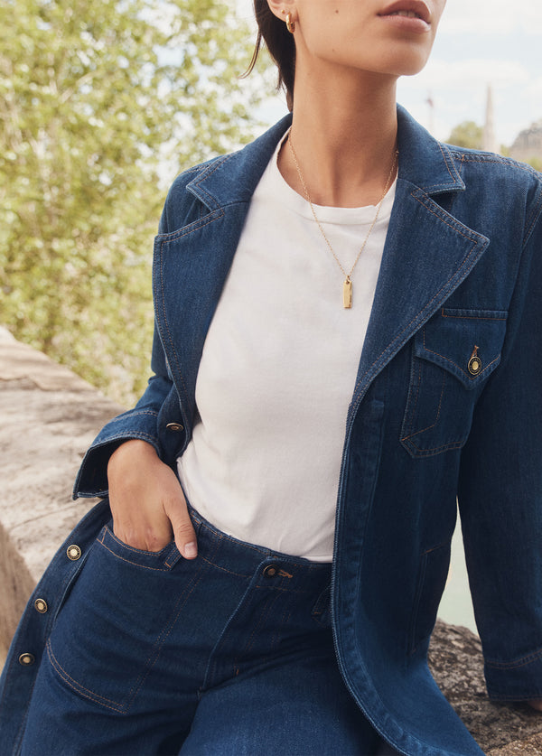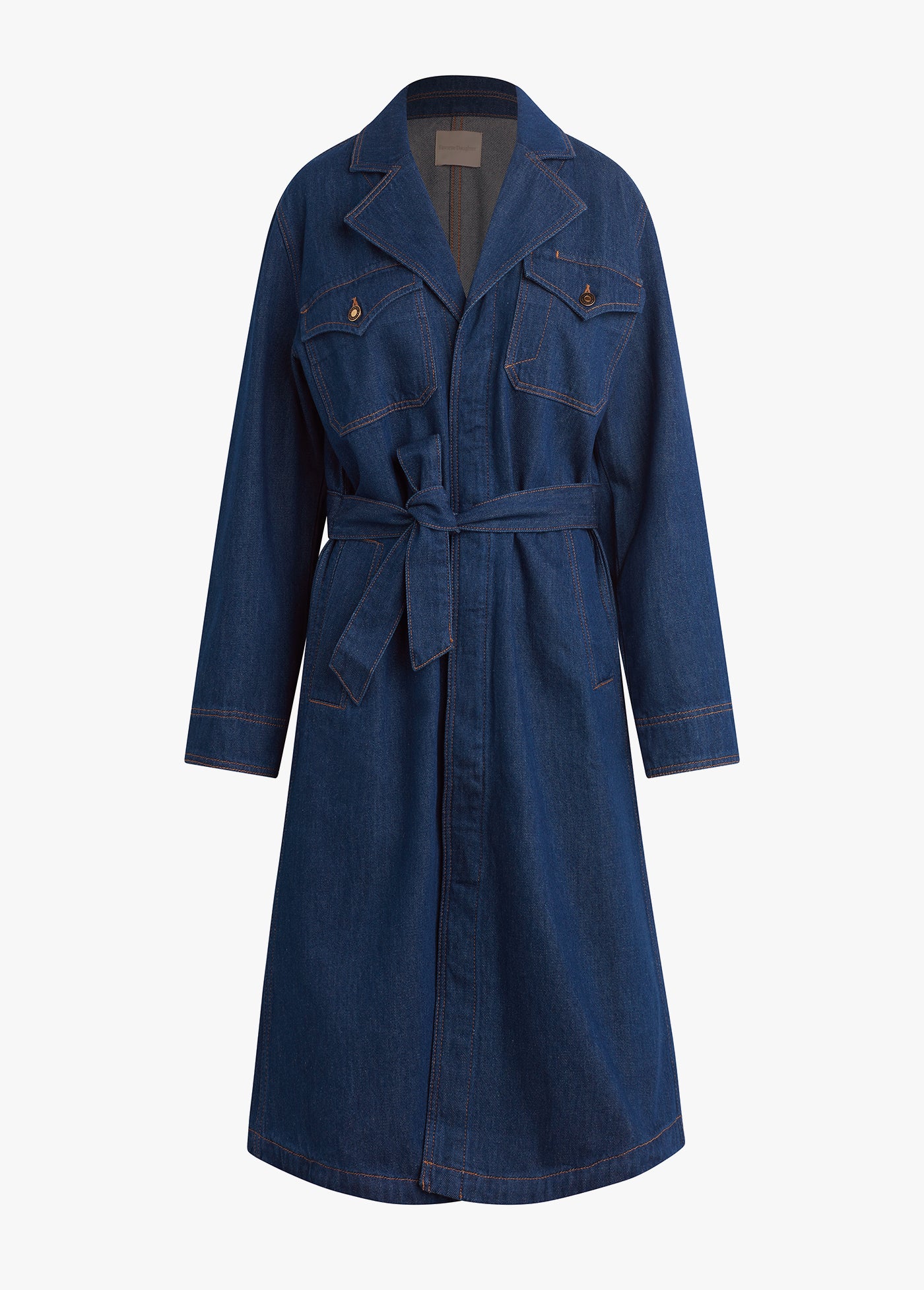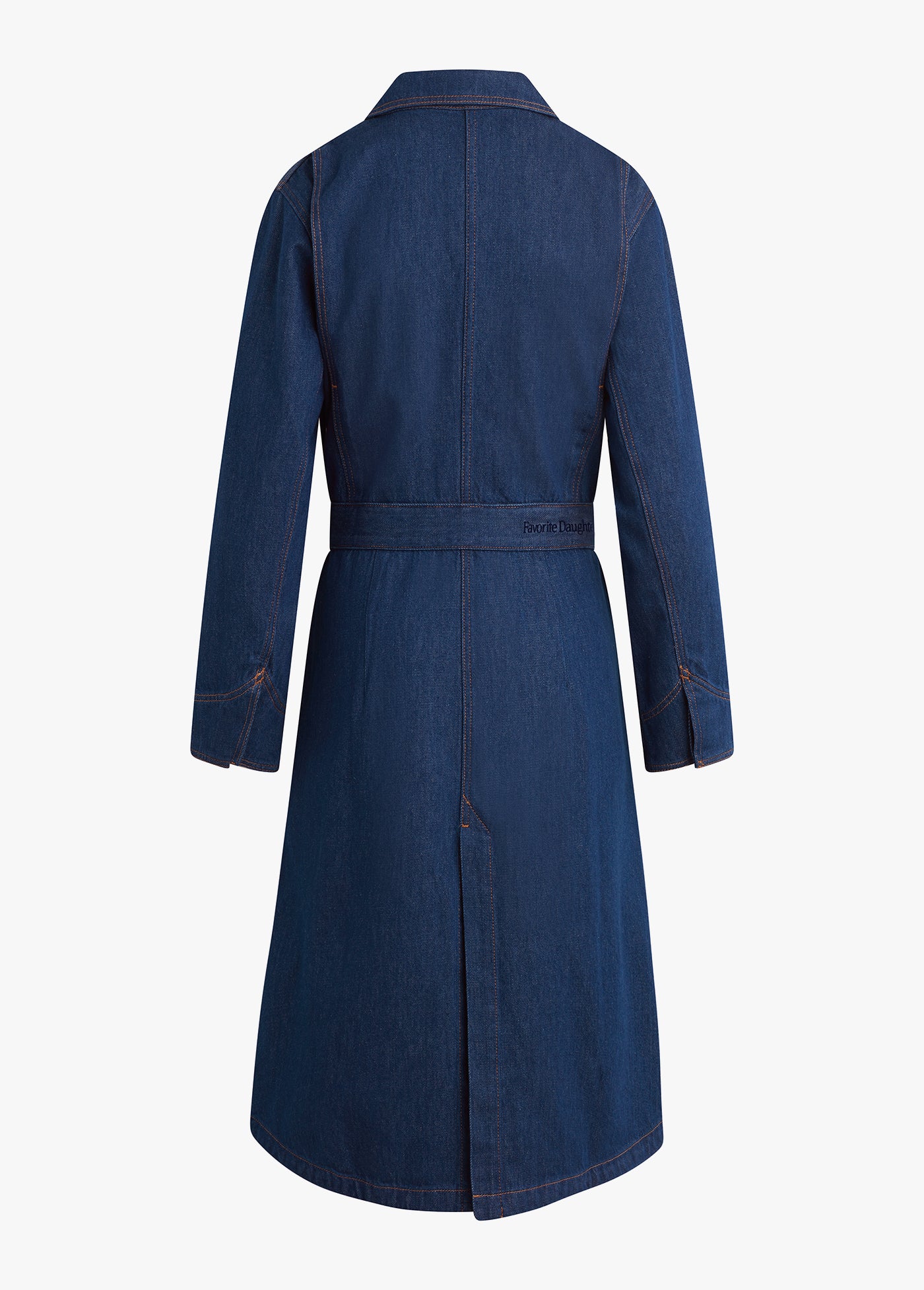 Our new take on the trench. Cut from dark-medium blue rigid denim just gets better over time, The Boulevard Trench has a drop shoulder and attached belt to cinch at the waist. With a fitted cut, this overcoat is styled with a pointed lapel collar, high-low hem, back kick pleat and front patch pockets. Our favorite way to style it (besides wearing it over everything) is with The Fancy Mischa Wide Leg in the matching Rome wash.