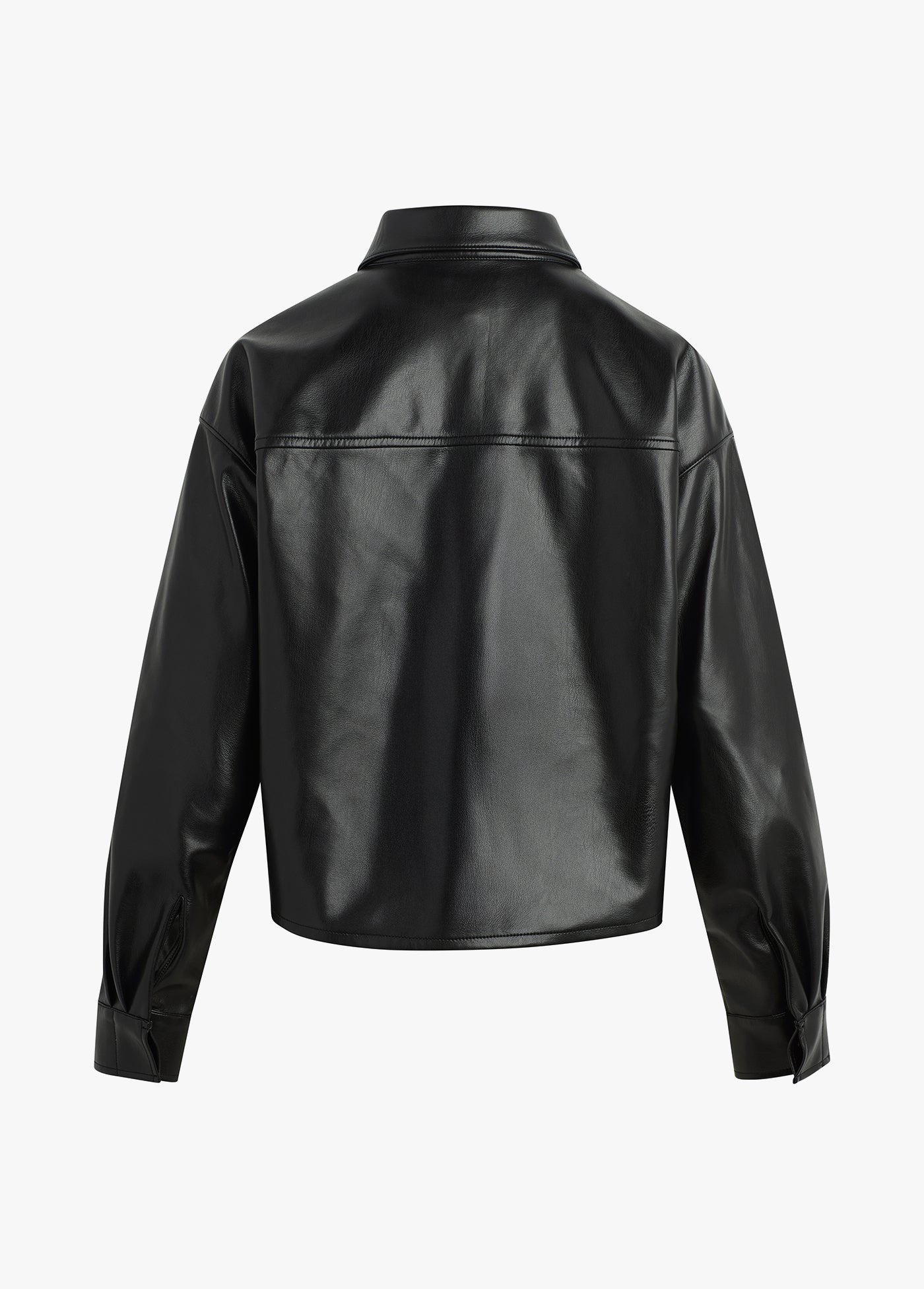 The Brady Crop Shirt in vegan leather is designed for a loose, oversized fit that hits just below the waist for the perfect untucked look. Pointed collar, hidden front buttons and dropped shoulders are standout features.