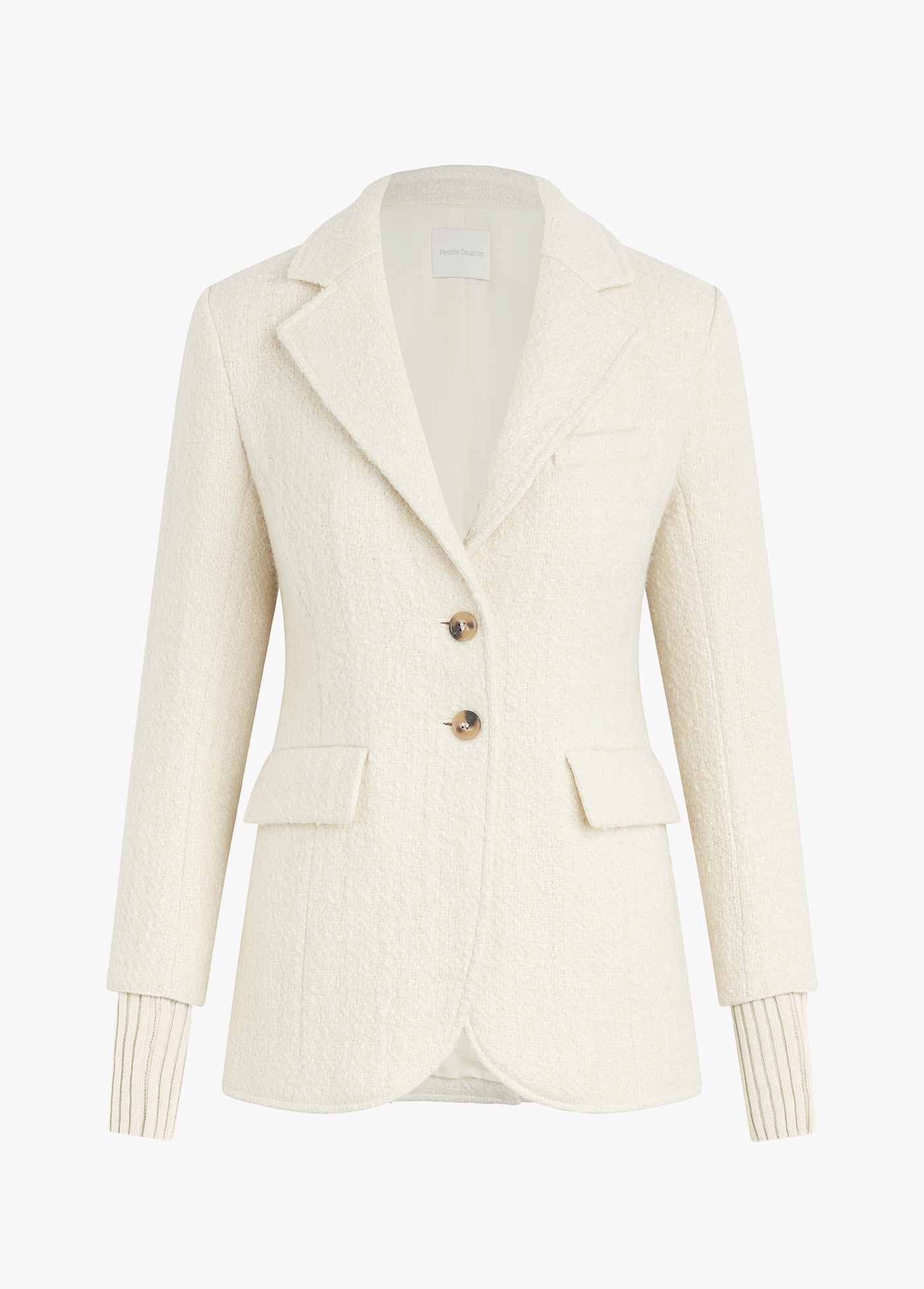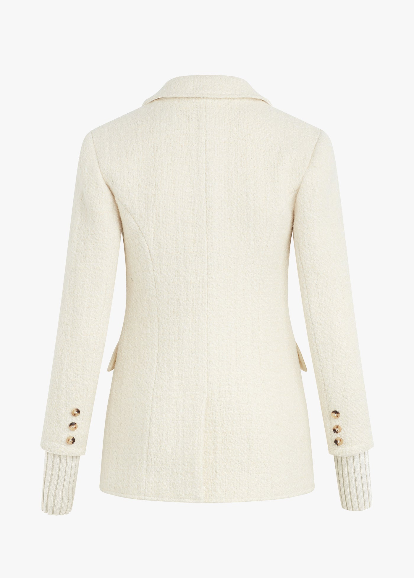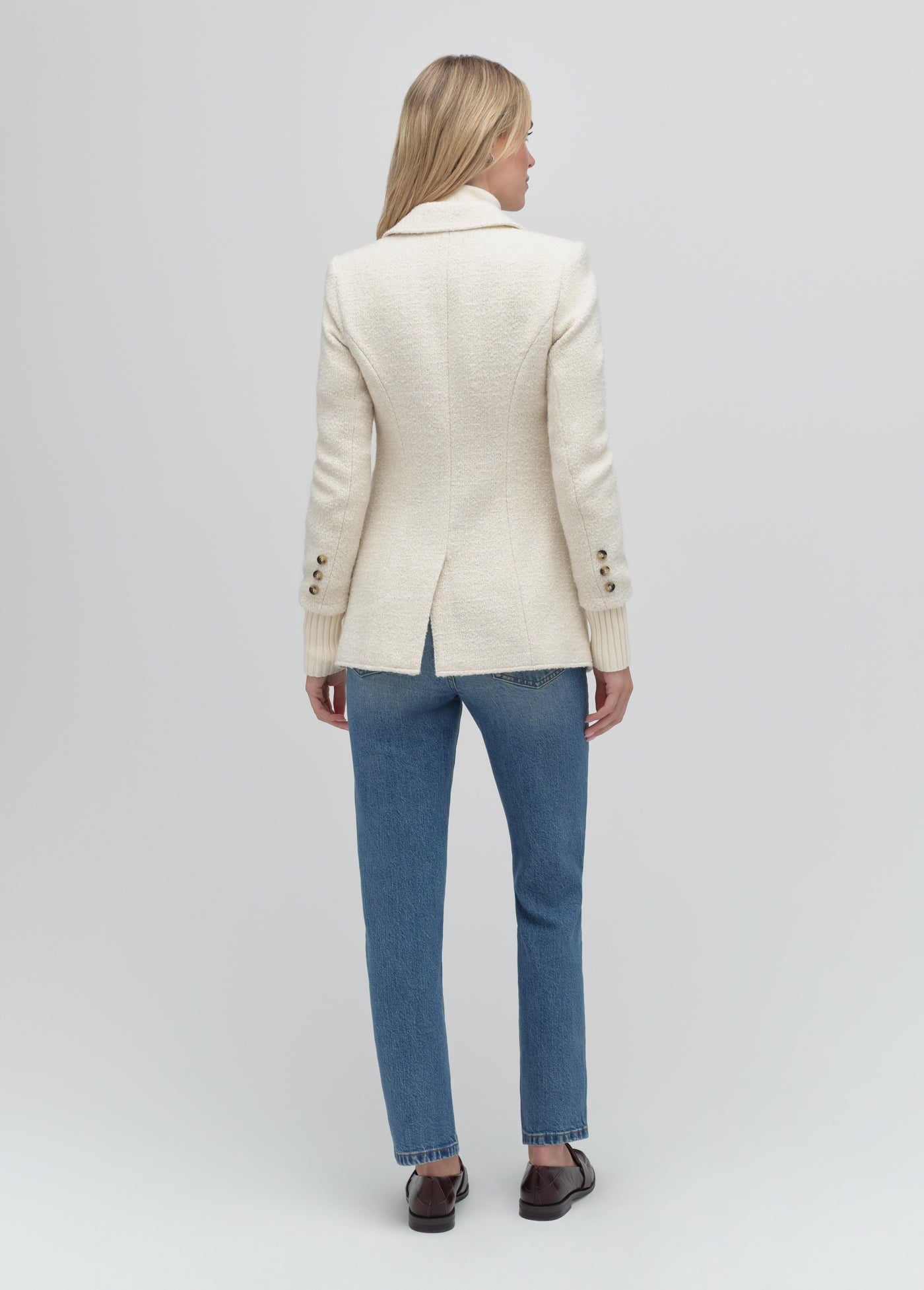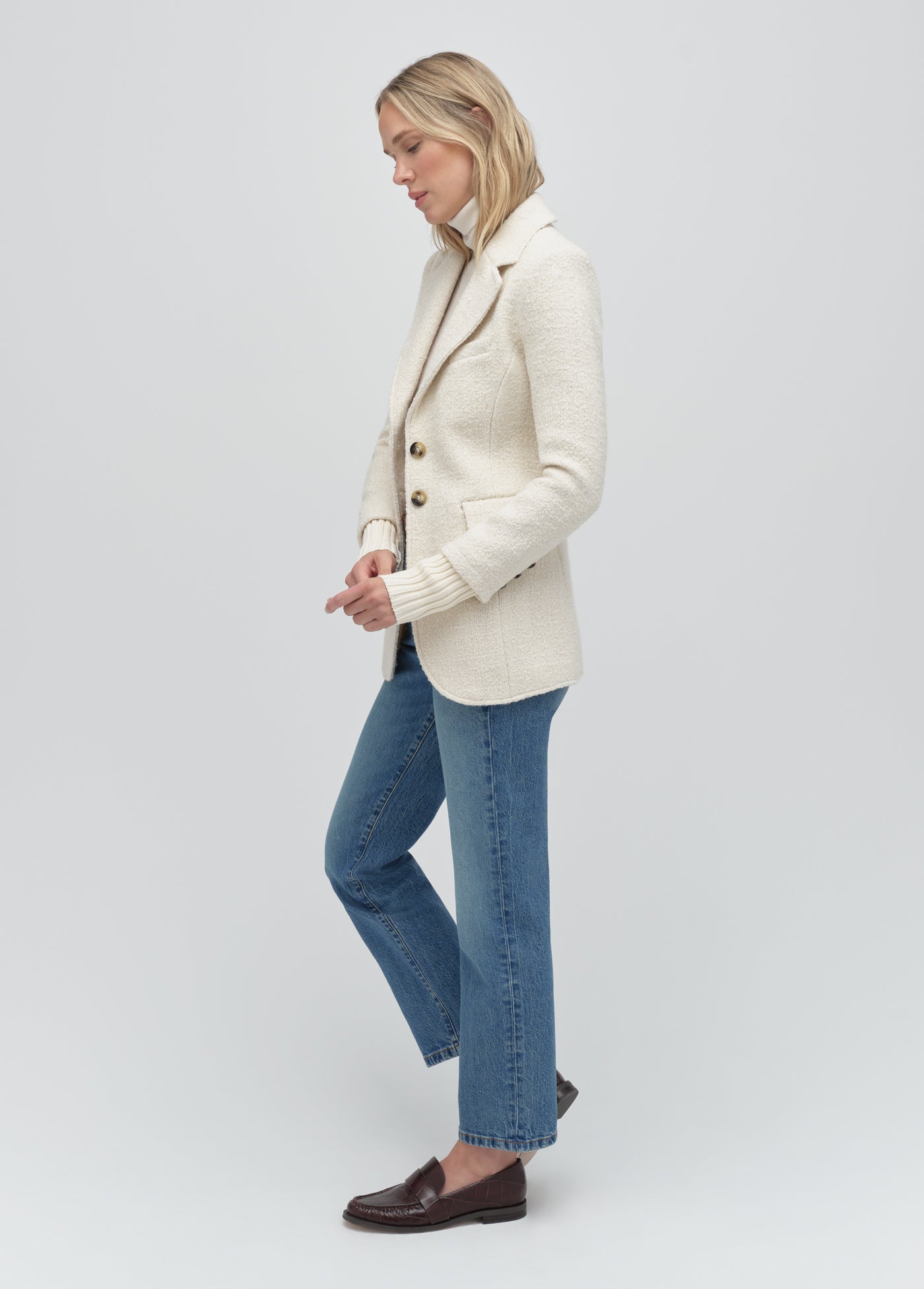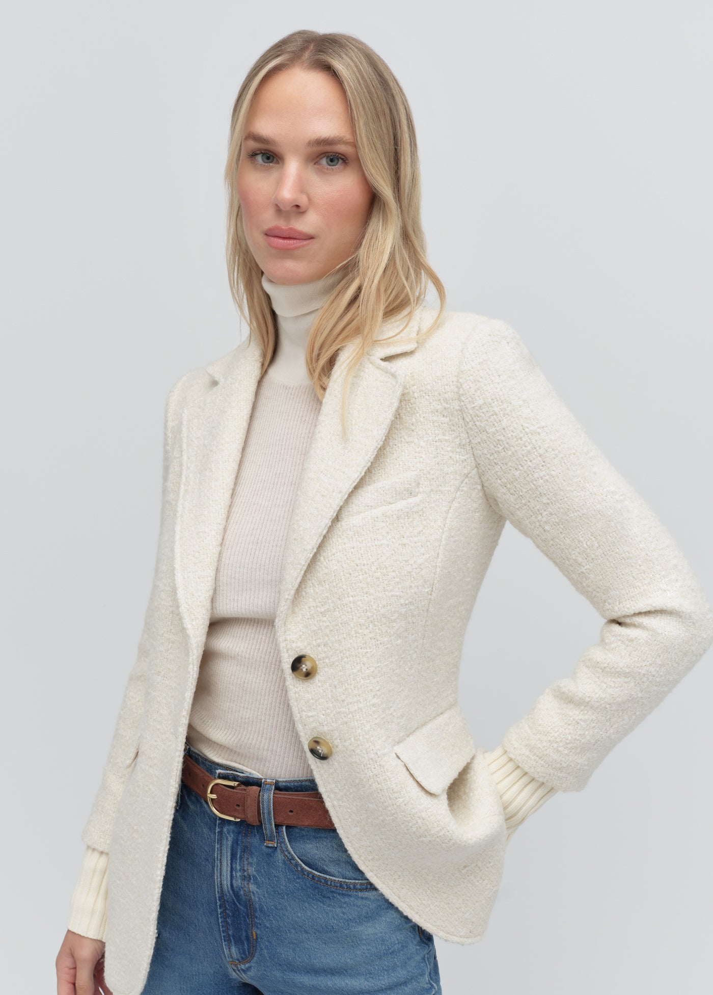 When your runway is a city sidewalk, grab this slim fit, wool-blend blazer. There are faux horn buttons, front flap pockets, delicate stitching details along with a luxe boucle wool-blend added texture. Our favorite part is the cotton-cashmere ribbed cuffs for when walking to work is your very own fashion show.