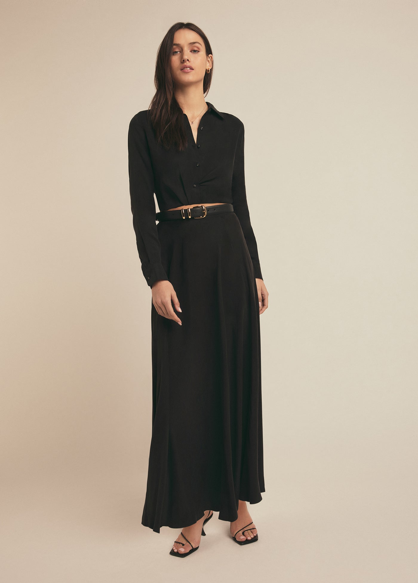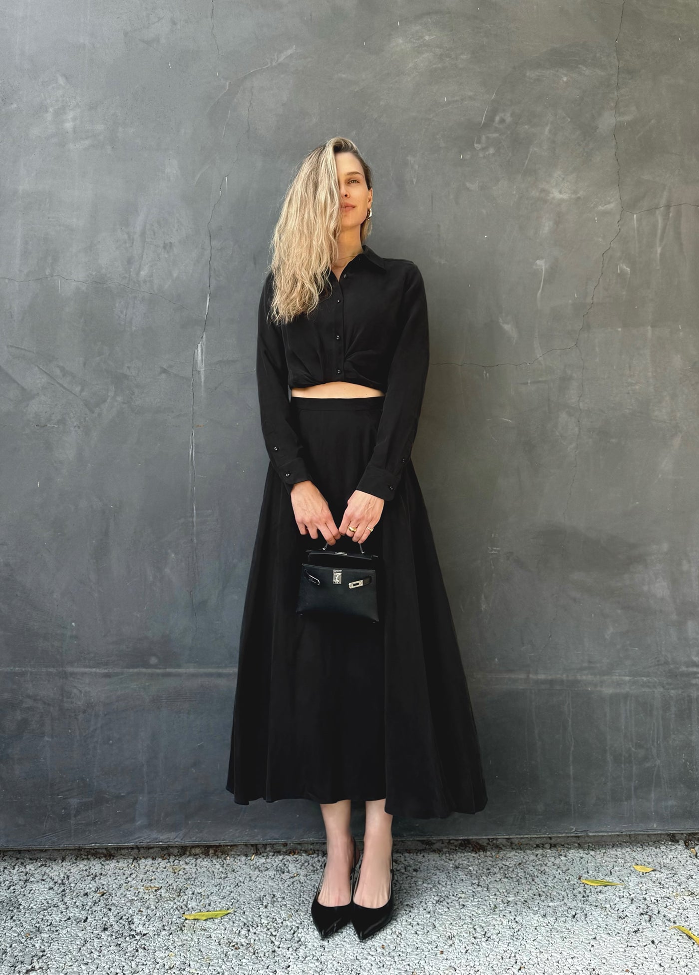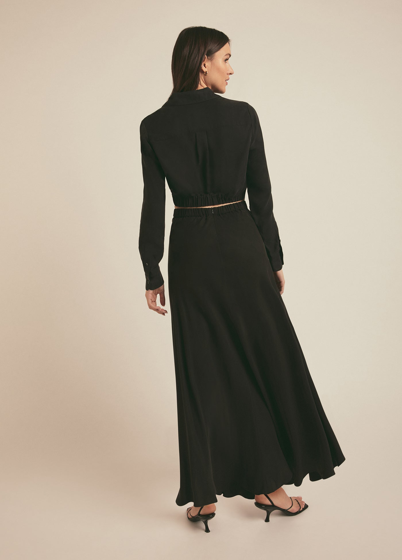 Your favorite midi is here. The skirt that you'll wear all year, every year. The Classic Skirt sits high on the waist with a back elastic with a flared panel for a perfectly-flattering silhouette. And since it's cut from a soft, breathable cupro-blend in black, it has a luxe touch and silky-smooth texture.
