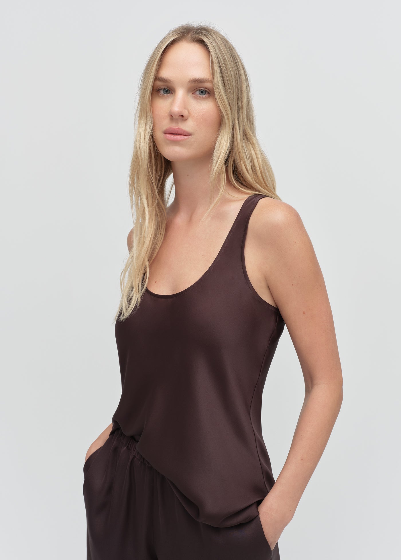 The Clean Cut Tank is all about clean lines and effortless style. Silky satin with a deep U-neck that looks just as good under a blazer as it does on its own.