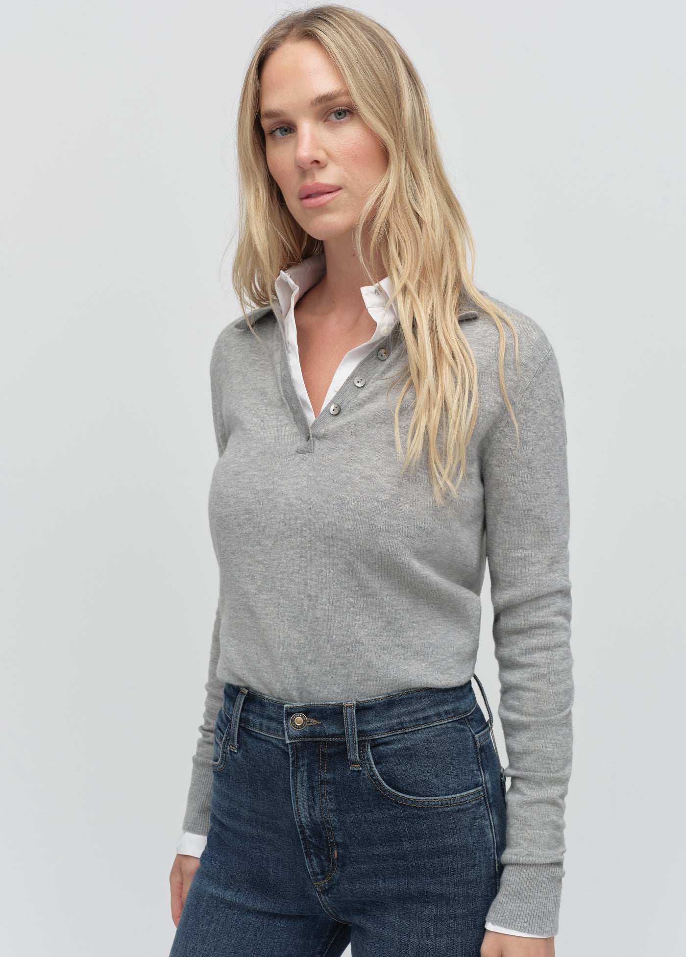 A classic polo sweater that feels like a favorite from day one. The Cleo Top, cut from a soft merino-cashmere blend, has long sleeves, a pointed collar, button placket and an easy fit.