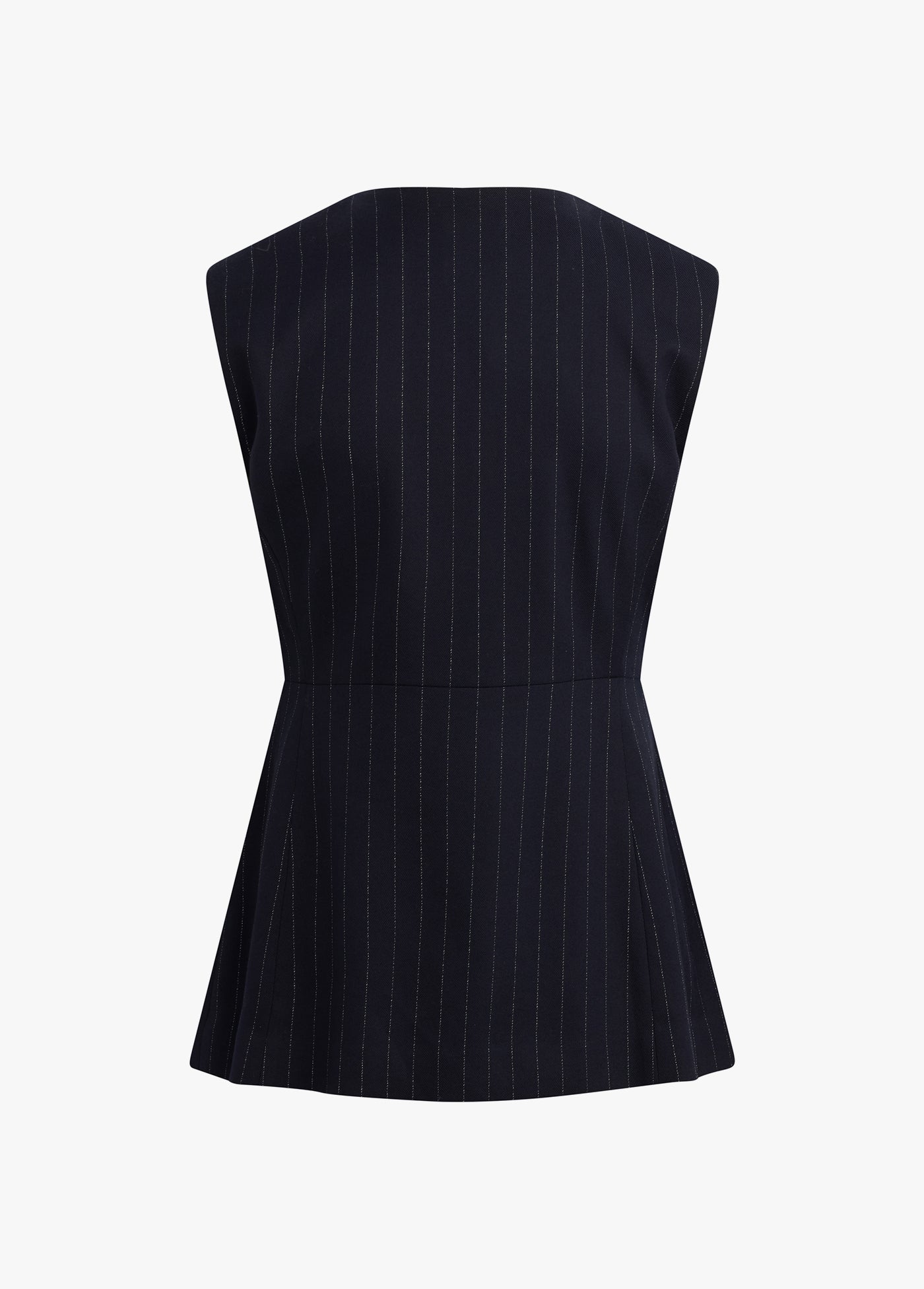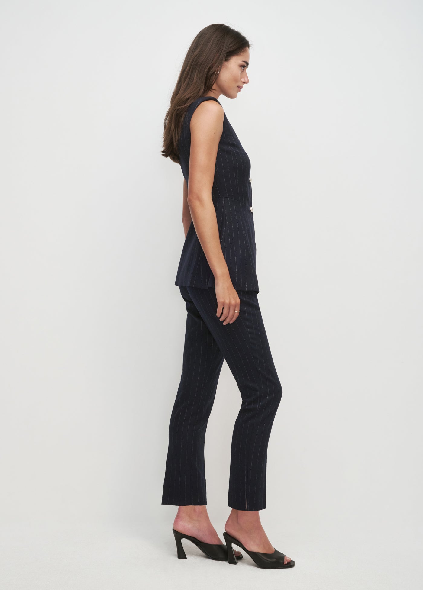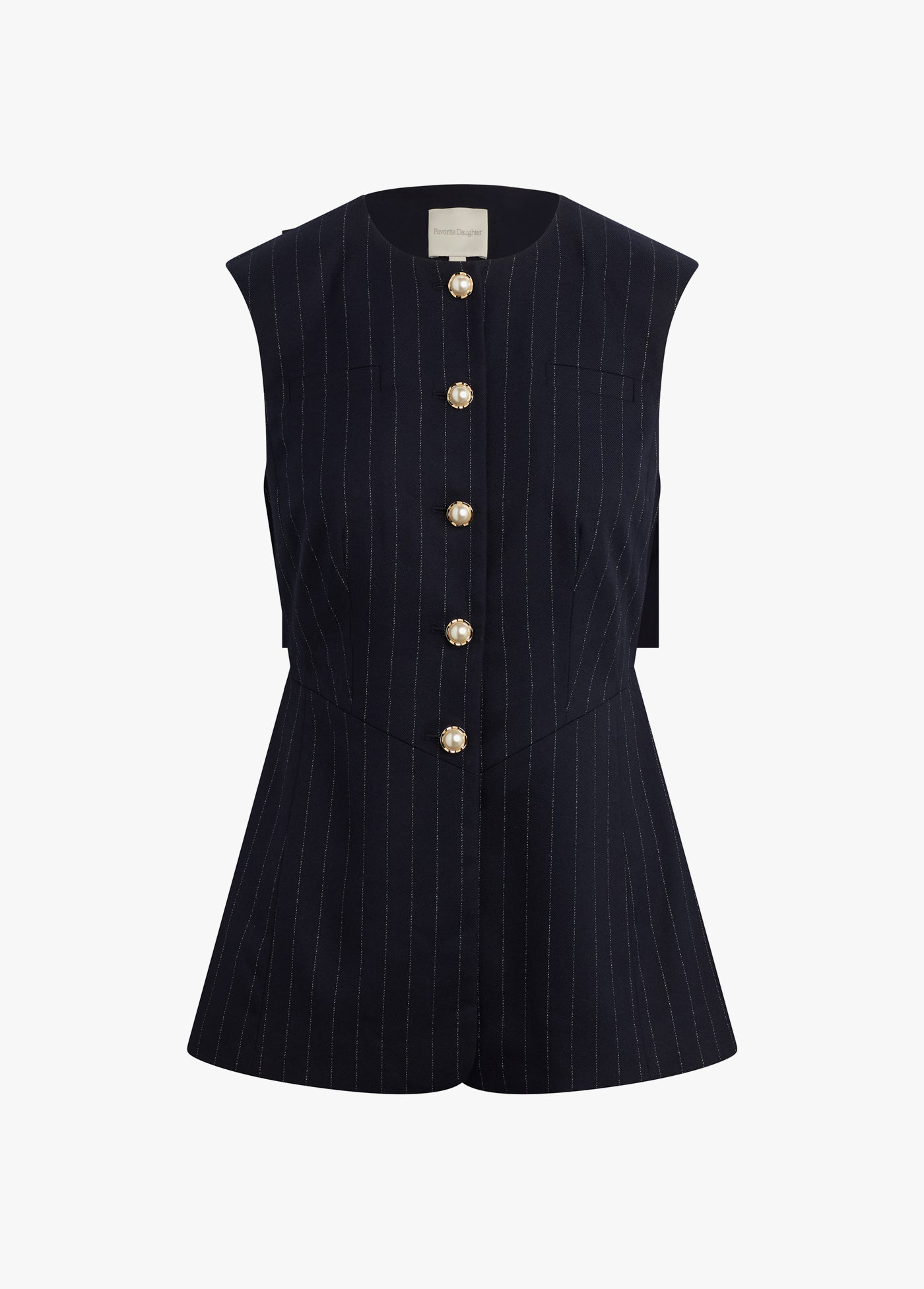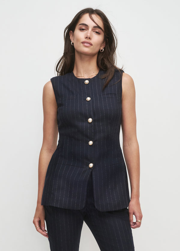 Clocking In never looked this good. Cut in a navy pinstripe suiting blend, it's a long-line vest with a fitted waist and exposed buttons. Pair it with the matching Favorite Cigarette Pant for the perfect suiting set.