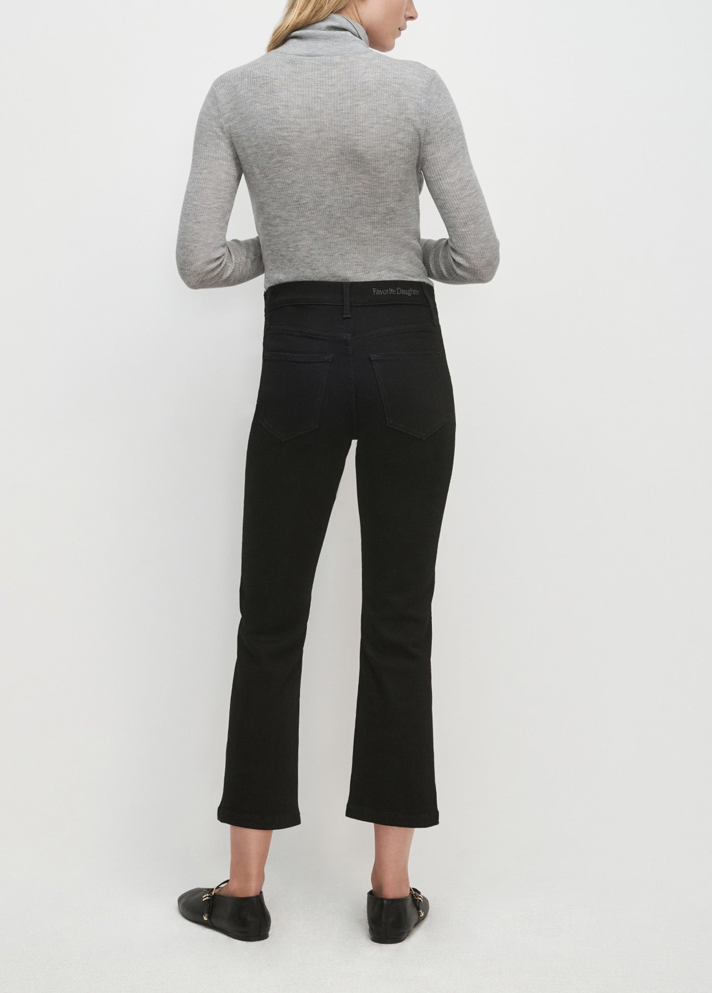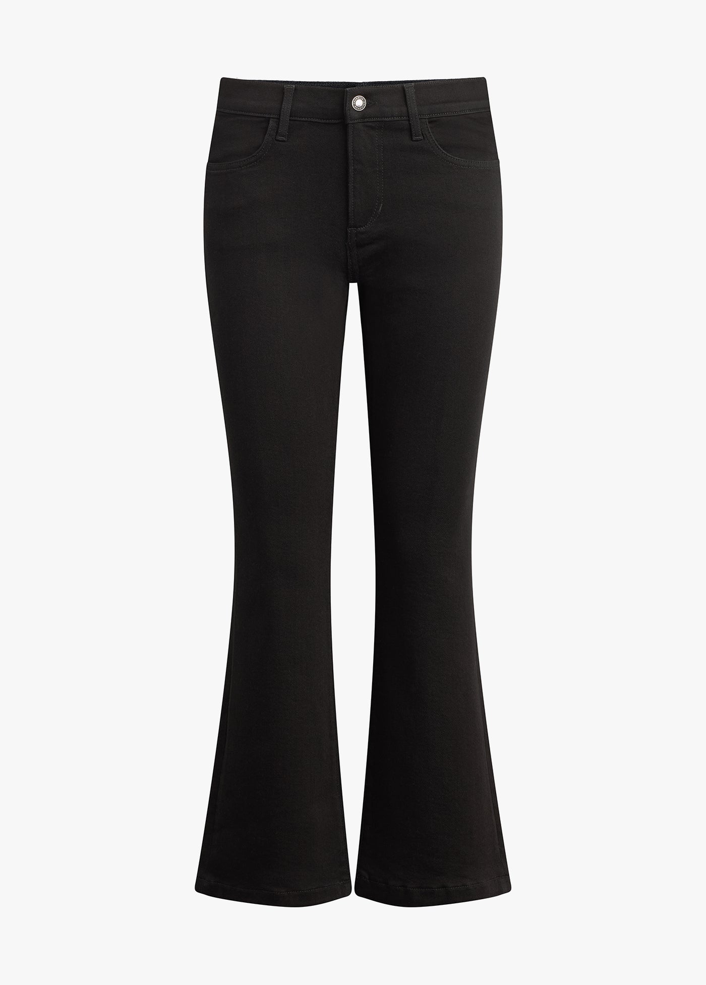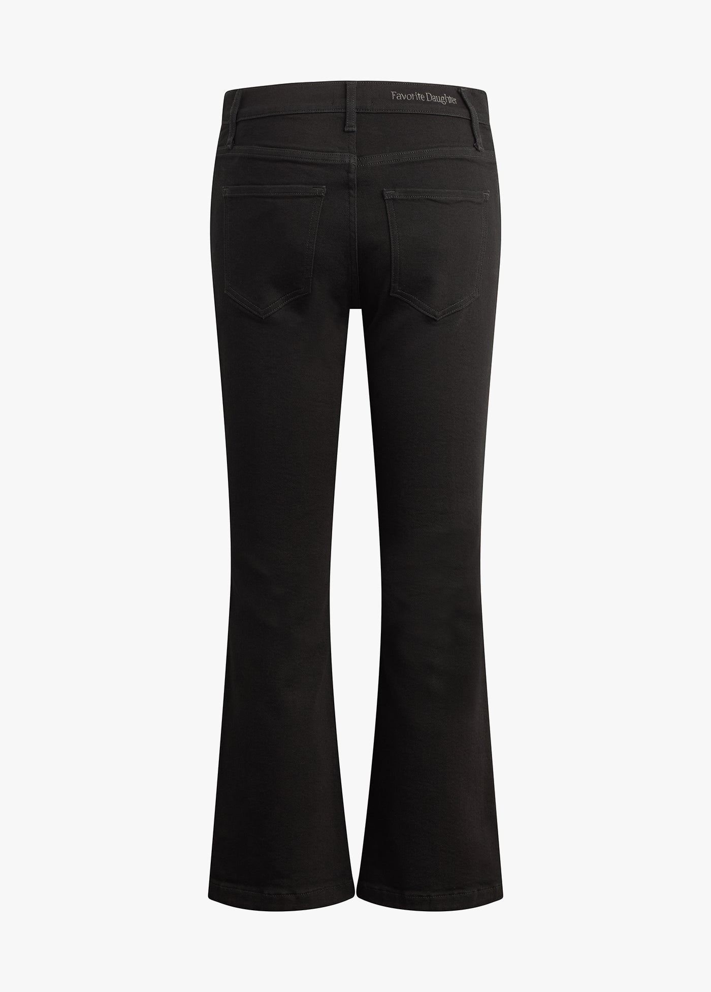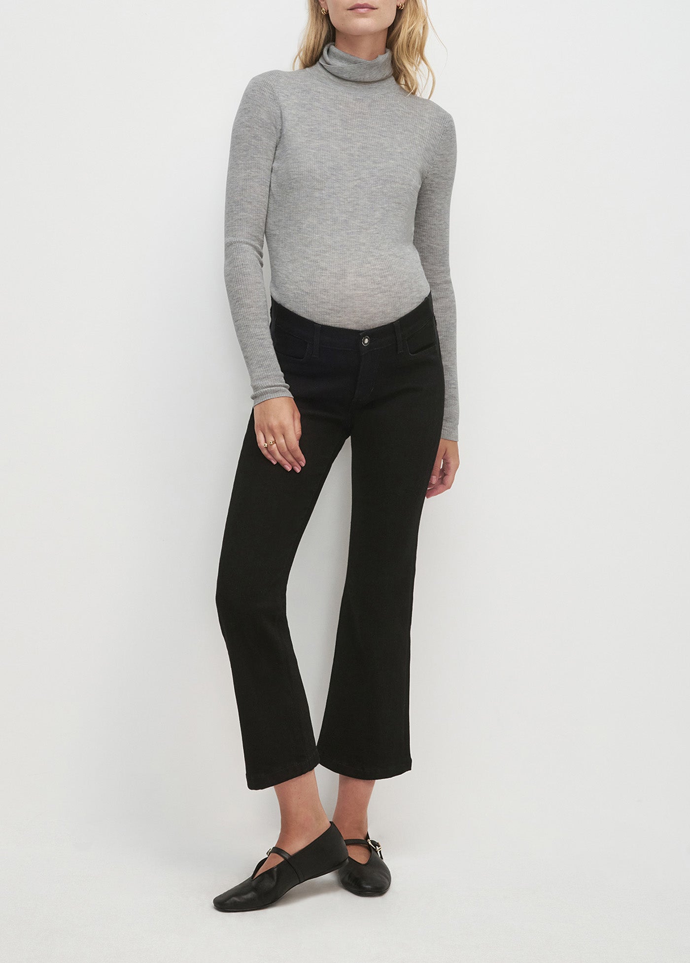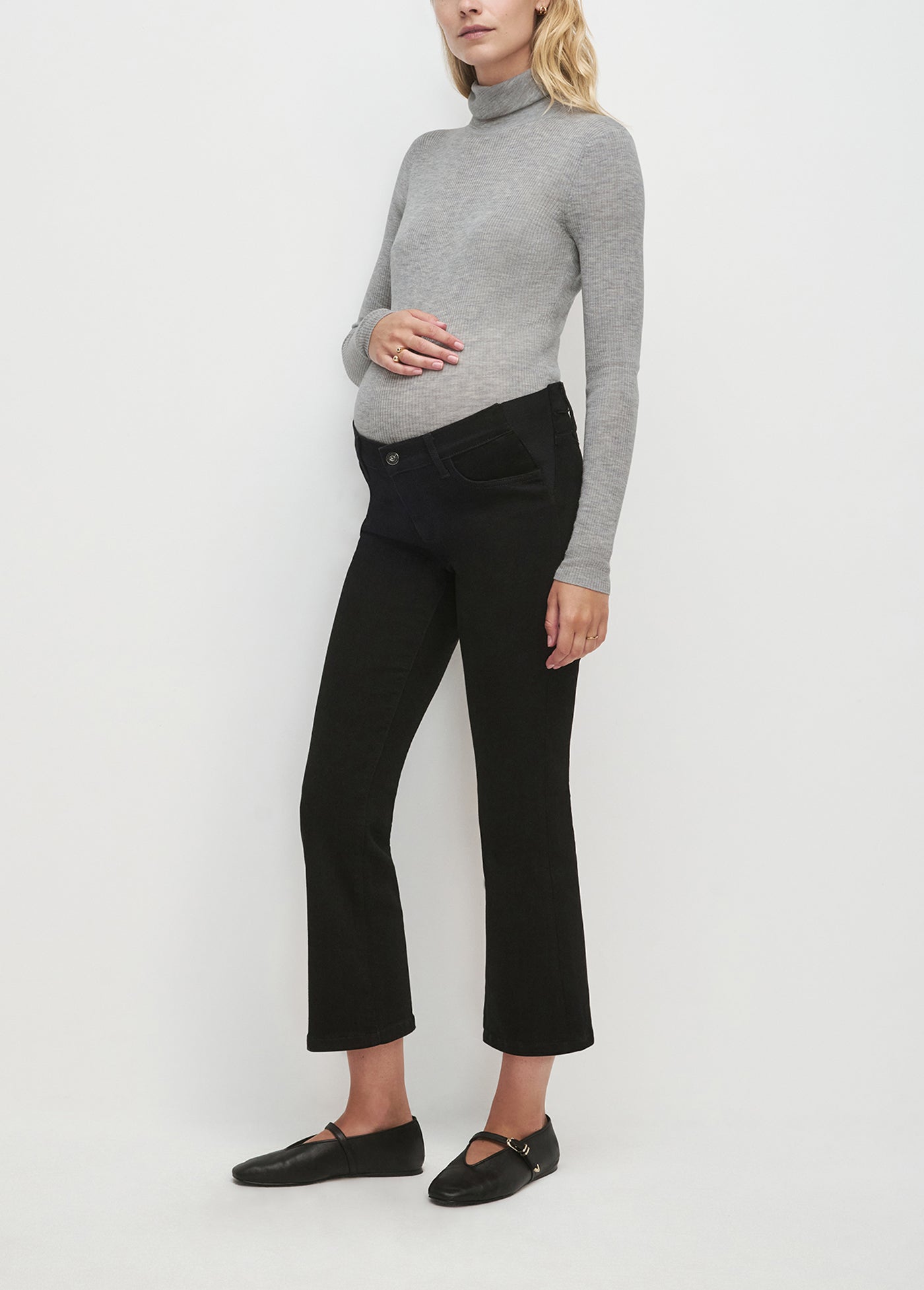 The Mama Boot Crop has a 9.5" rise that sits comfortably under the belly, with a relaxed fit through the hips and thigh. Made from high stretch, heavyweight denim in the black rinse Onyx wash, it has a 26.6" cropped inseam and a subtle kick at the hem. An easy favorite, bump and all.