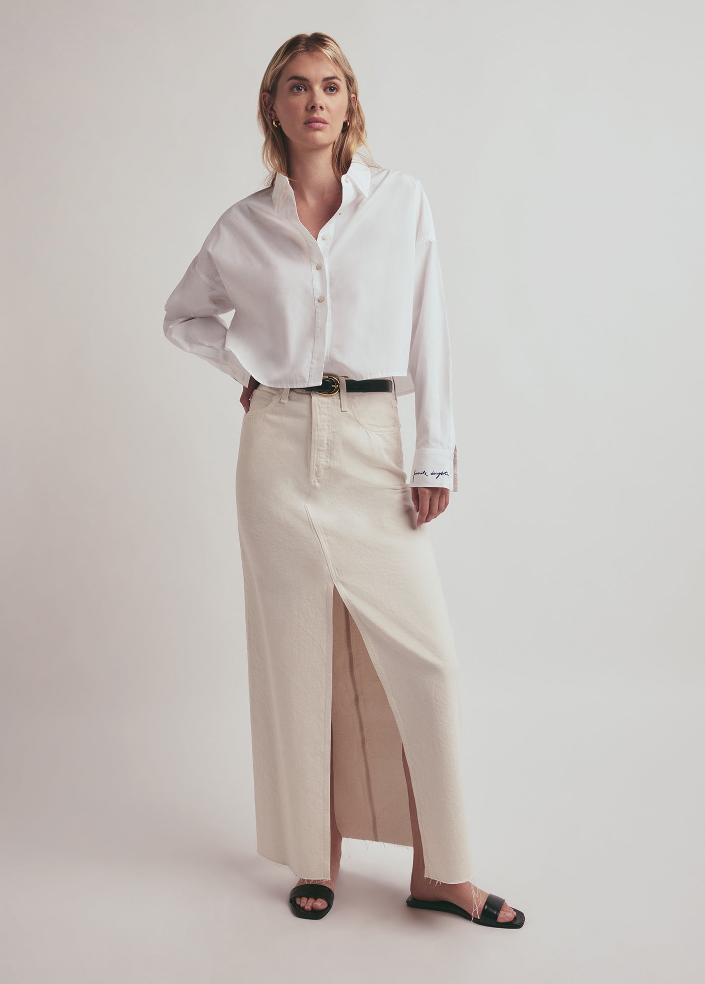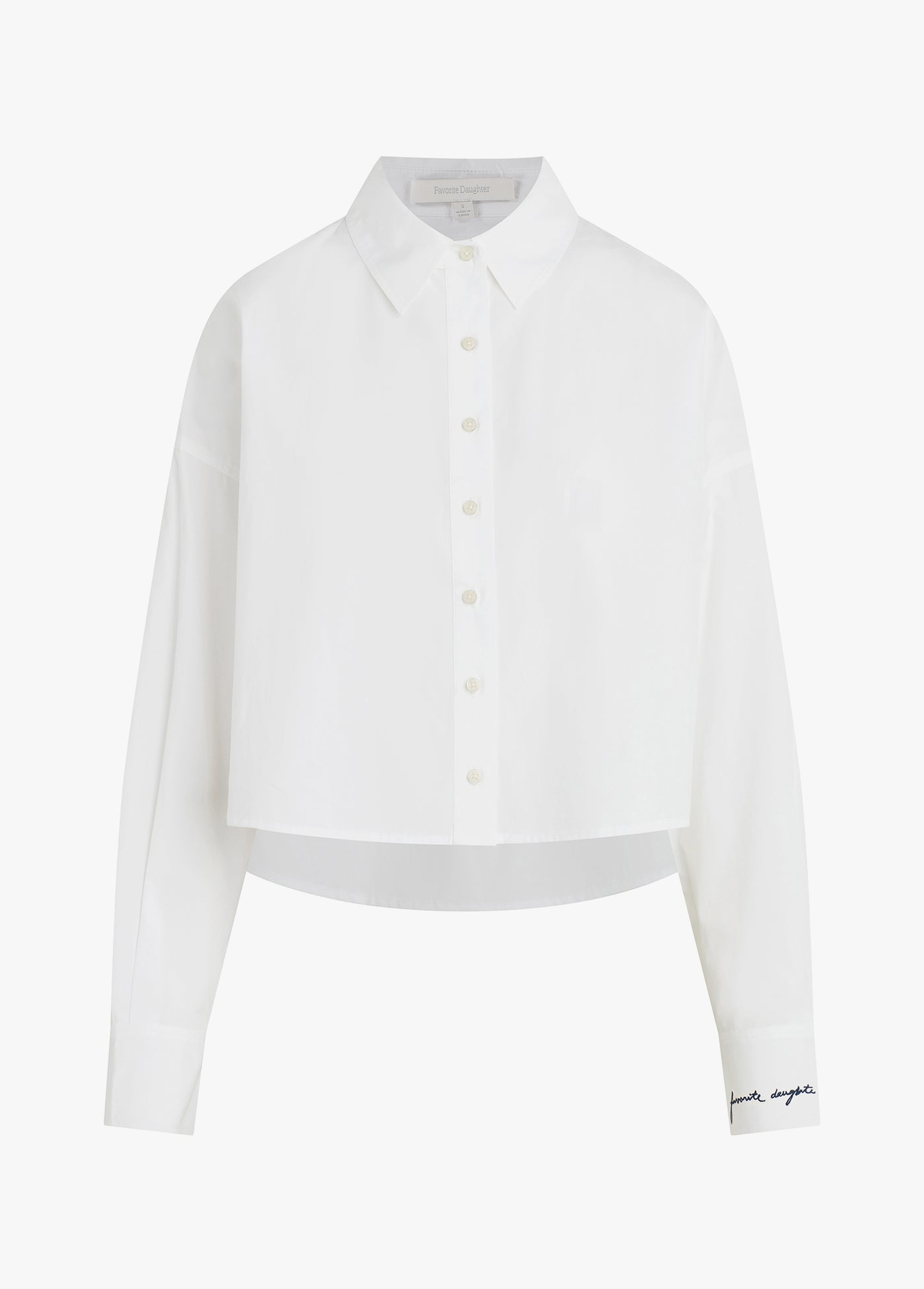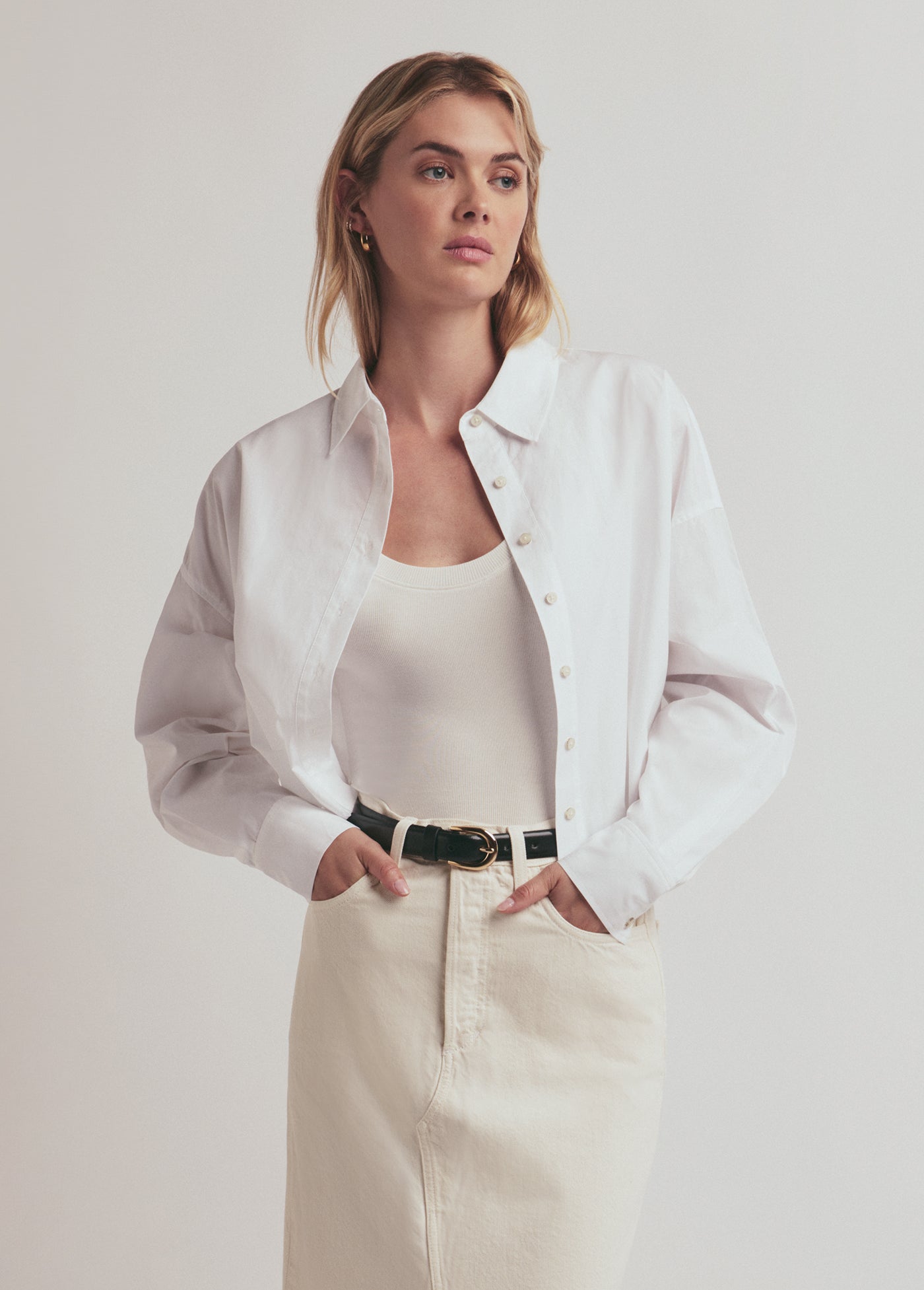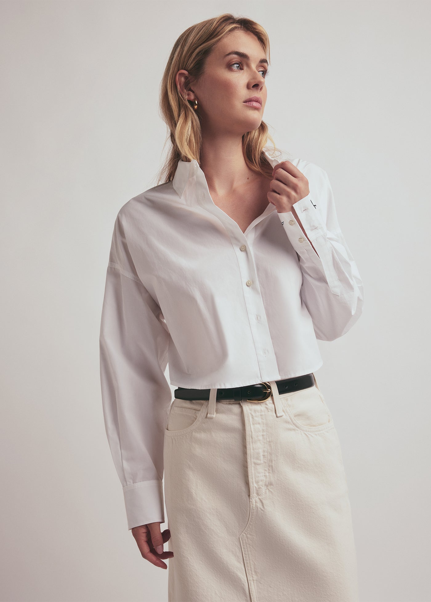 It's a fan favorite, now with slightly cropped styling. The Crop Ex-Boyfriend Shirt is an oversized button up cut from a cotton poplin with a relaxed fit and pointed collar. With the shortened length, you'll find it's super versatile as an unbuttoned layer over The Ribbed Tank or buttoned up with absolutely anything.