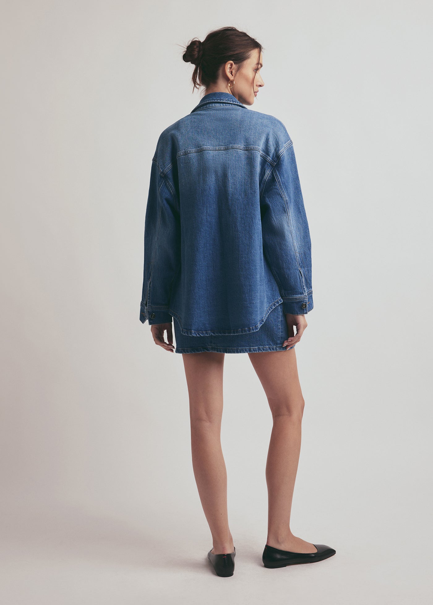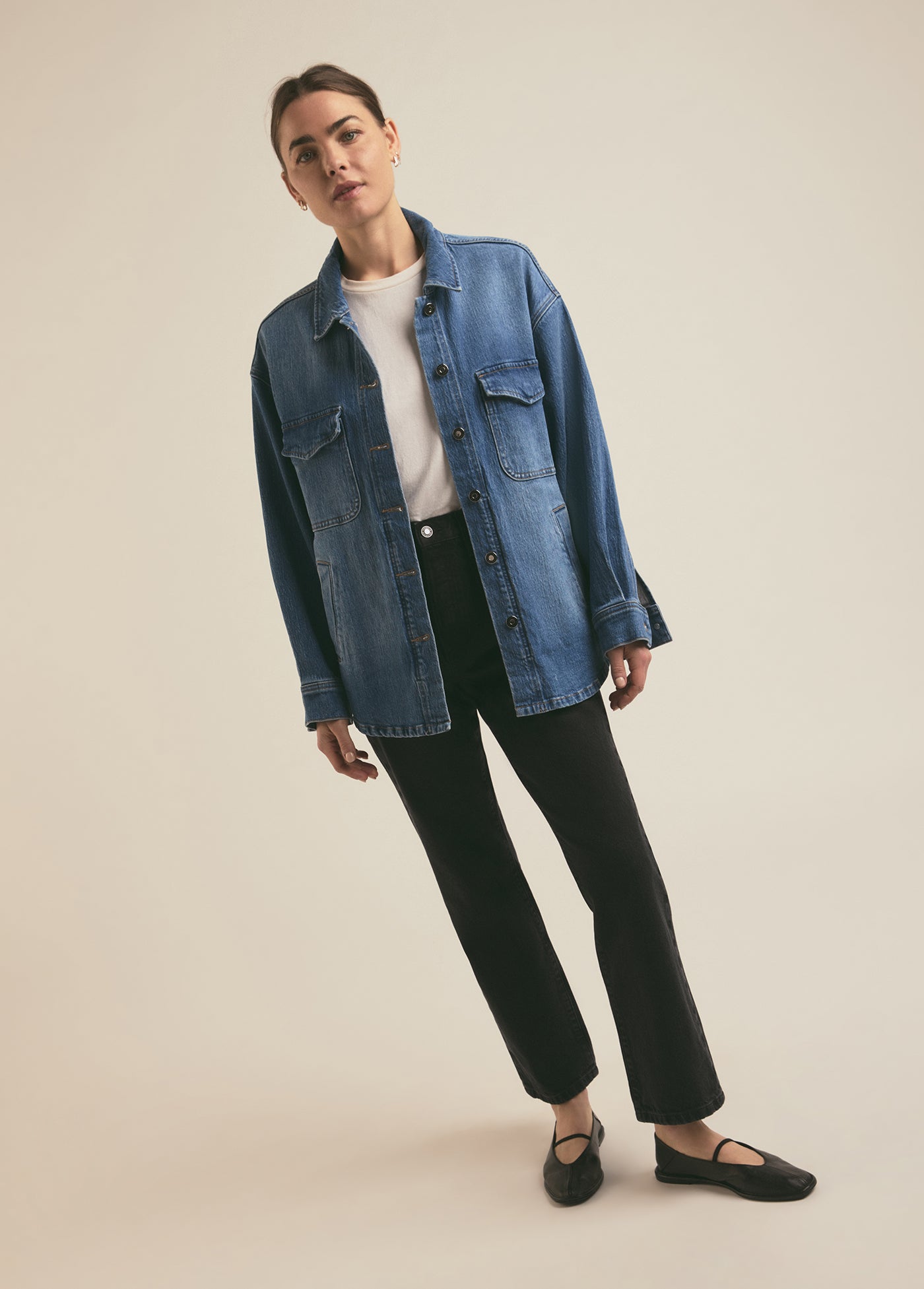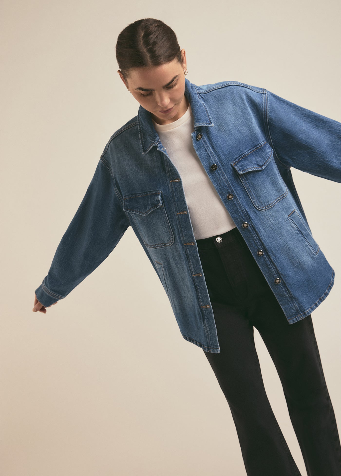 FINAL SALE - NO RETURN / EXCHANGEA shacket for all seasons. Cut from comfort-stretch denim, the Dad Shacket in Inez has been washed down to a classic blue with grit and texture creating highs and lows at the seams for a vintage look. It already feels broken in but will get even better with each wear.