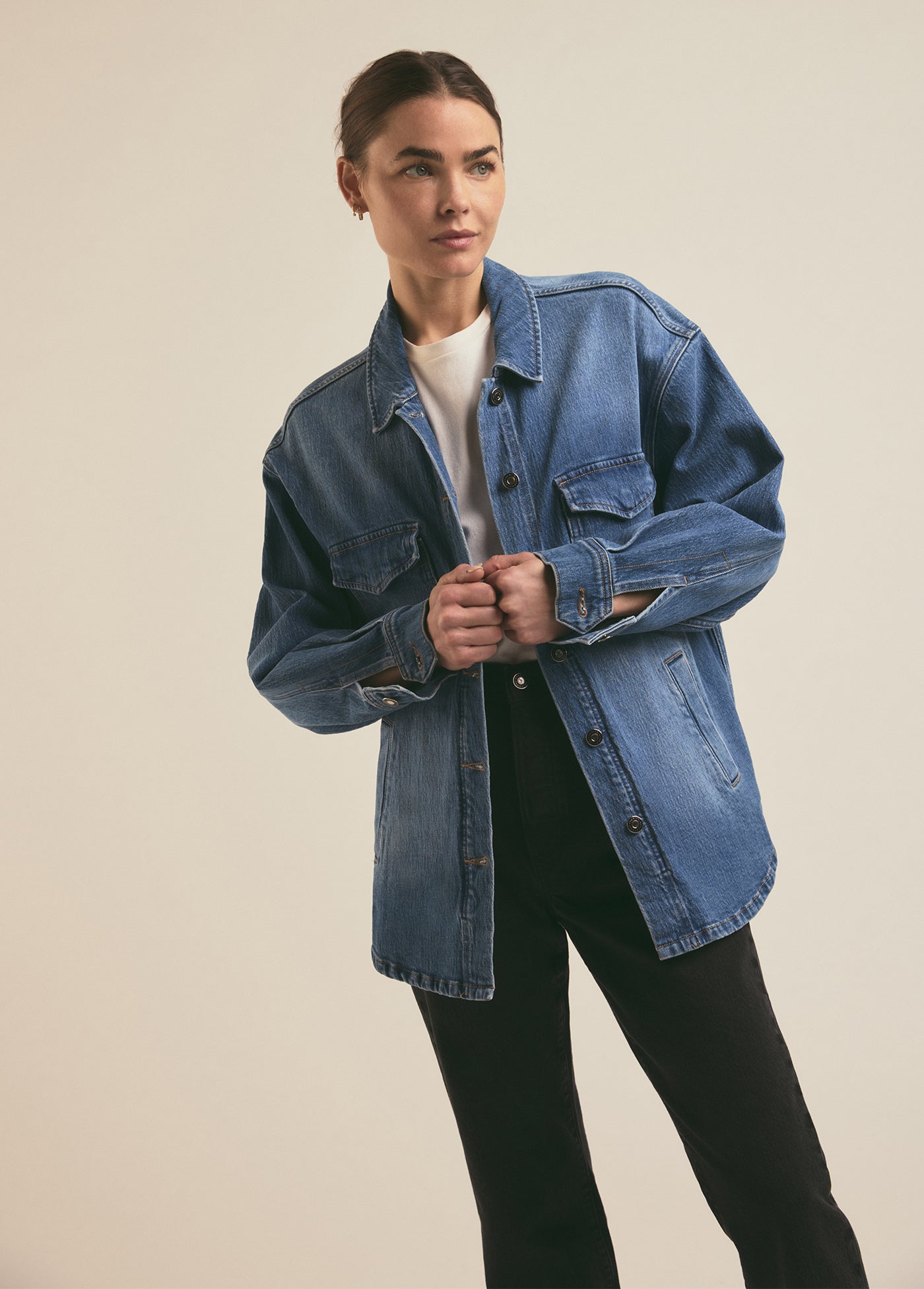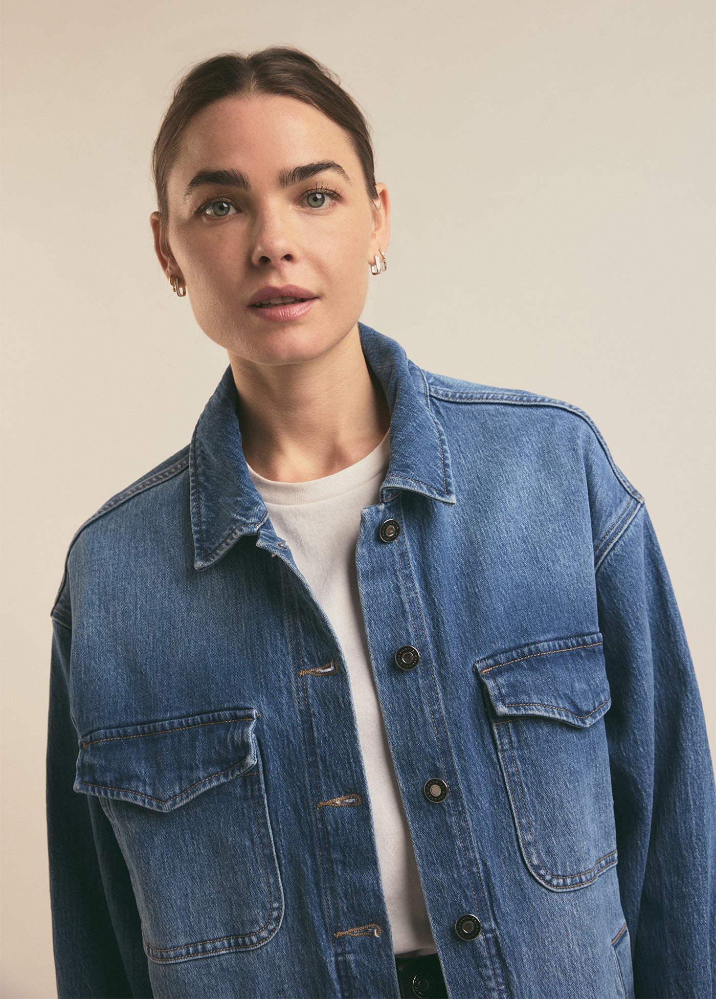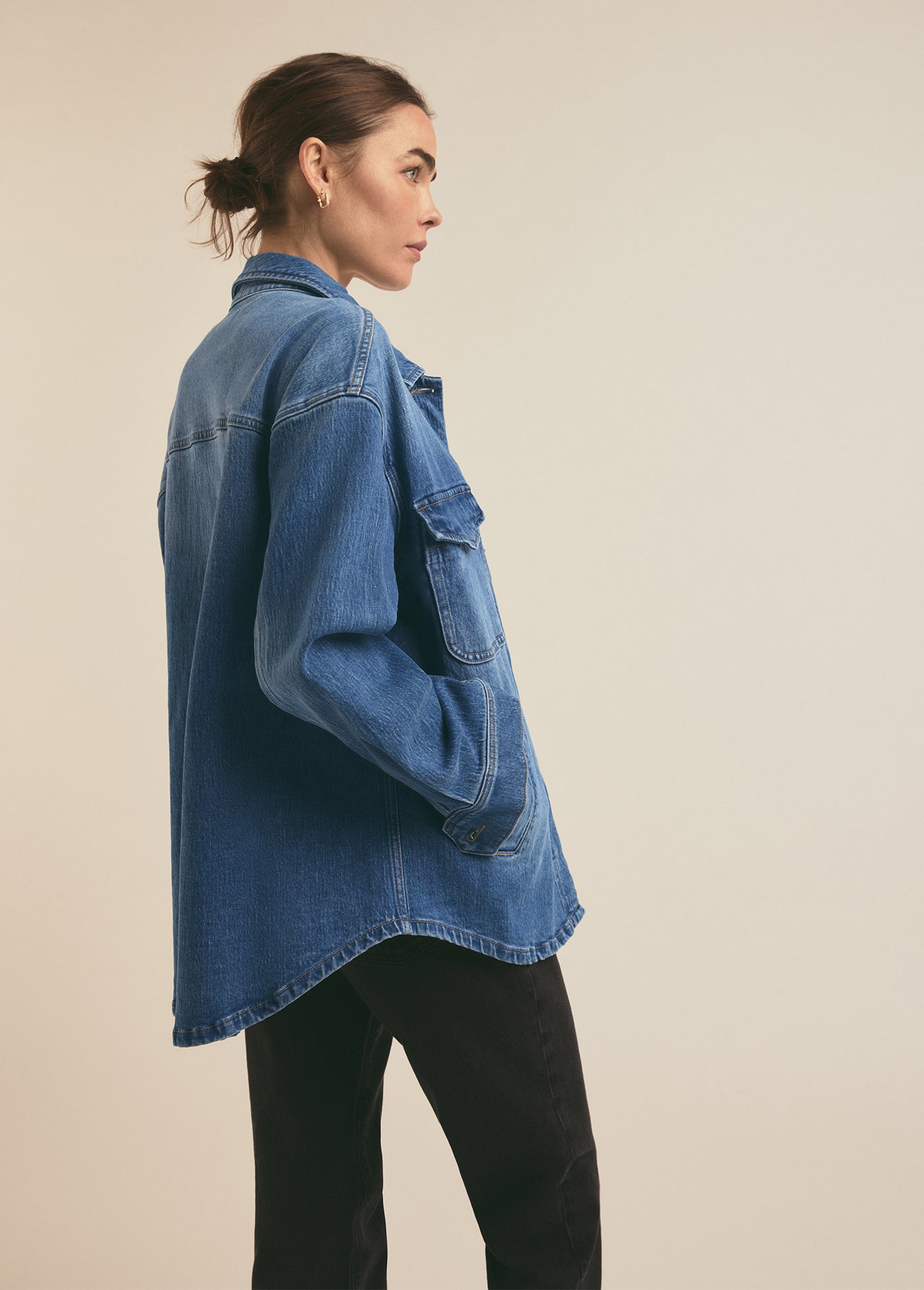 FINAL SALE - NO RETURN / EXCHANGEA shacket for all seasons. Cut from comfort-stretch denim, the Dad Shacket in Inez has been washed down to a classic blue with grit and texture creating highs and lows at the seams for a vintage look. It already feels broken in but will get even better with each wear.