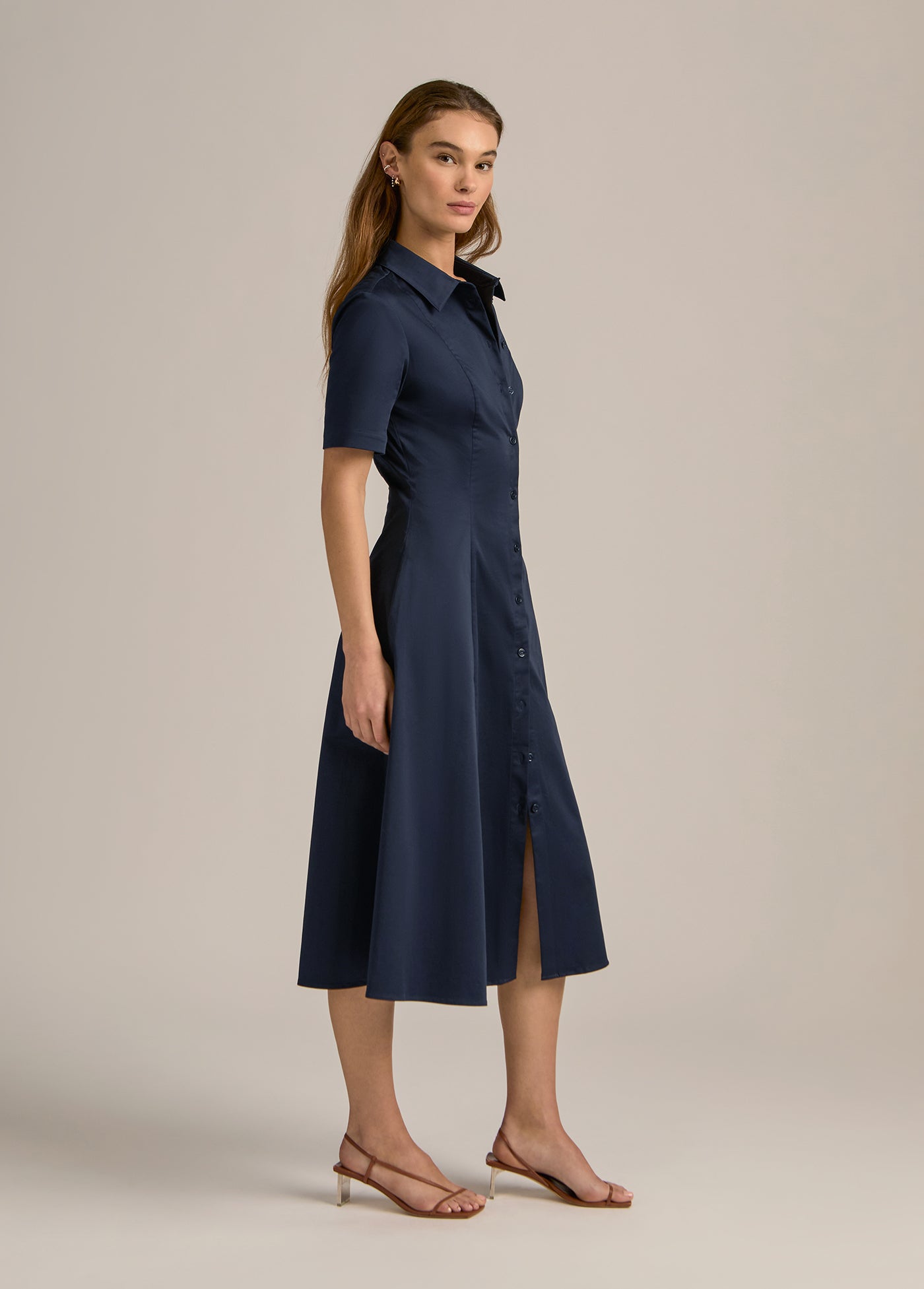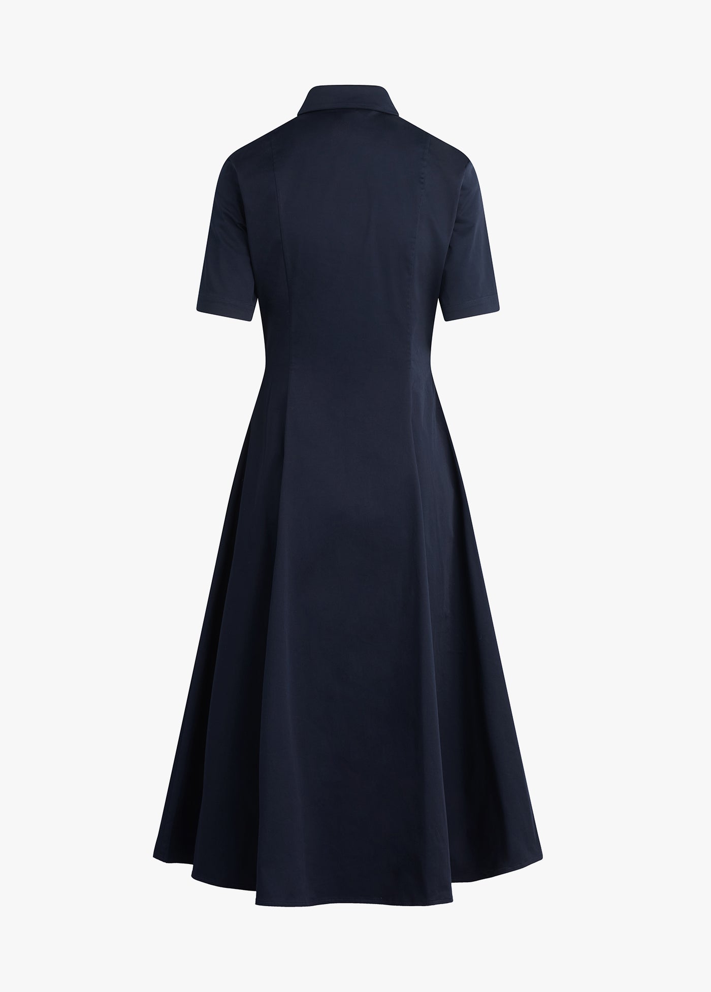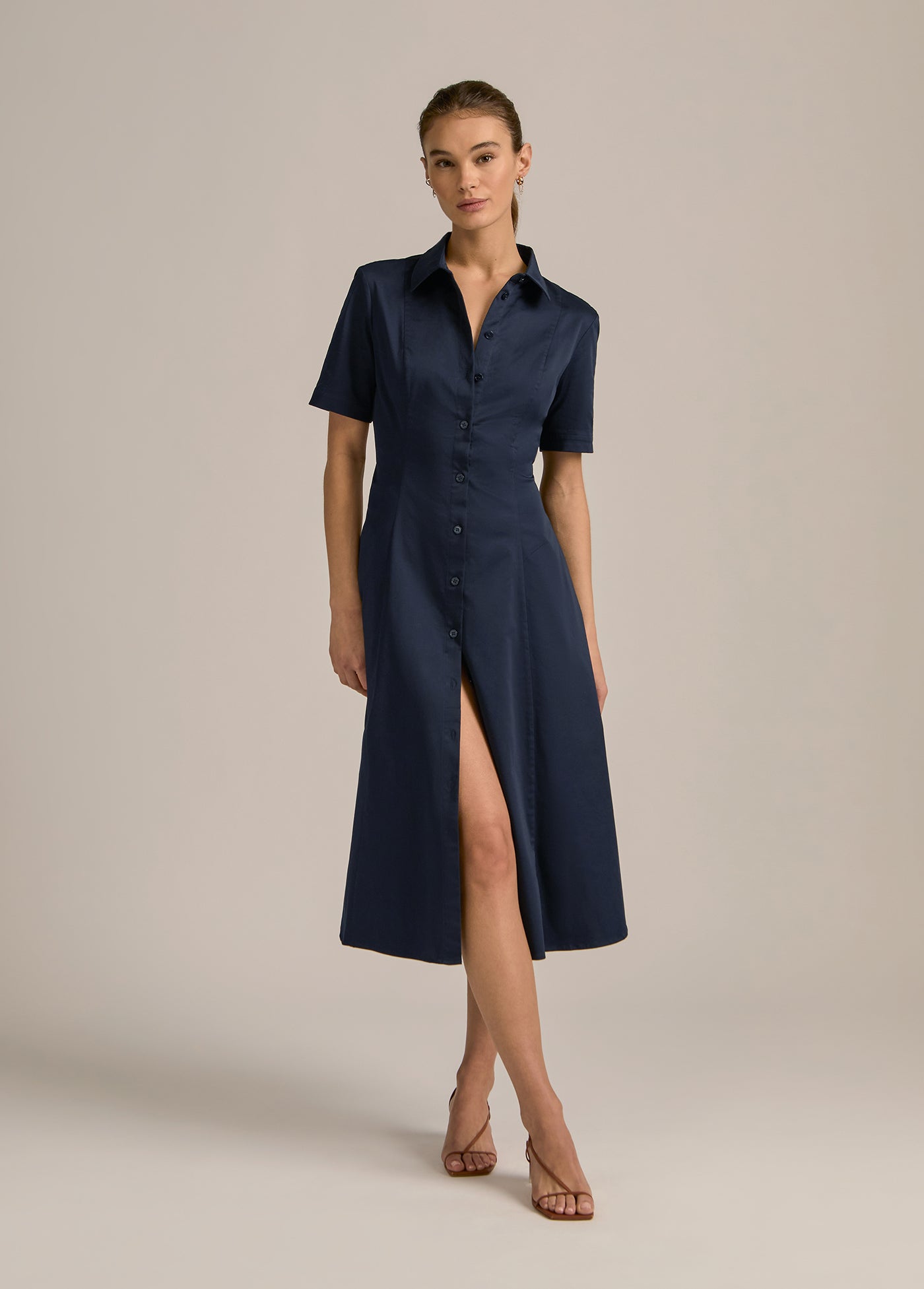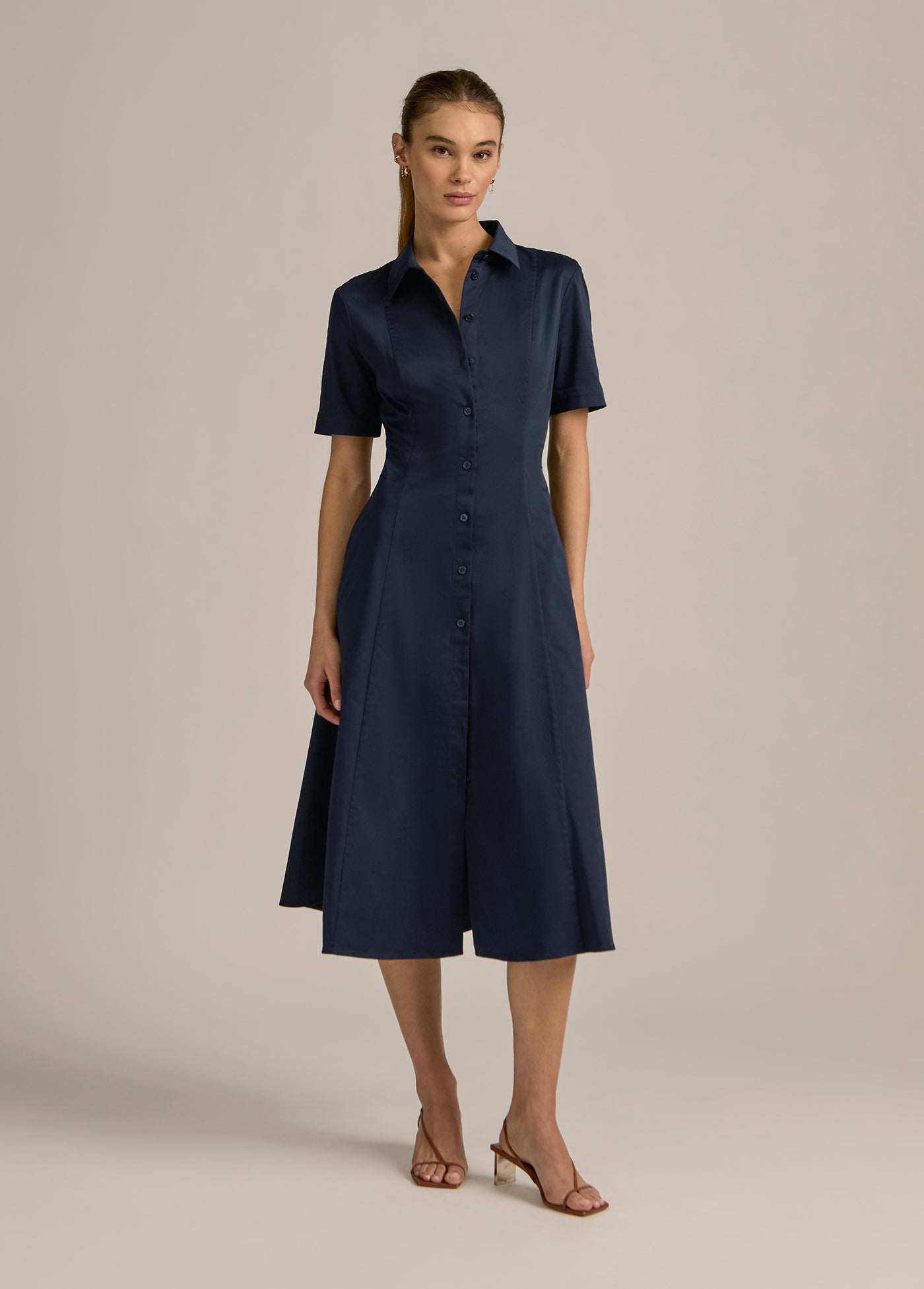 Very demure, very much a favorite. With button-up shirt styling, a fitted bodice, and full skirt, our new short-sleeve cotton poplin midi dress (50" length) keeps it classy without even trying.
