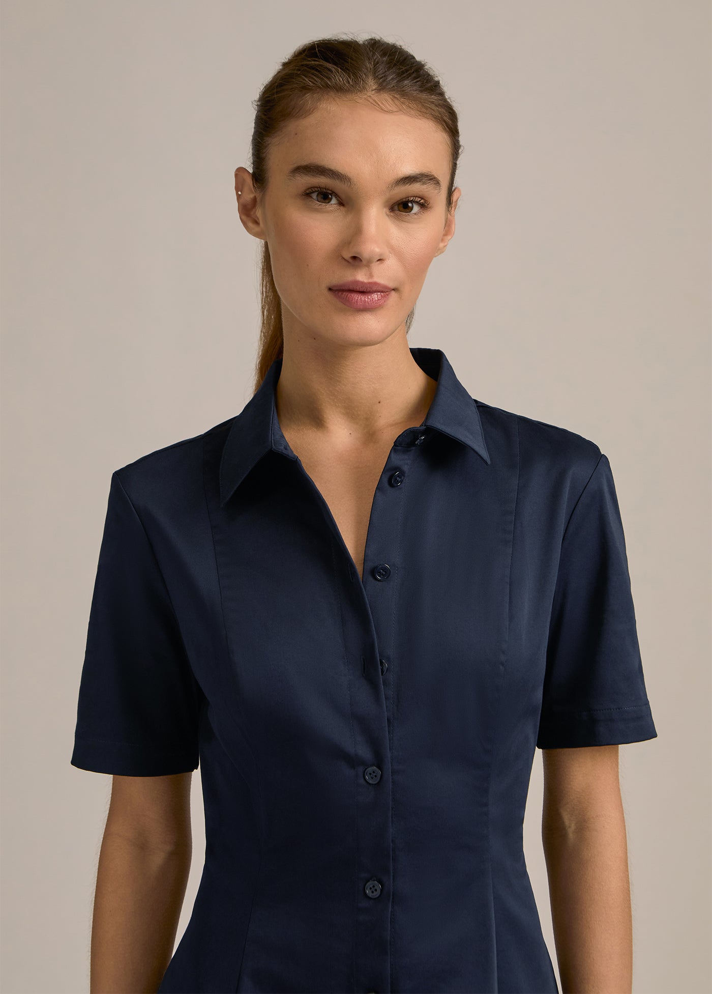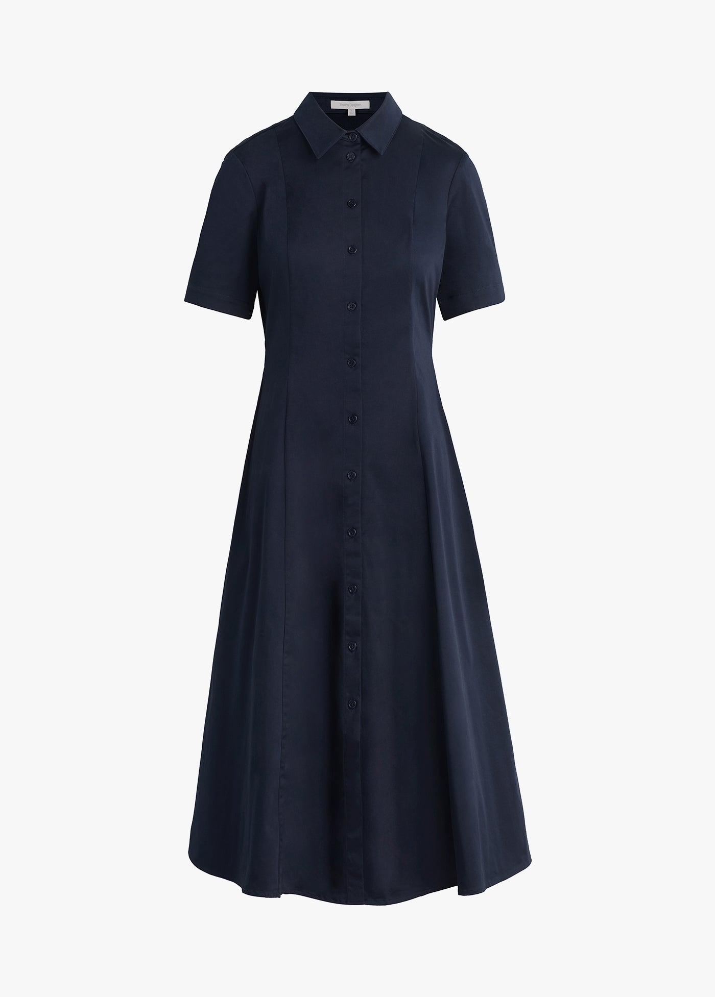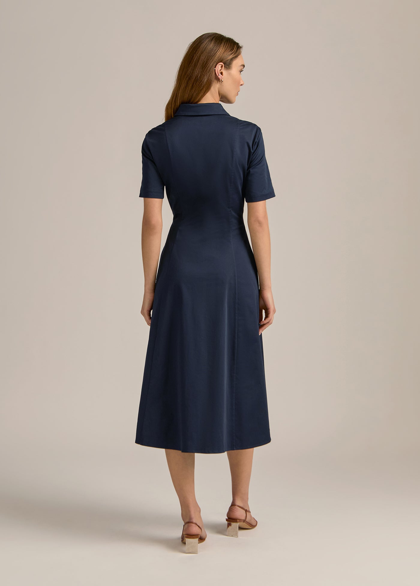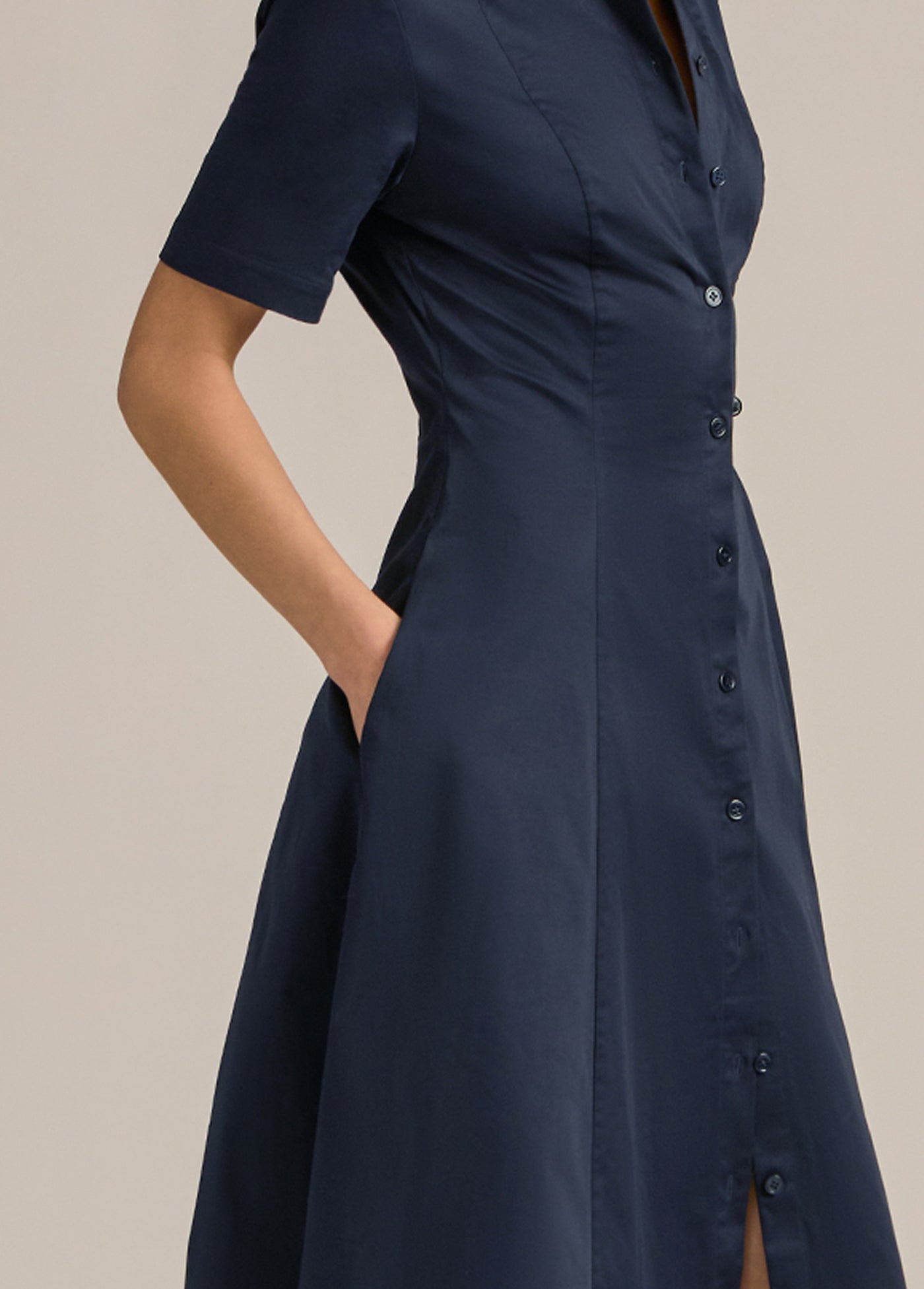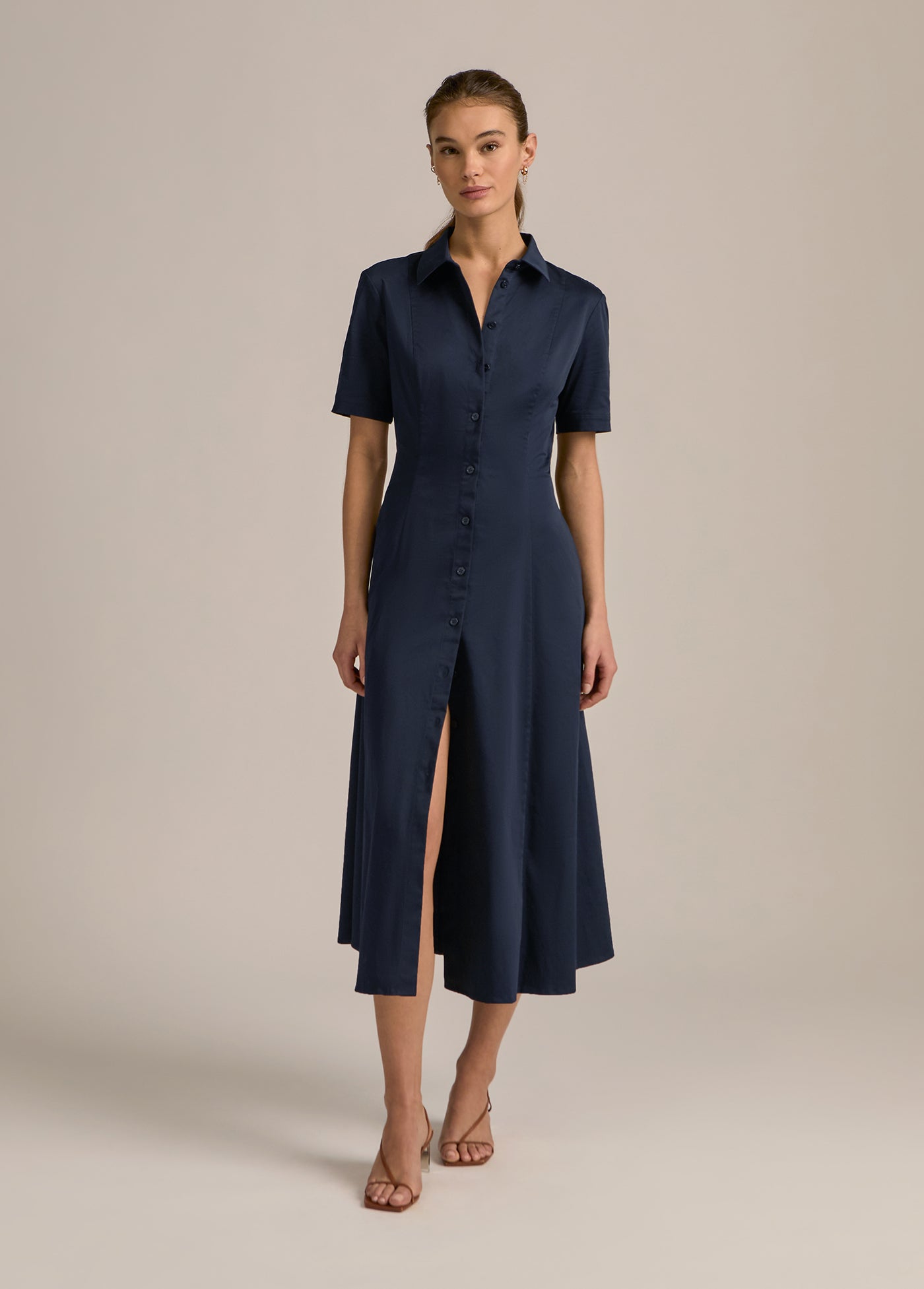 Very demure, very much a favorite. With button-up shirt styling, a fitted bodice, and full skirt, our new short-sleeve cotton poplin midi dress (50" length) keeps it classy without even trying.