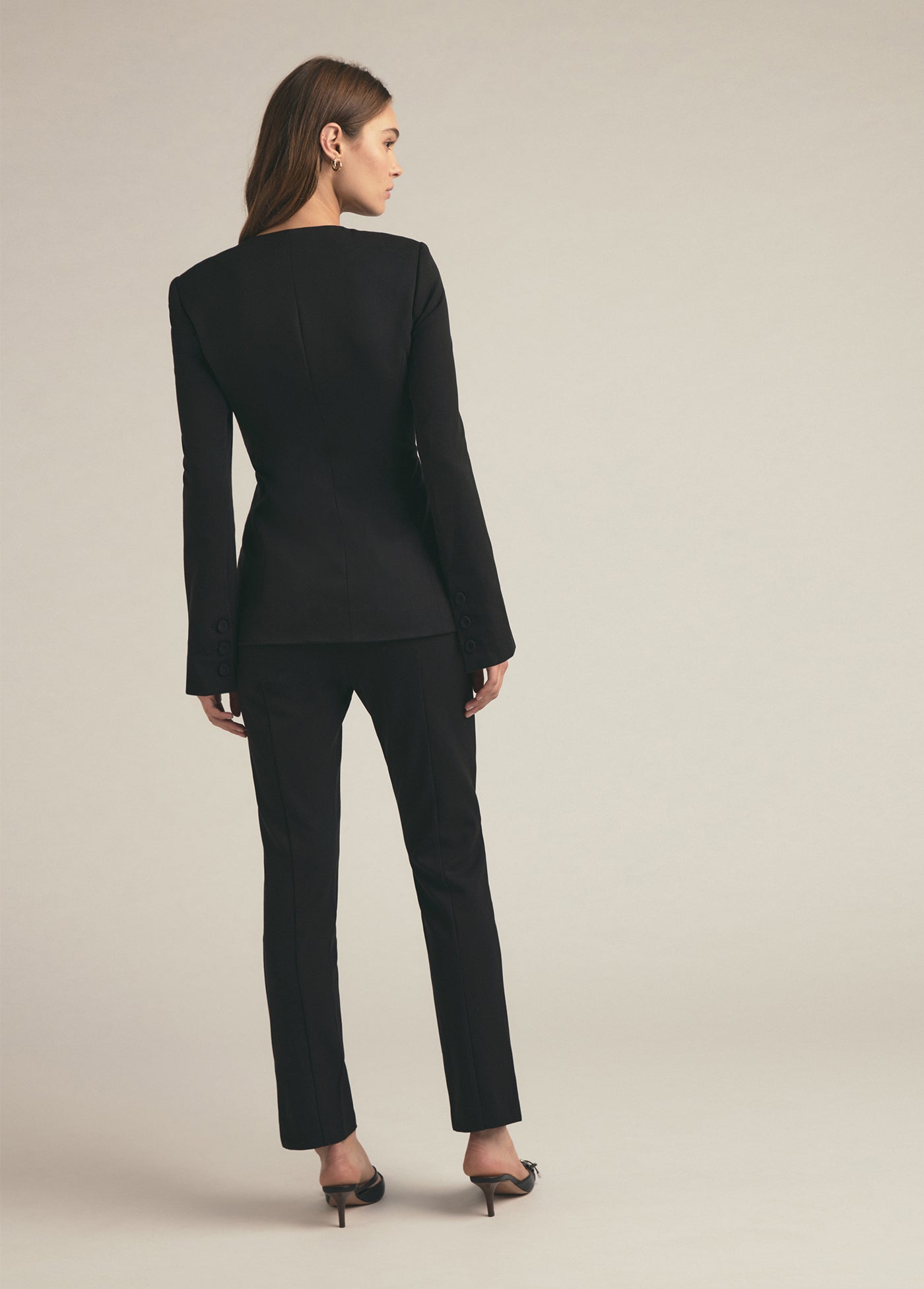 Our favorite design element of The Diana Jacket is how chic it looks buttoned up or open. With the round neckline, slim fit, and self-covered buttons, this blazer jacket will be a timeless treasure in your closet for years to come. It looks especially great when paired with The Suits You Legging in coordinating Black.
