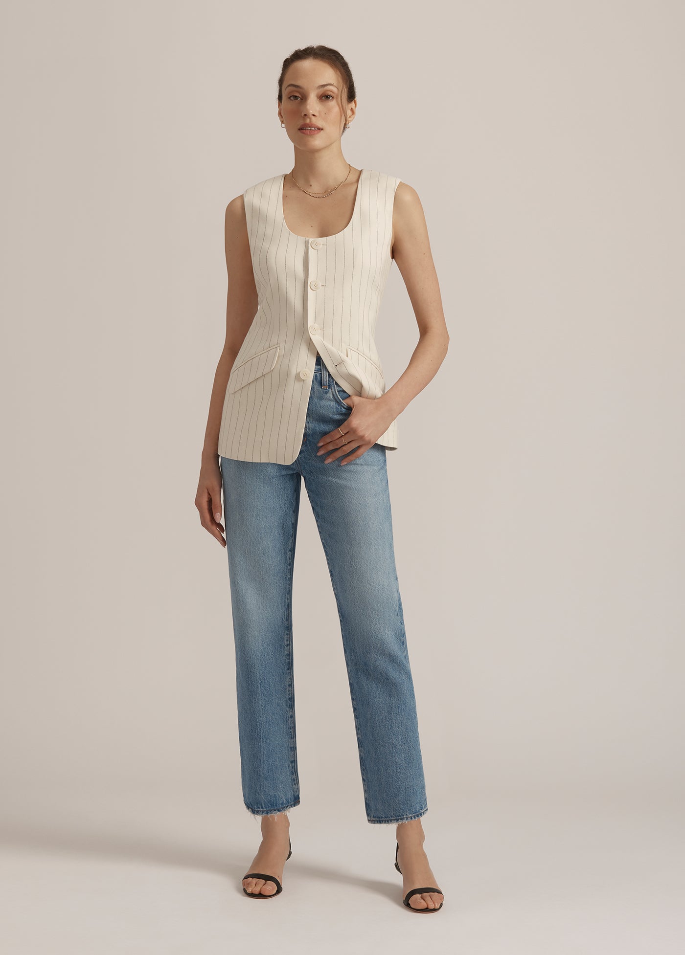 Round neckline. Slim fit. Self-covered buttons. The Diana Vest gets all the details right. Cut in a navy pinstripe suiting blend, it's the kind of classic that will be a favorite forever.