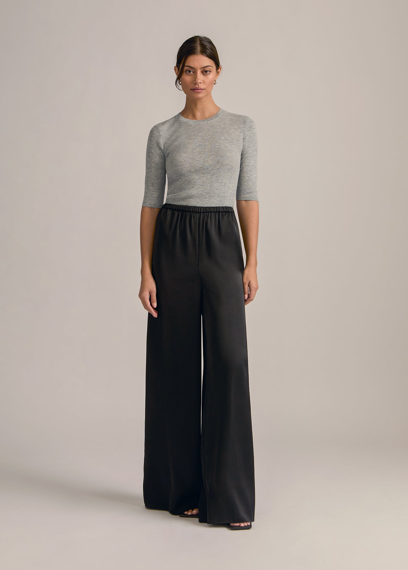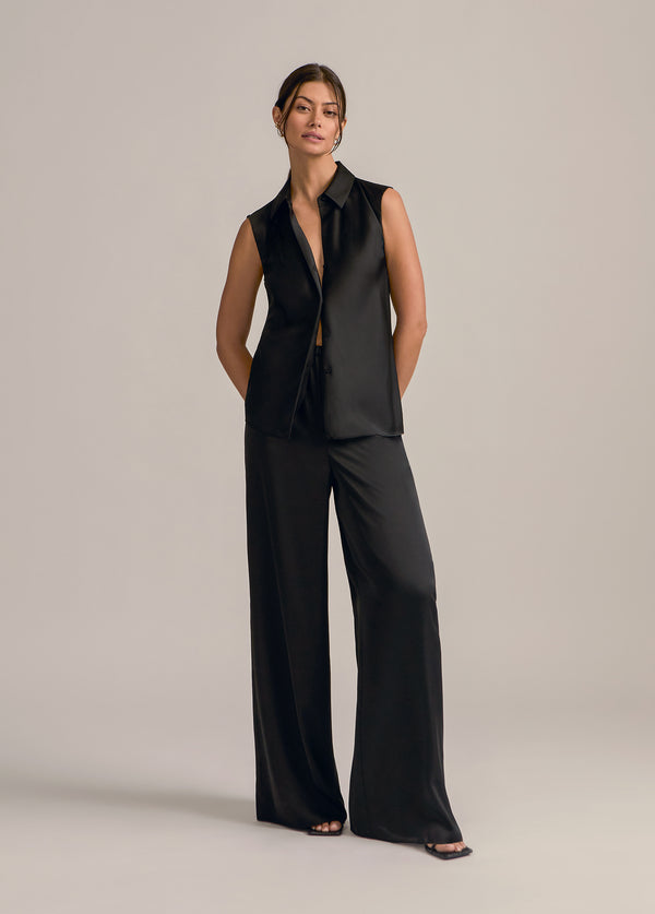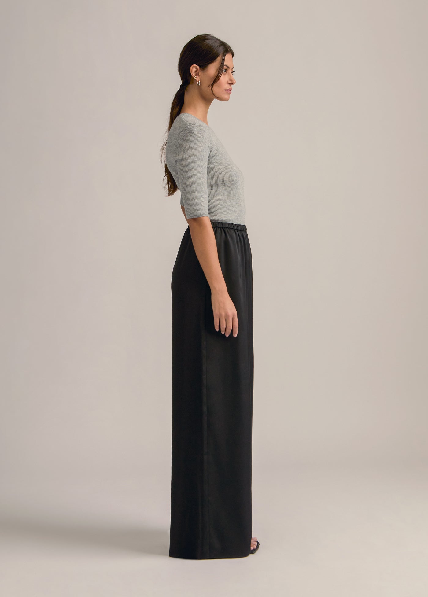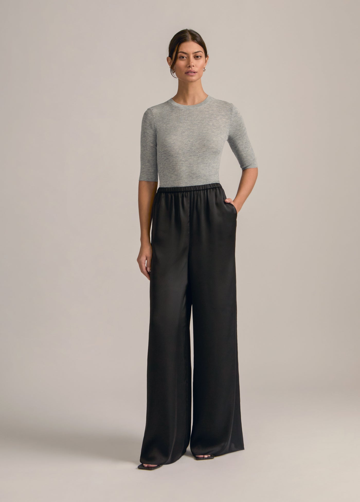 The Effortless Wide Leg is as easy to wear as it sounds—wide legs, a slim elastic waist with an 11.5” rise, and pull-on styling. Designed with a 32” inseam, these crepe satin pants look super chic when paired with The Agatha Top for a matching set.