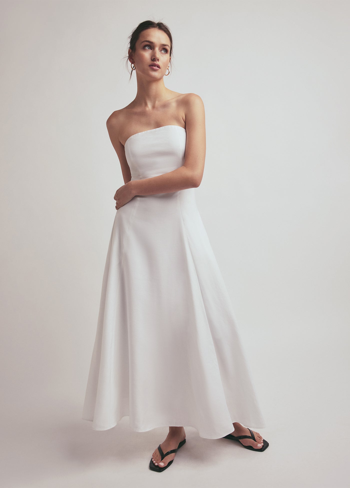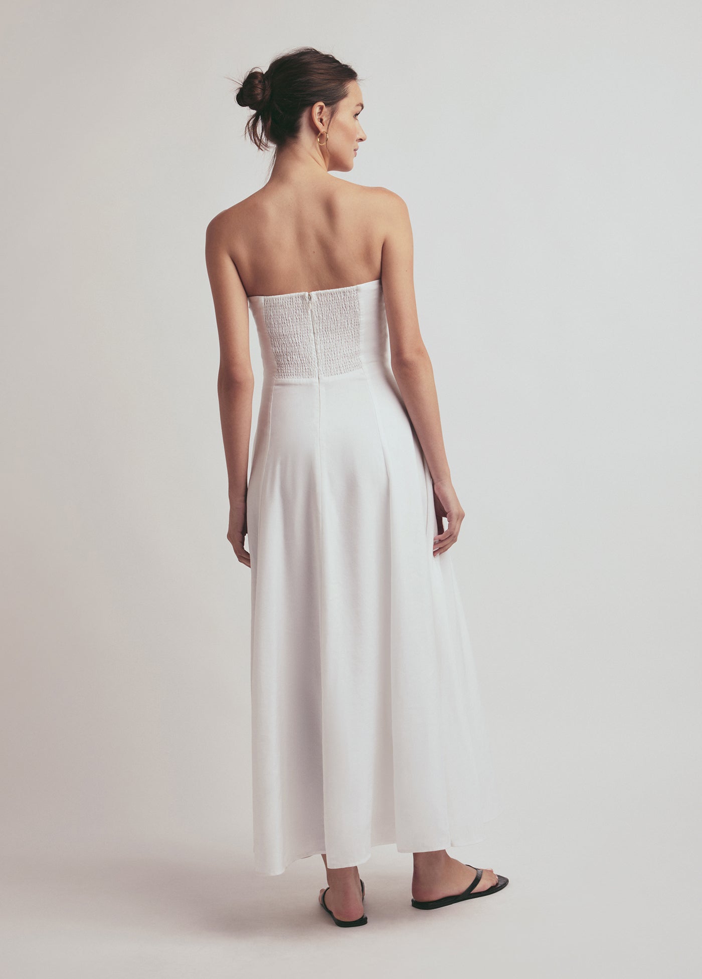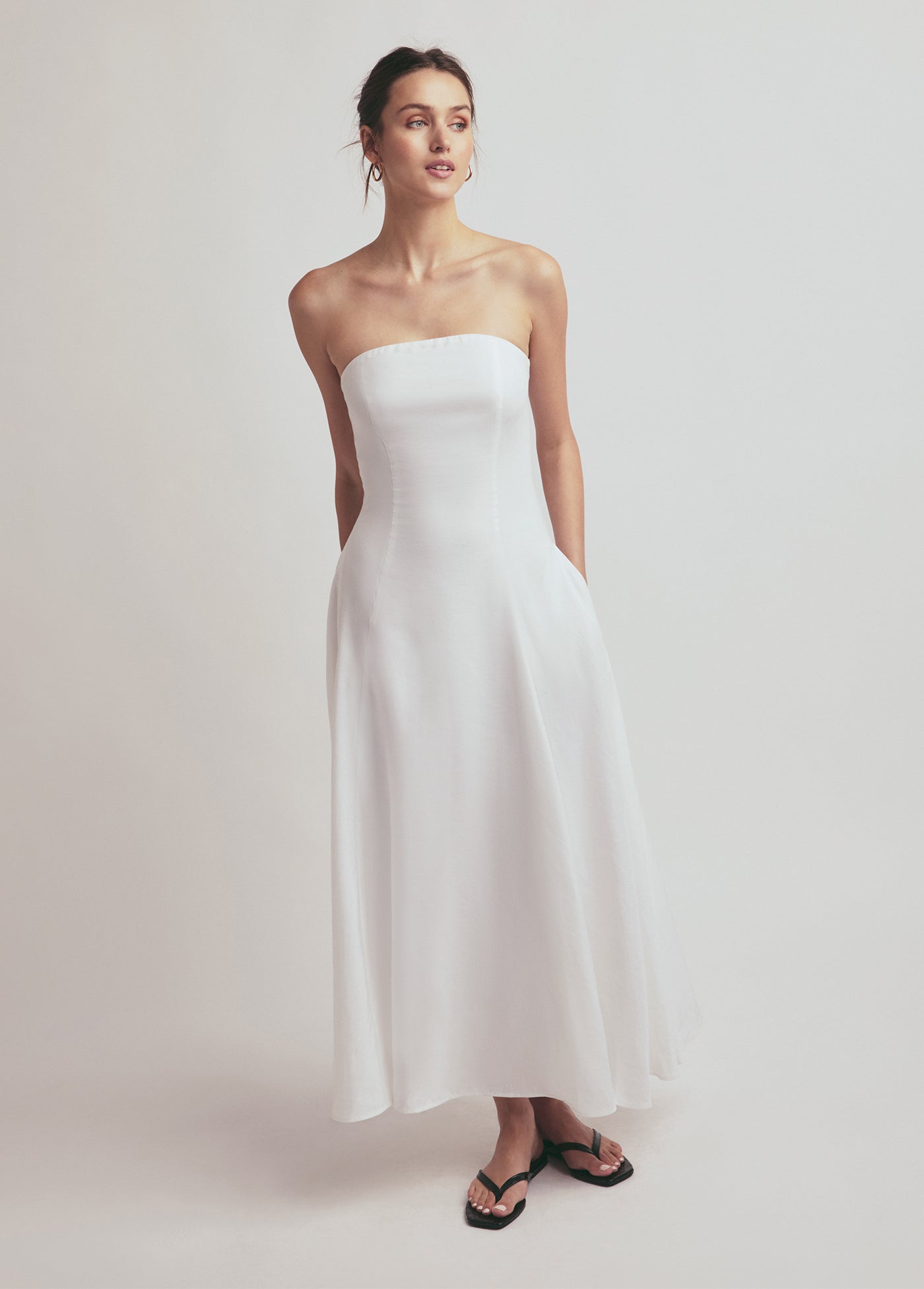 Timeless styling is what truly makes this linen-blend midi a favorite. Designed with a 55"length, classic strapless neckline, comfortable back smocking, an invisible back zipper--and, of course, side pockets (!)