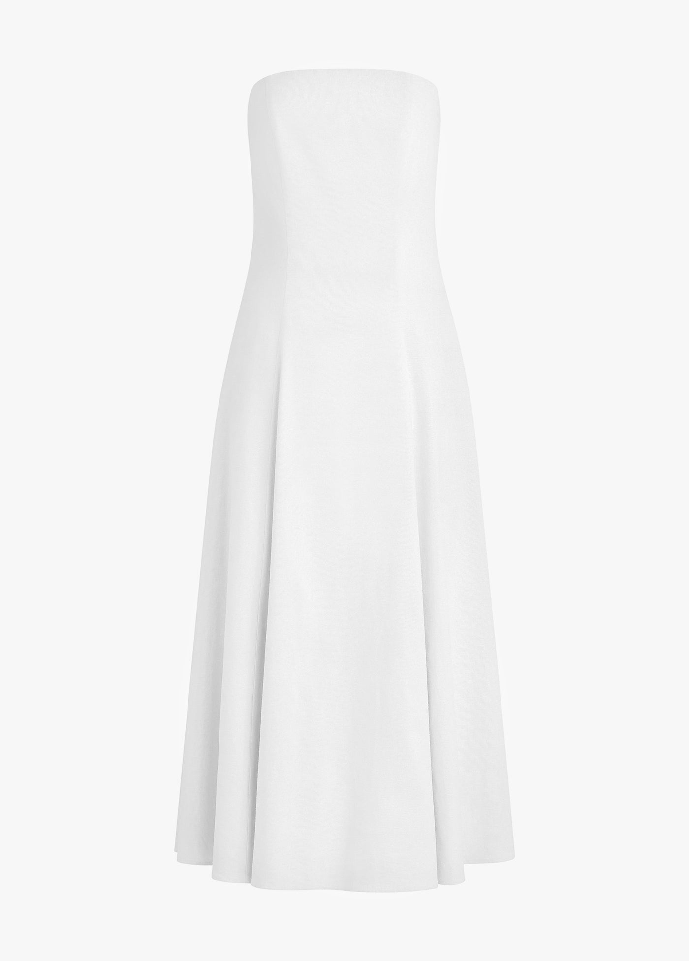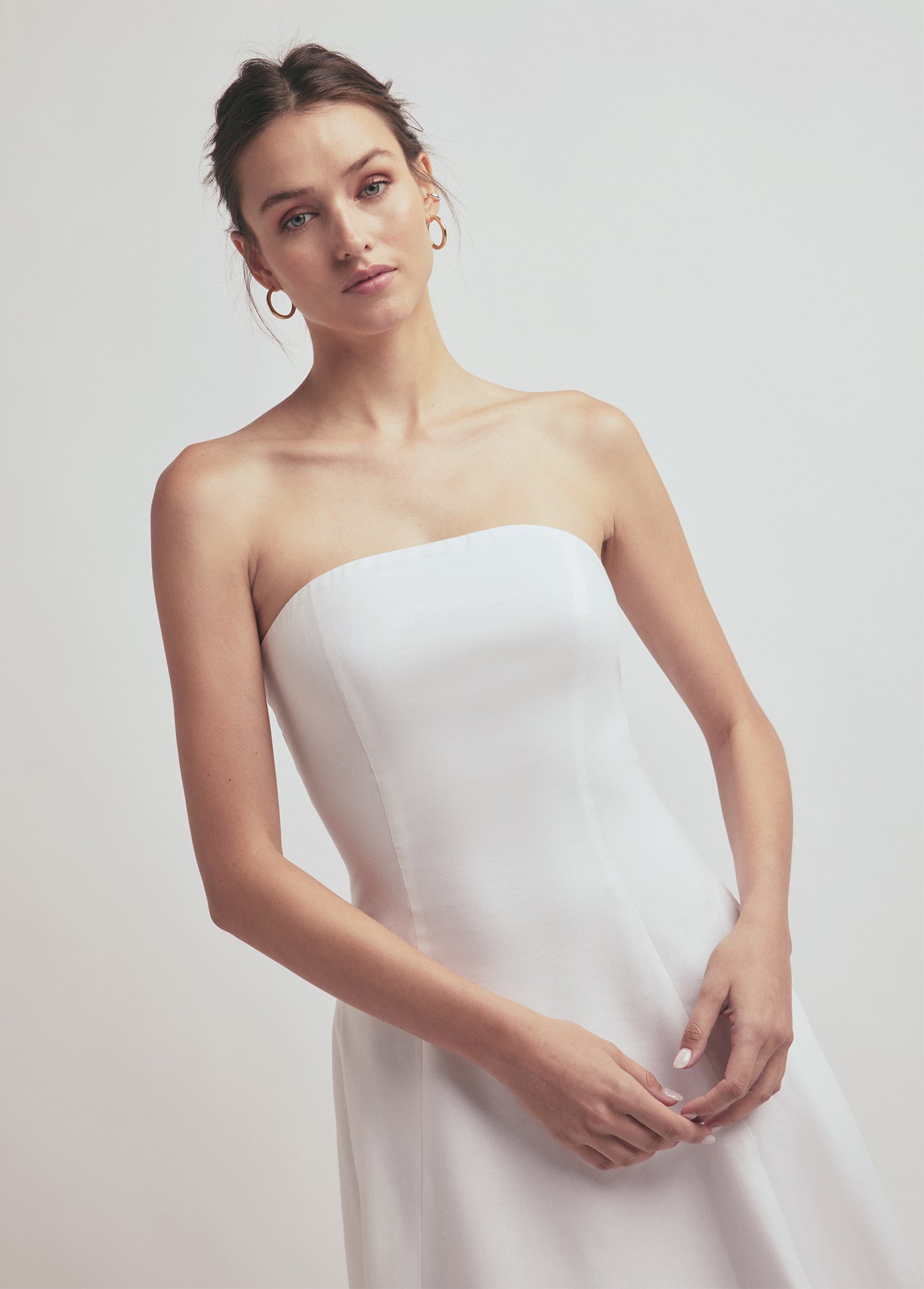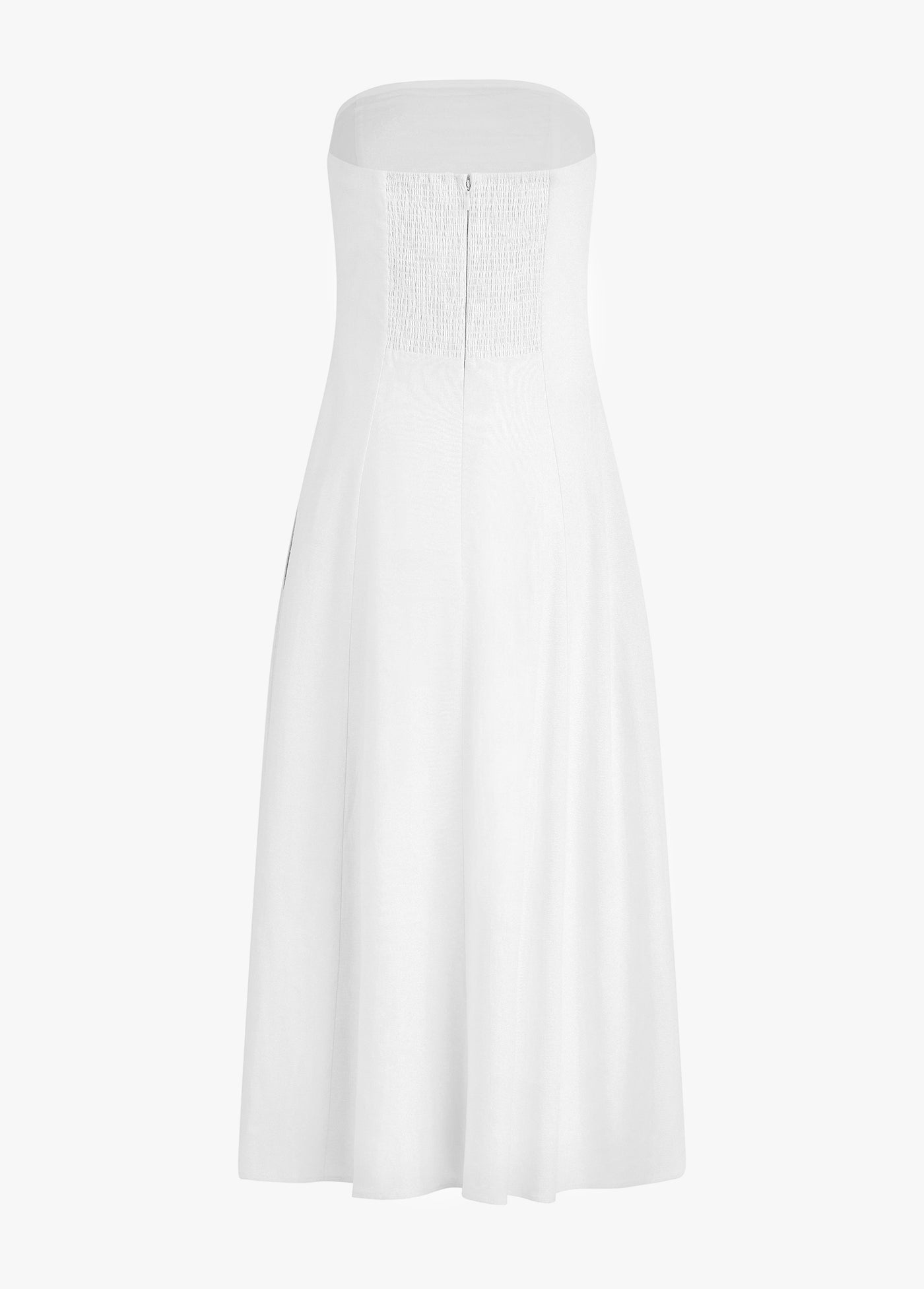 Timeless styling is what truly makes this linen-blend midi a favorite. Designed with a 55"length, classic strapless neckline, comfortable back smocking, an invisible back zipper--and, of course, side pockets (!)