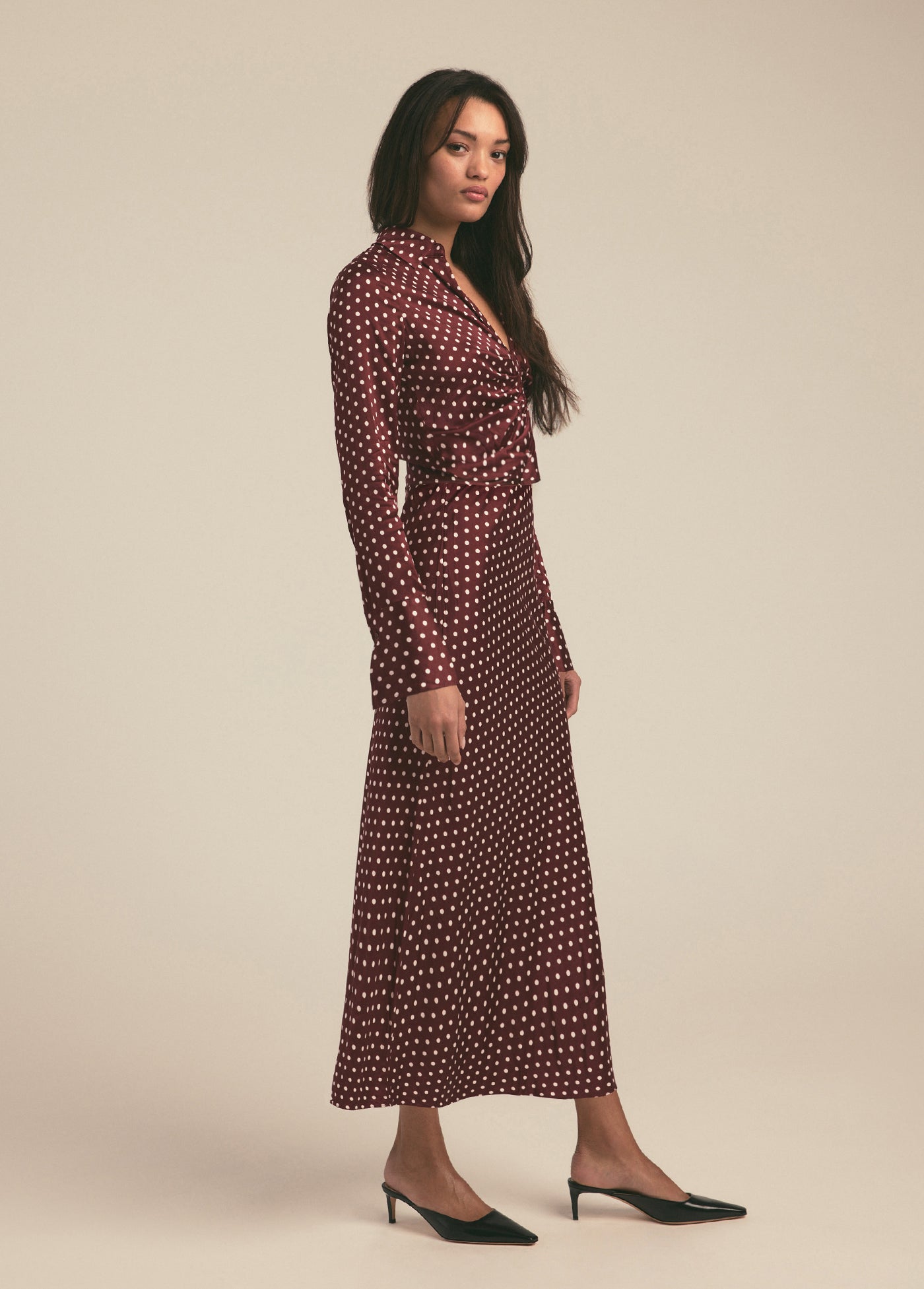 For special occasions. Any occasion, actually. The bias-cut Favorite Skirt in Sangria Ditsy Dot has a high, pull-on waist and a billowy fit that hugs in all the right places. Cut from a silky satin fabric, it's super easy to style up or down.