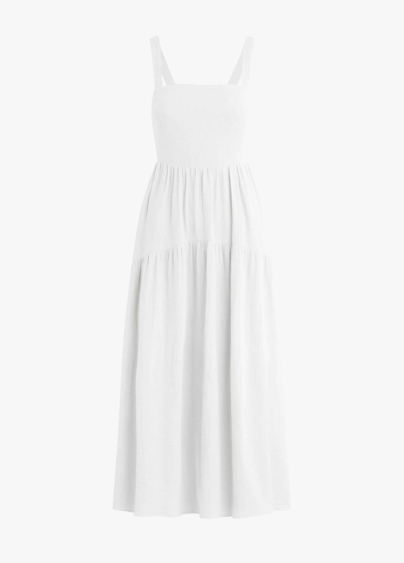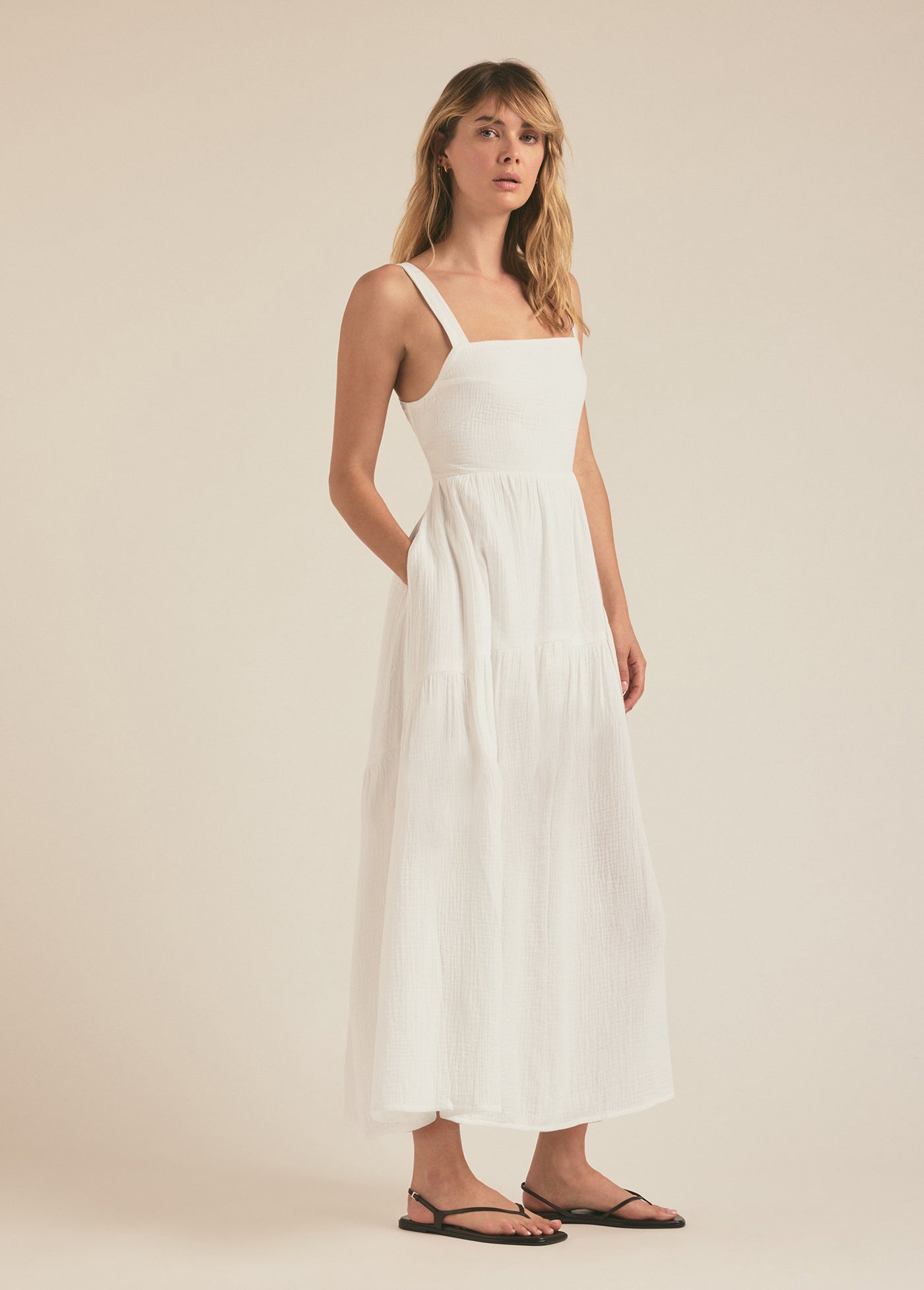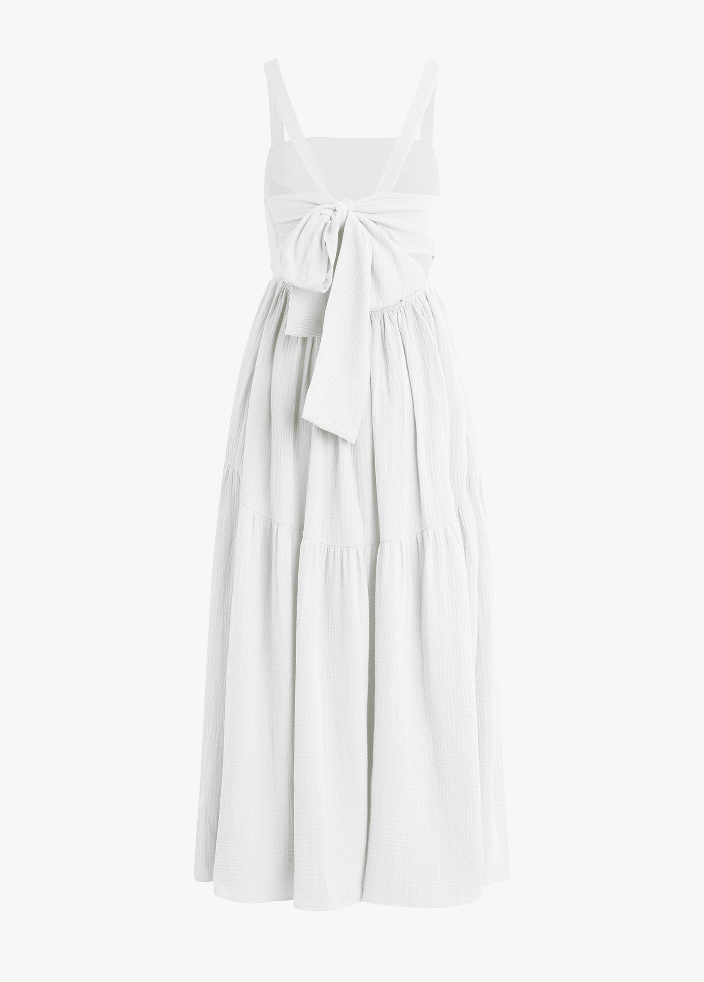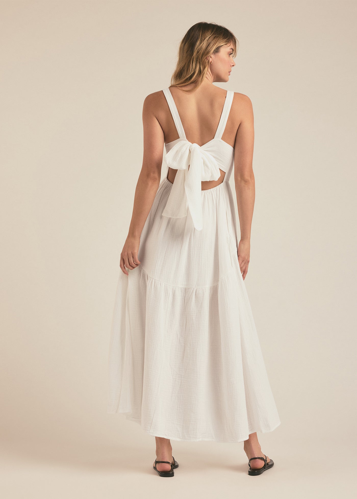 Meet your warm weather go-to. This throw-on-and-go midi has the sweetest styling with wide straps, back bow-tie detailing and an open back. The Go To Dress--with it's fitted bodice and flowy, paneled skirt--is cut from a lightweight, double cotton gauze for an airy look and feel.