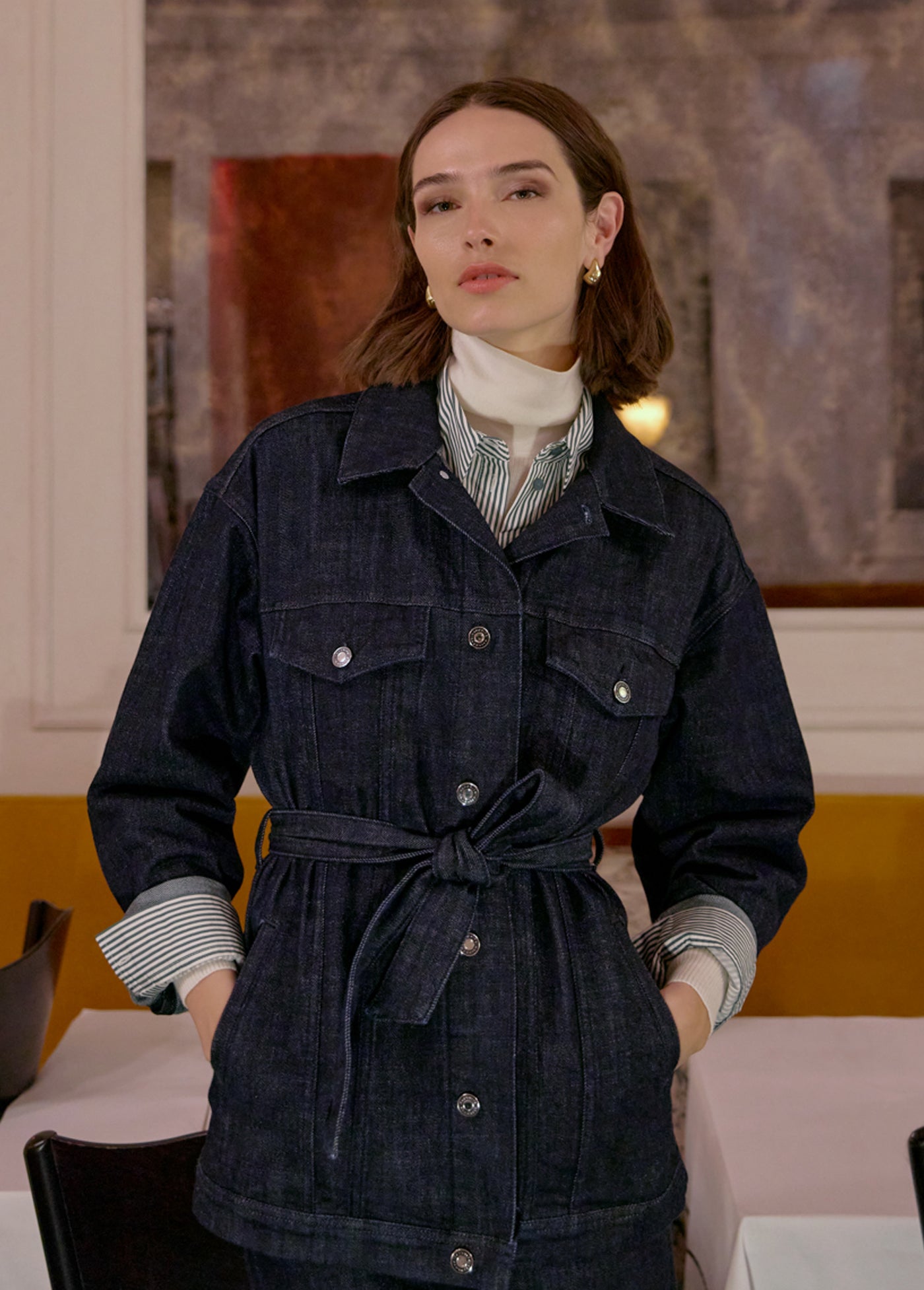 Cut from a rich blue wash in lightweight, comfort stretch denim, The Jane Trench is where classic meets cool. It's designed with dropped shoulders, a pointed collar, chest flap pockets and welt pockets at the hips. Our favorite feature is the removable belt for boxed or cinched styling.