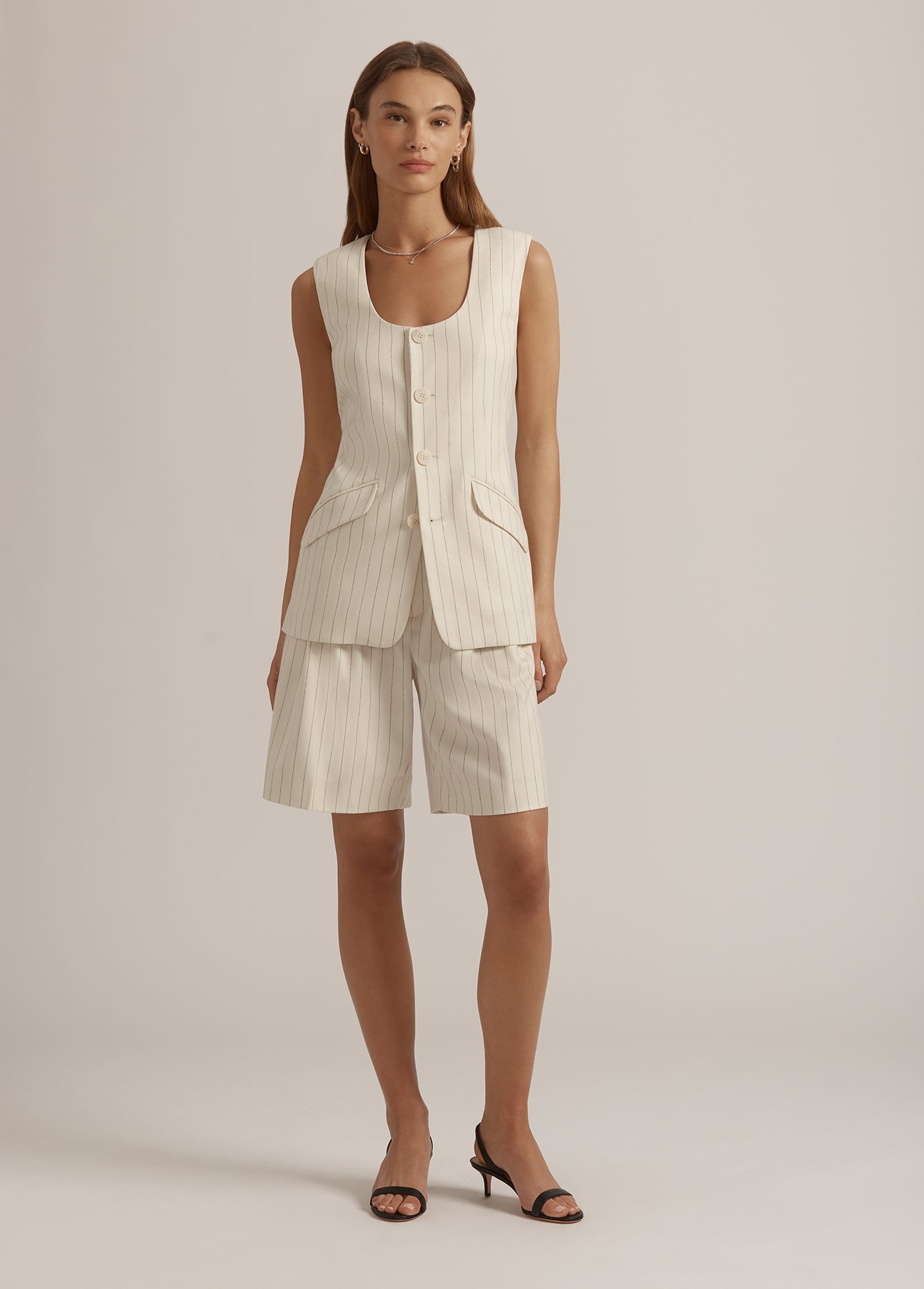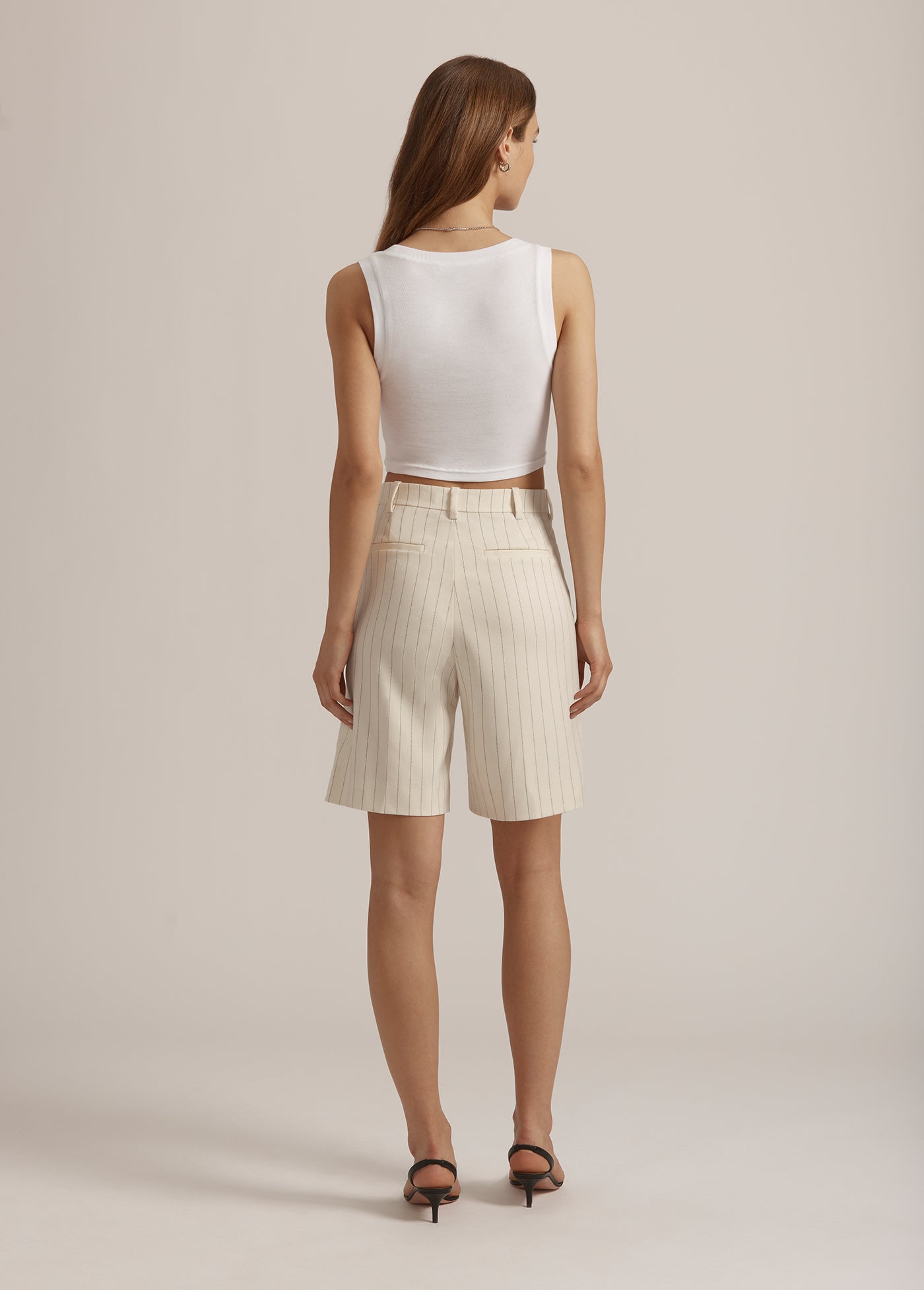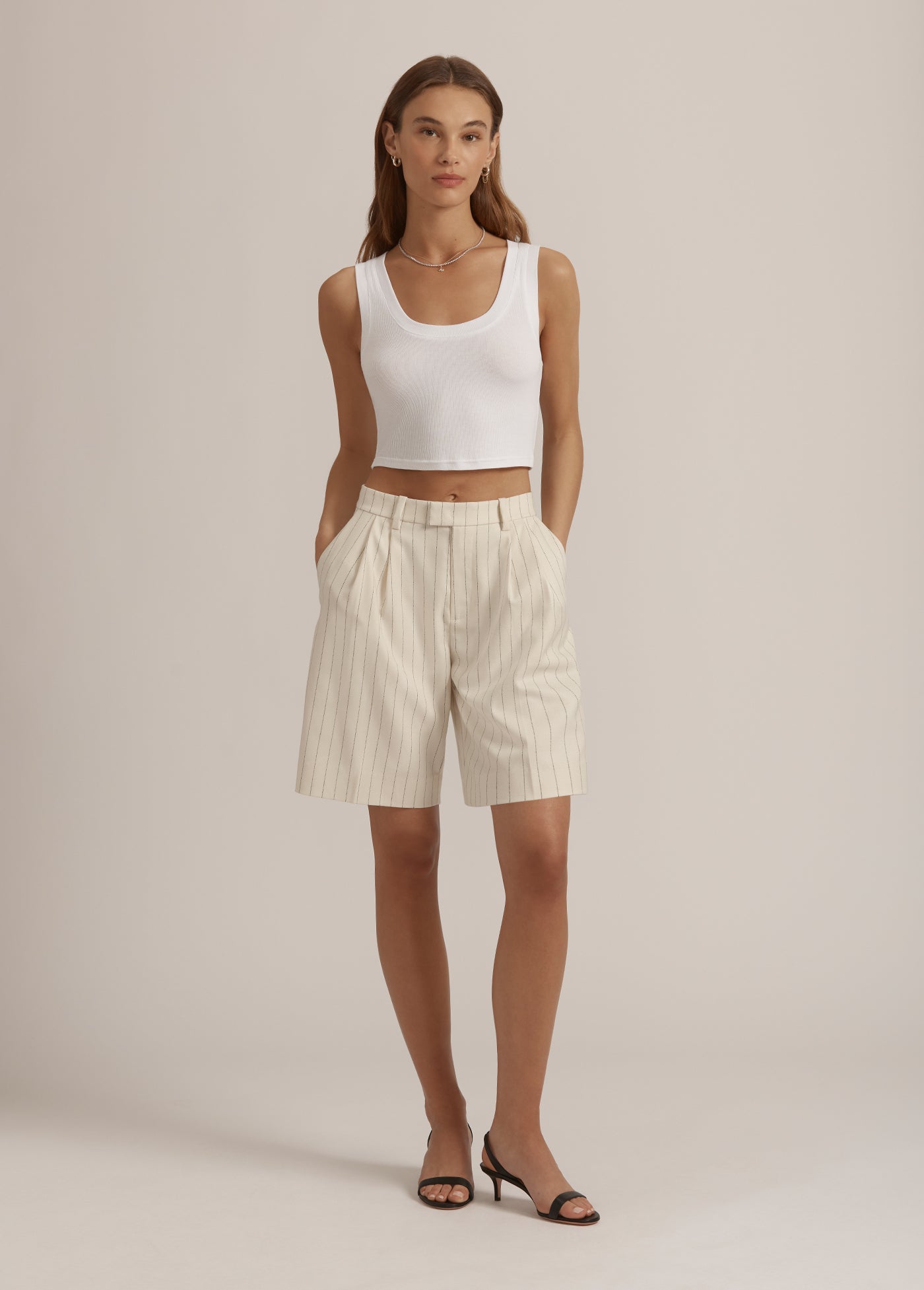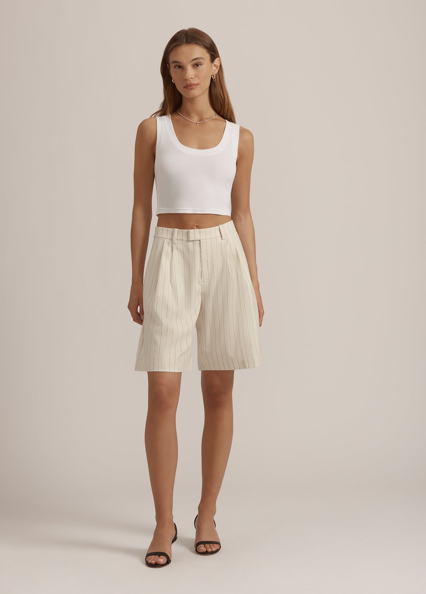 Long story short. We took the best-selling Low Favorite Pant—with front pockets, inverted front pleats and a 11.4" mid-rise waist—and recreated the tailored beauties as 9" Bermuda-length shorts. Crafted from a pinstripe suiting blend, The Low Favorite Short has a relaxed fit for a chic, work-to-weekend look.