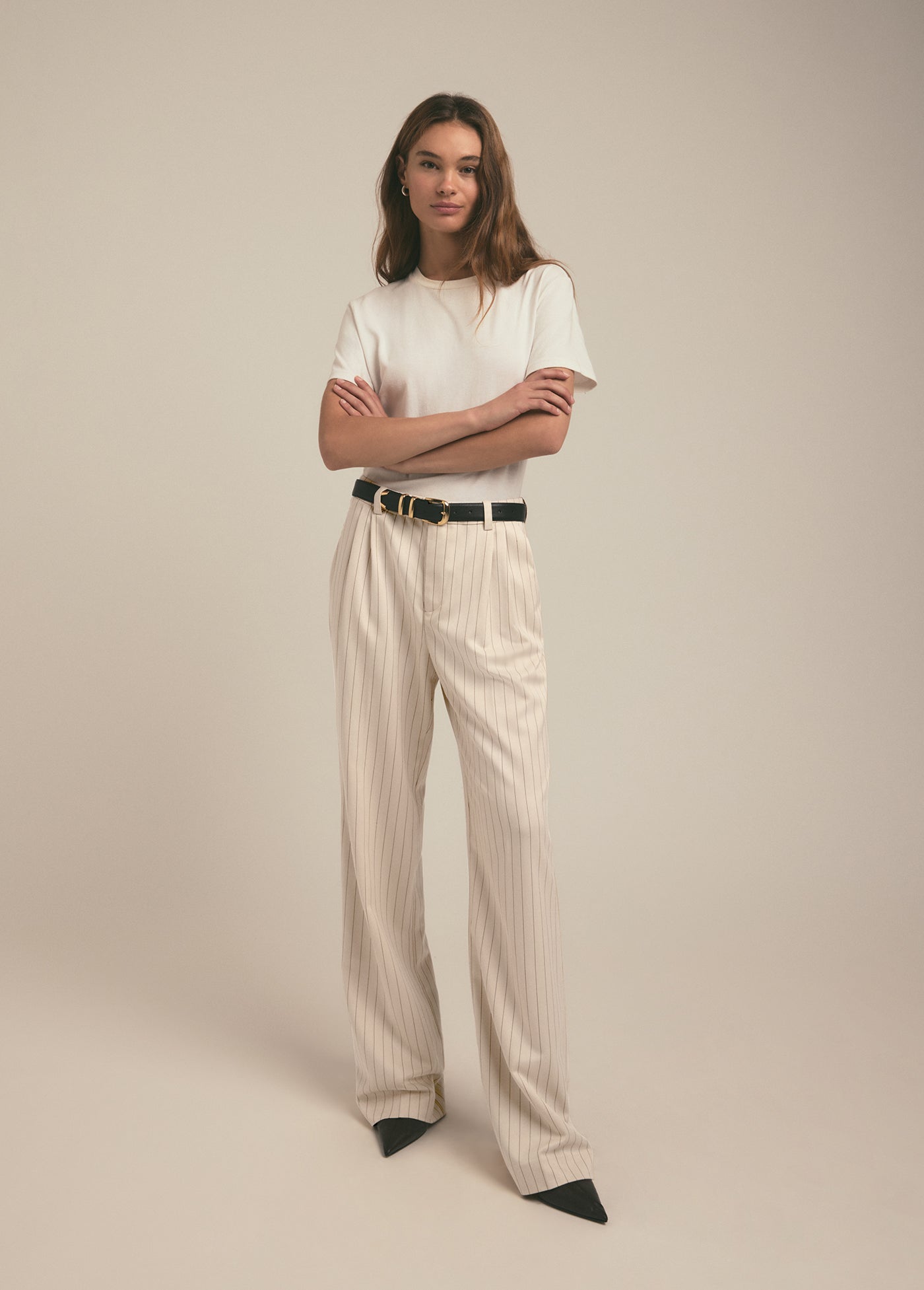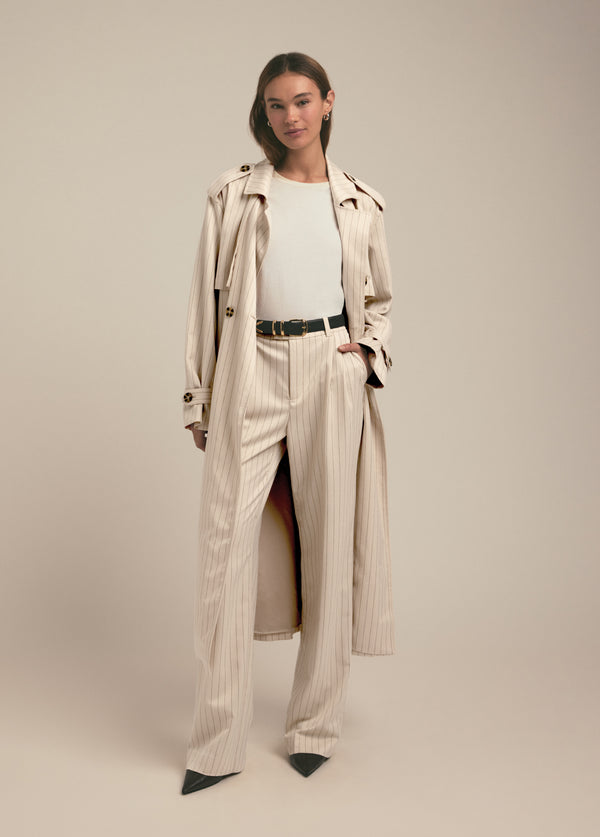 The Low Favorite Pant is our best-selling mid-rise trouser, crafted from a soft viscose-blend pinstripe. With a fluid wide-leg silhouette and front pleats, these trousers will be the most timeless piece in your closet.