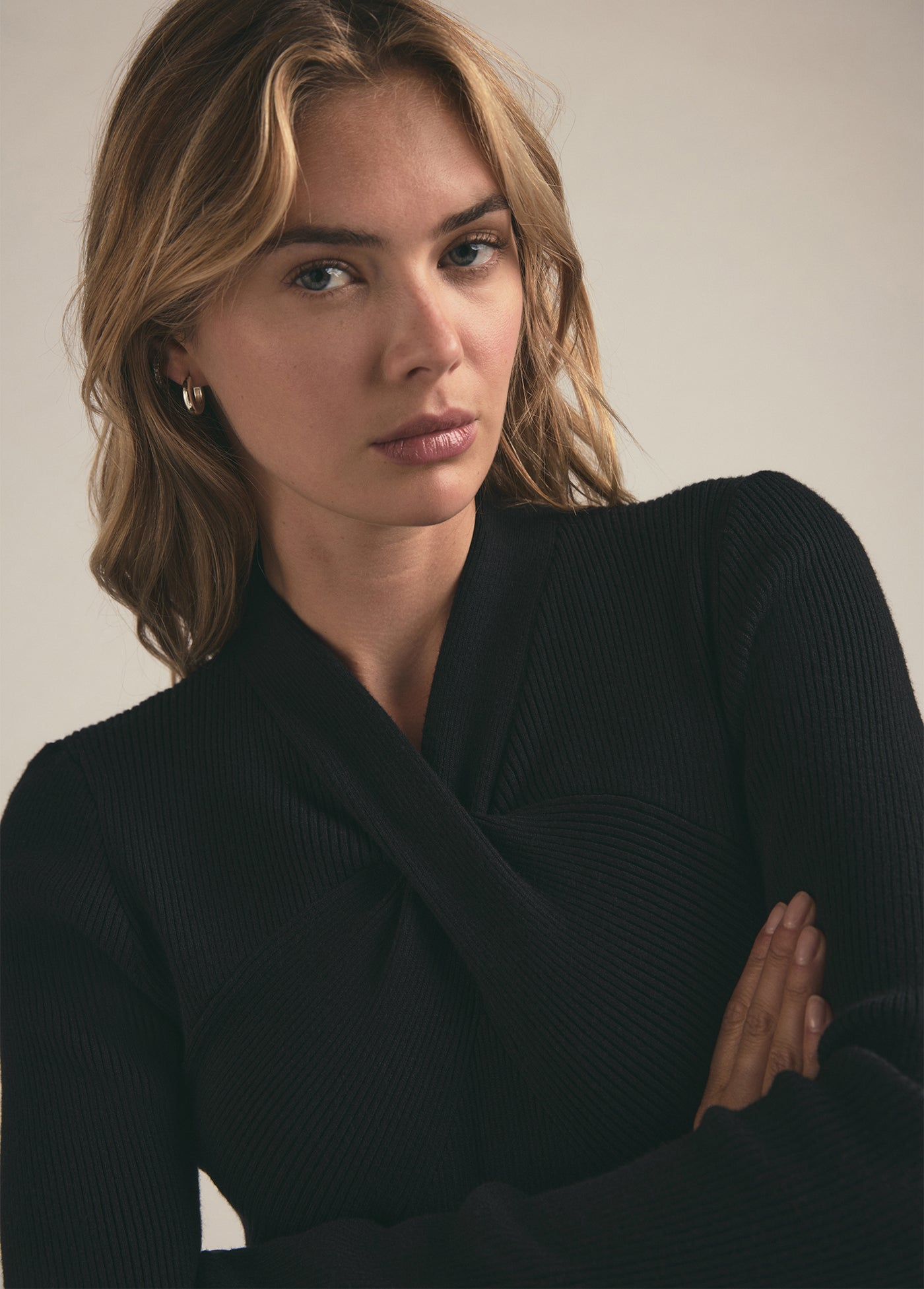 You've got the look. The Made You Look Dress is made to be noticed. Cut from a rib knit that keeps its slim shape, it's a full-length dress with long sleeves and a twisted neckline detail.