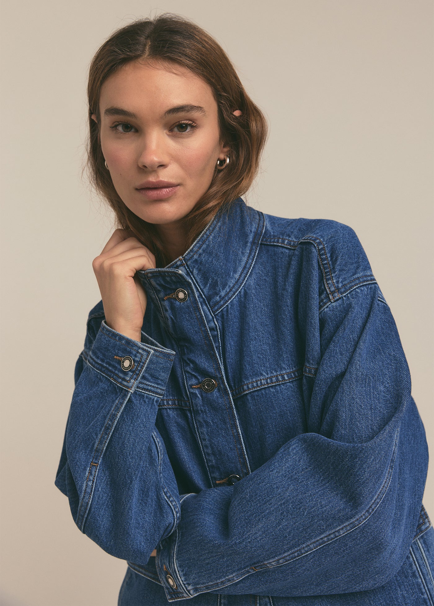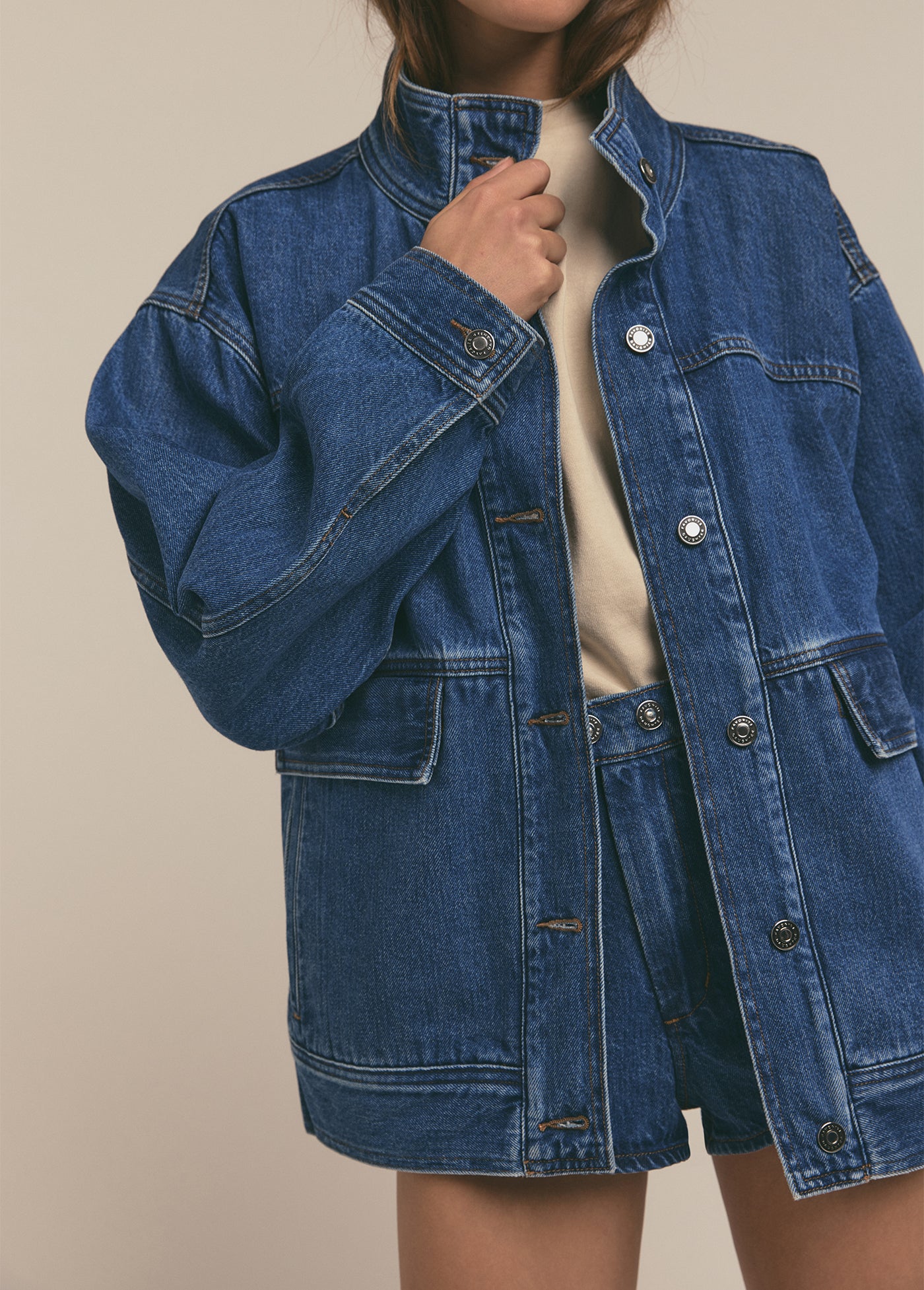 Oversized in classic medium blue denim to create our favorite jean jacket. With a wide stand-up collar, front button closure, welt pocket detailing, waist flap pockets and hidden side slit pockets, The Margot Jacket in Los Angeles is the perfect layer in the most perfect lightweight rigid denim. For head-to-toe styling, pair it with The Hot Shorts in the same wash.