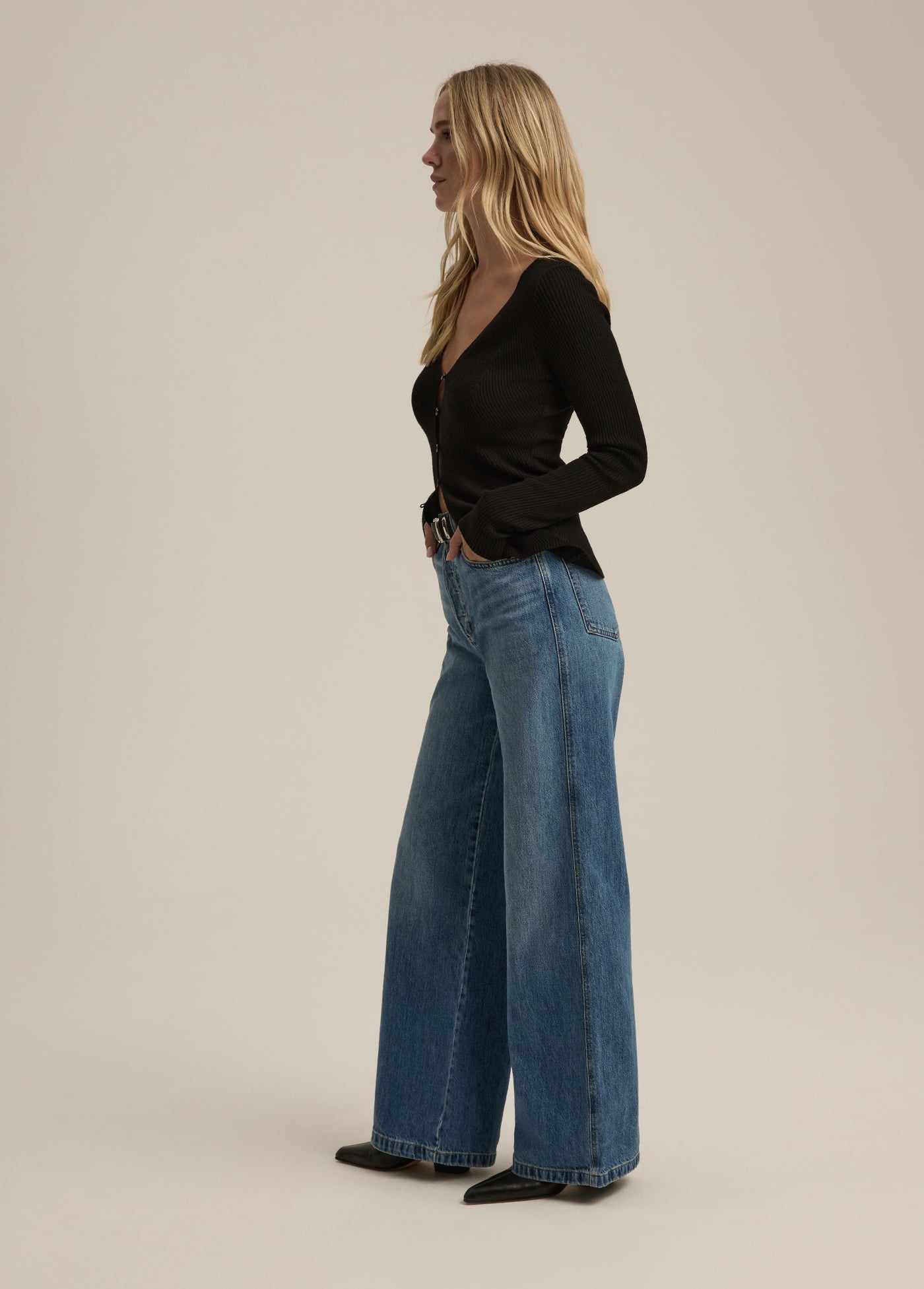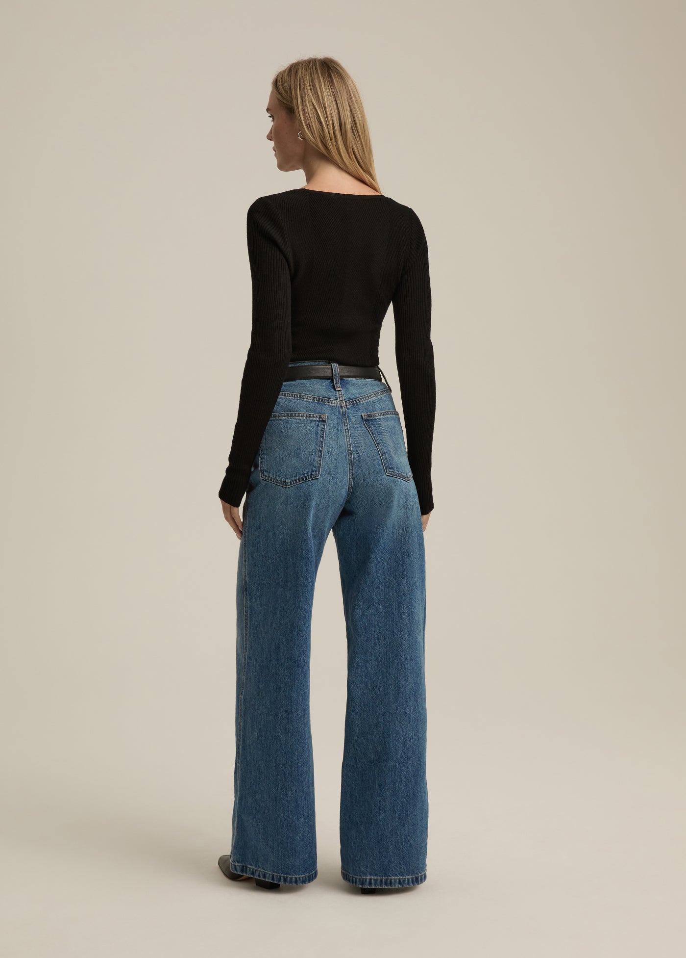 The Masha is a 33" full length, five-pocket style with a 12" super high rise and slightly pinched waist. The wide-leg fit is easy at the hips and thigh with a generous hem that’s styled to sweep the floor. Cut from rigid denim (that just gets better with each wear), the Long Beach wash is a vintage medium blue with worn-in stying on the wide legs.