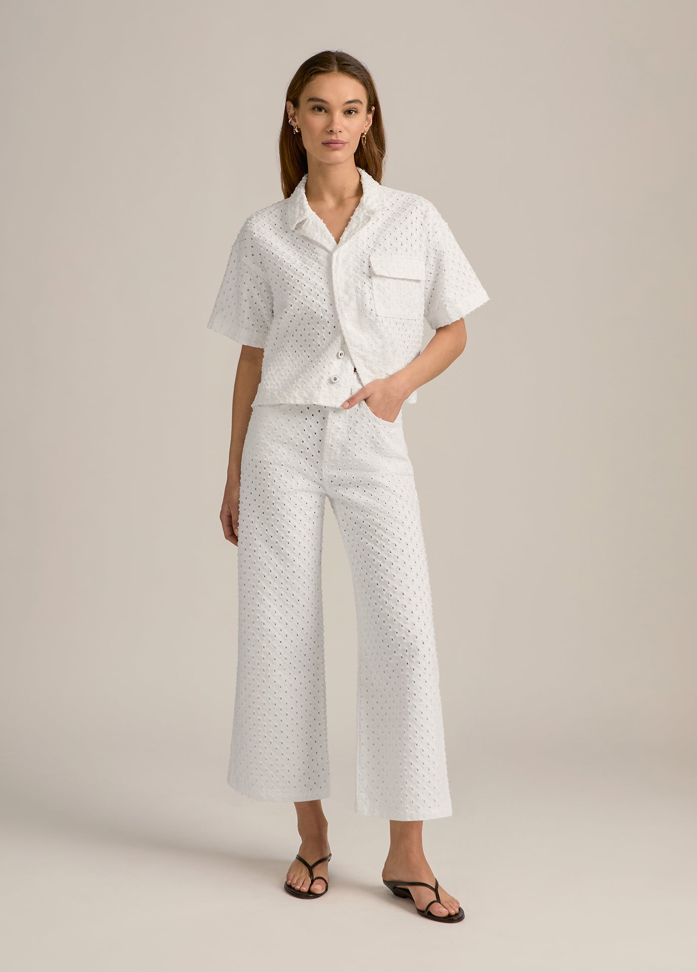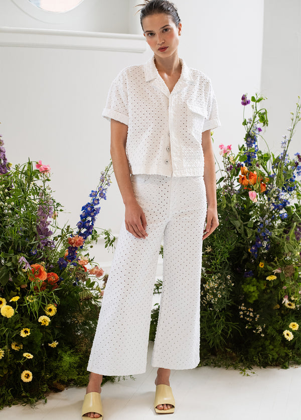 The Masha is a cropped 26.5" length, five-pocket style with frayed eyelet details for a perfectly undone feel. Made from rigid white denim, these jeans sit high on the waist with an 11.75" rise and are fitted through the hips for a flattering silhouette. Pair with The Micha Shirt for a monochromatic denim-on-denim set.