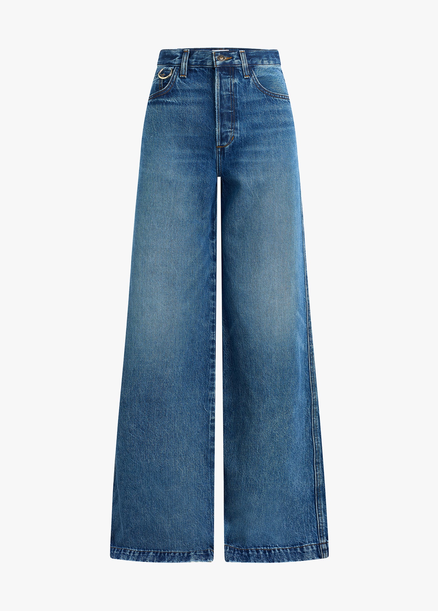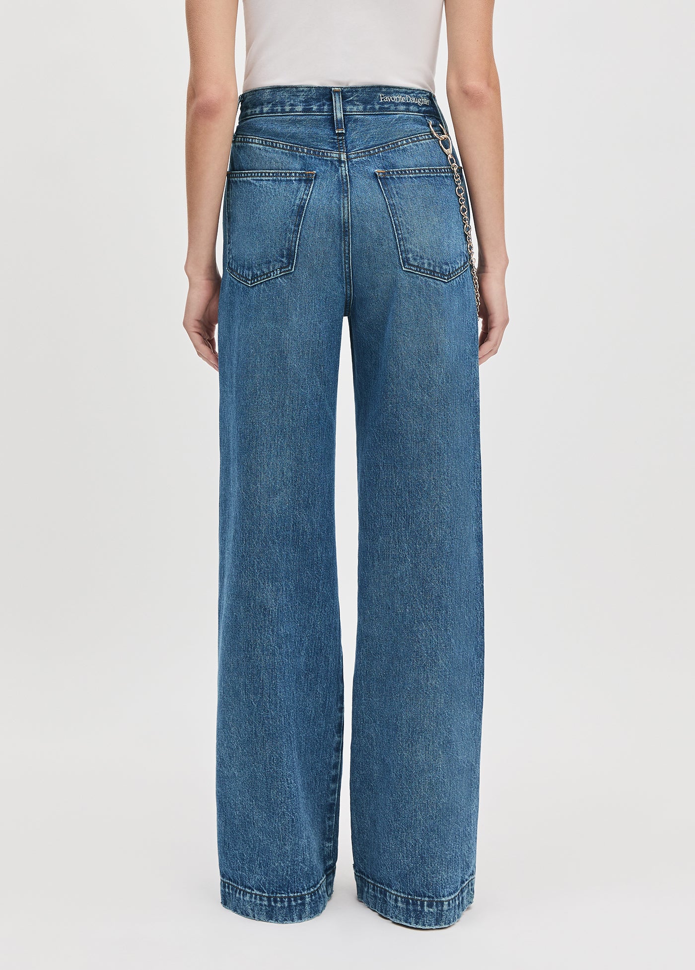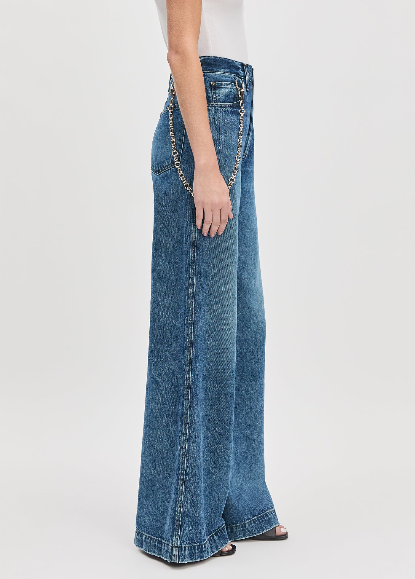 The Masha is a 33" full-length, five-pocket style with a 12" super high rise and slightly pinched waist. The wide leg fit is easy at the hips and thigh with a distressed hem that’s styled to sweep the floor. Cut from rigid denim (that just gets better with each wear), the Dillion wash is a vintage medium-dark blue with whiskering and a removable gold chain D-Ring detail.
