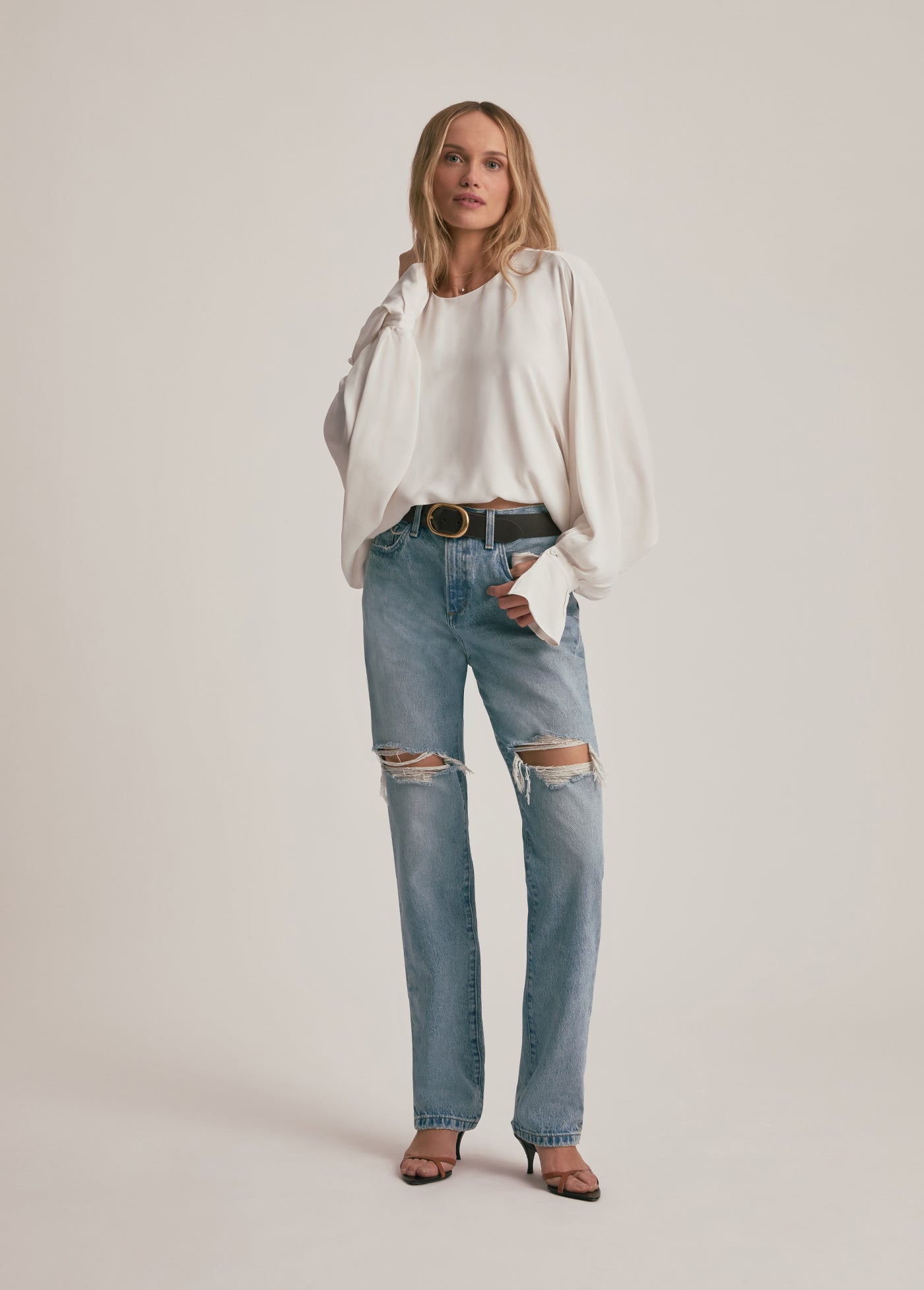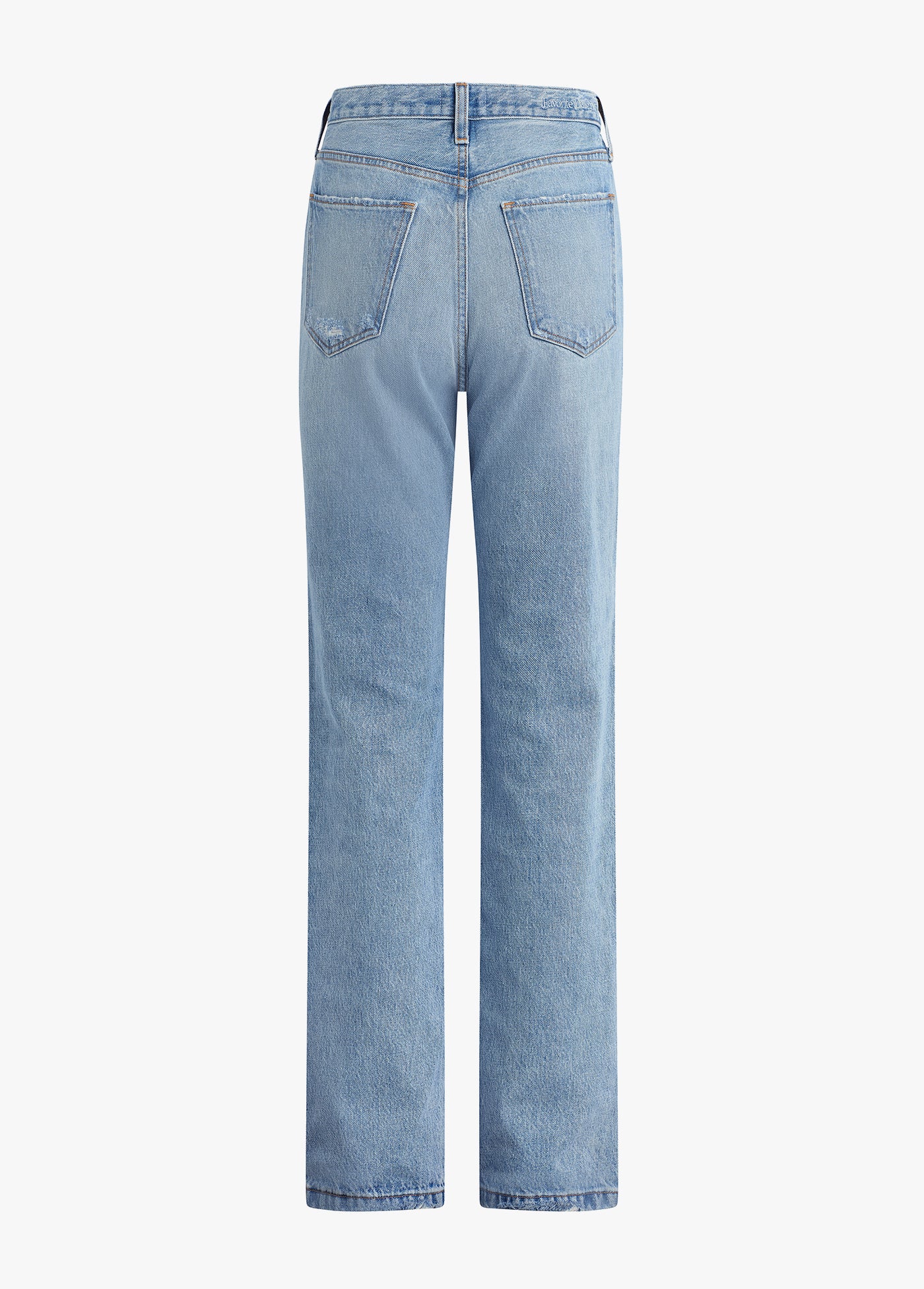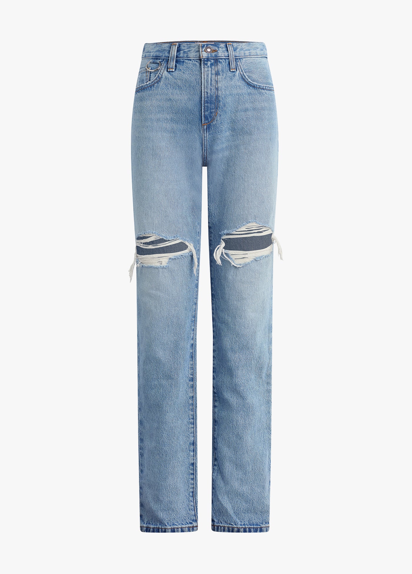 Your 5-pocket favorite is here. With a low-slung look that's easy at the waist and hips with a 12" rise, The Mikaela features a long, slim-straight fit that effortlessly skims and pools at your shoes thanks to the 34" inseam. Cut from rigid denim in our Lenox wash—a light blue with worn-in whiskering, destruction above the knees and grinded hems—this pair is designed for laid-back style.
