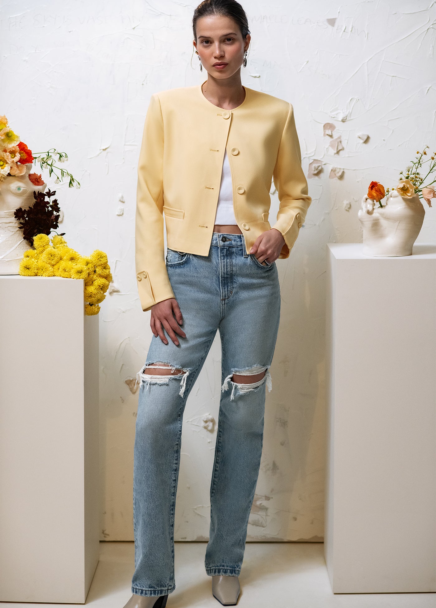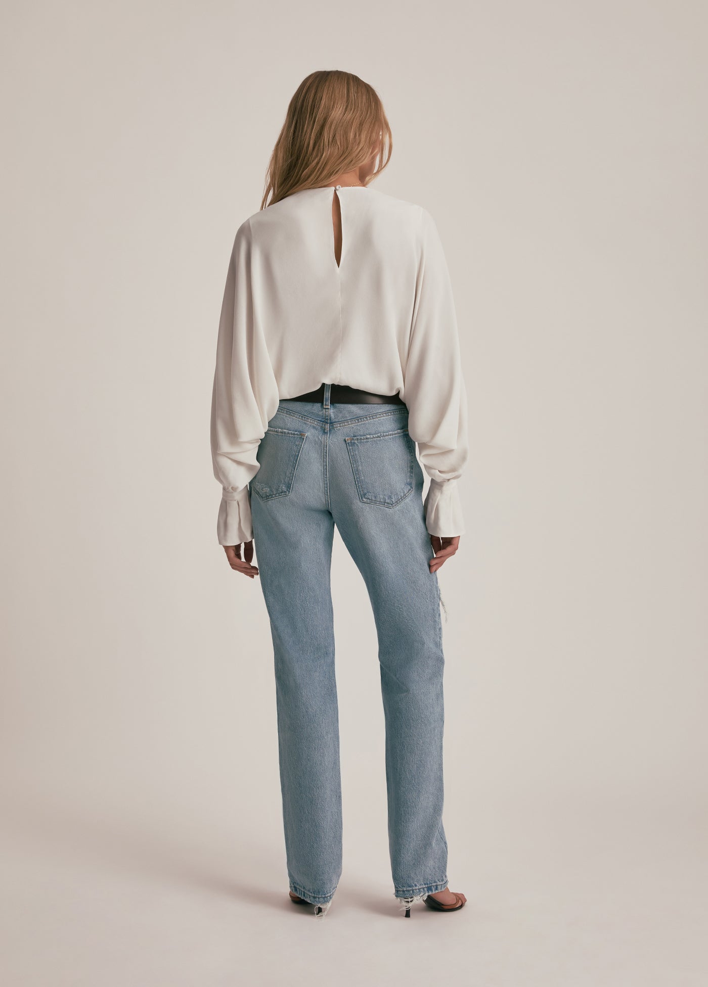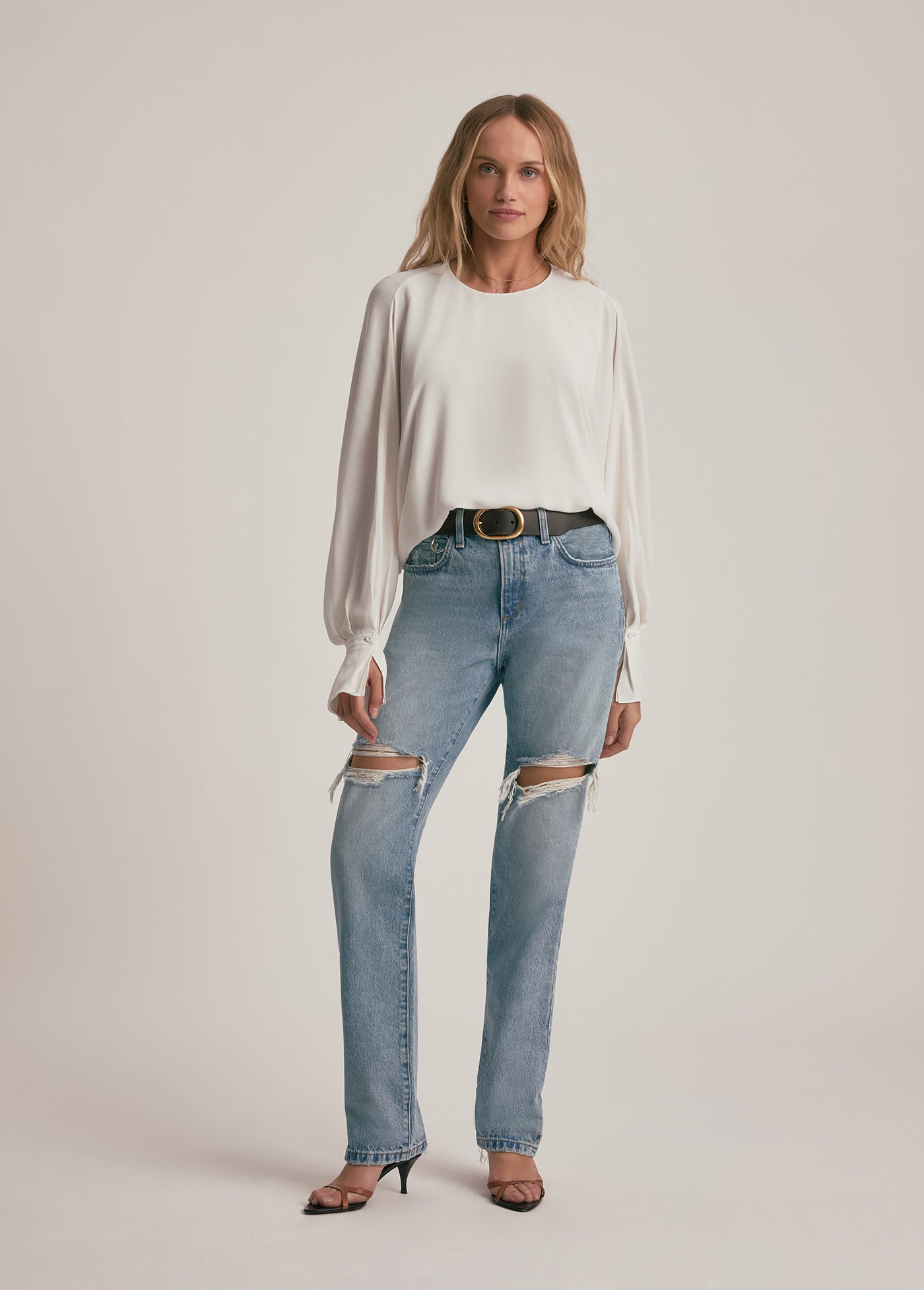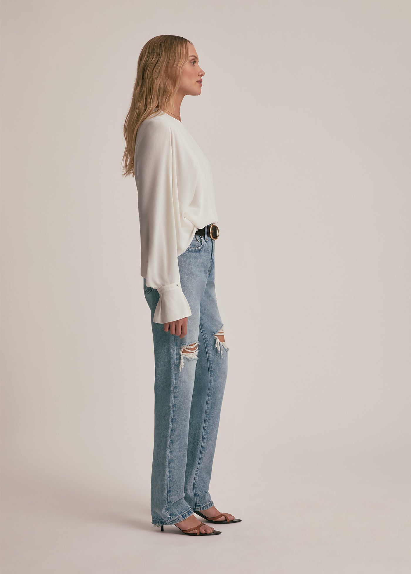 Your 5-pocket favorite is here. With a low-slung look that's easy at the waist and hips with a 12" rise, The Mikaela features a long, slim-straight fit that effortlessly skims and pools at your shoes thanks to the 34" inseam. Cut from rigid denim in our Lenox wash—a light blue with worn-in whiskering, destruction above the knees and grinded hems—this pair is designed for laid-back style.