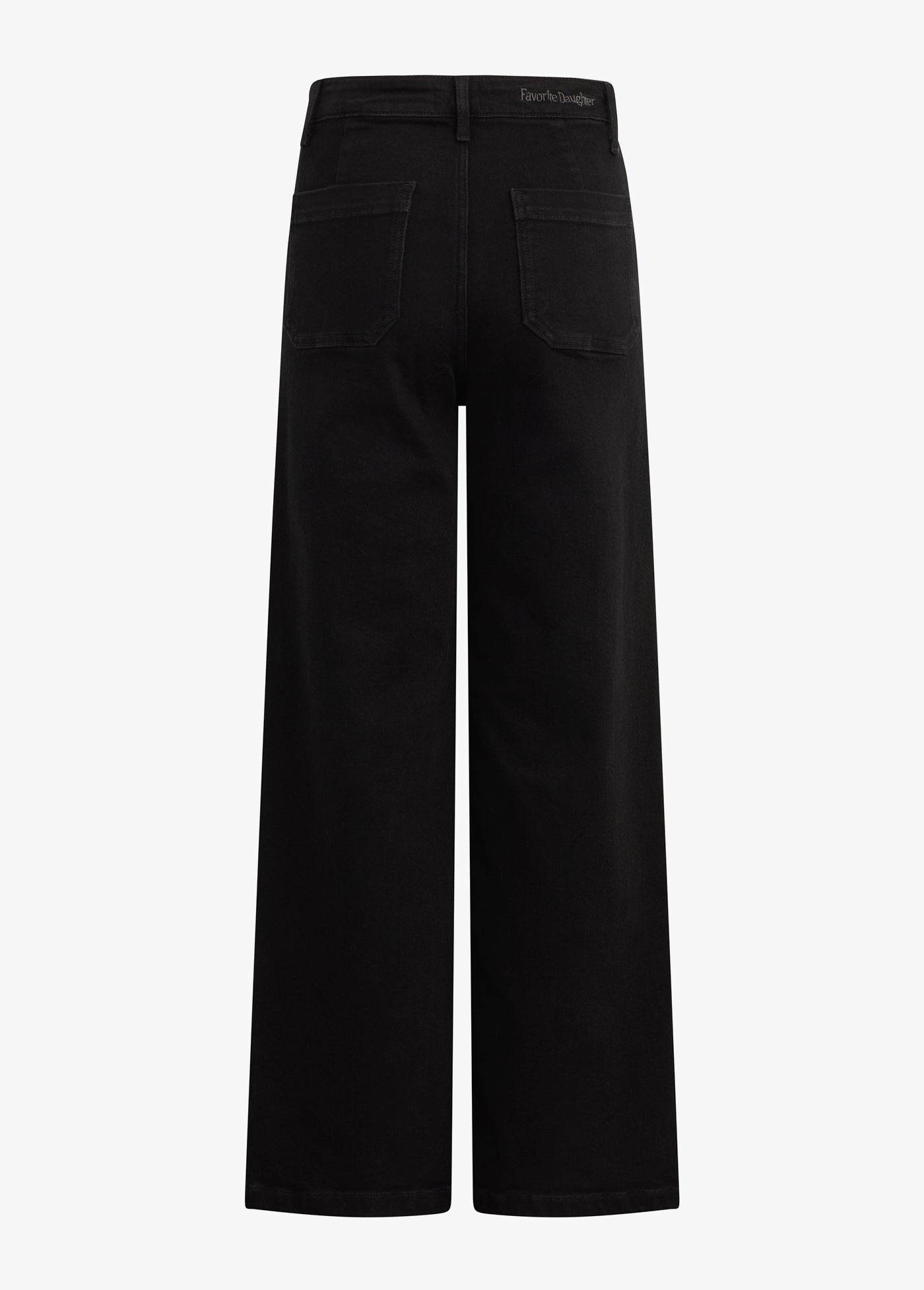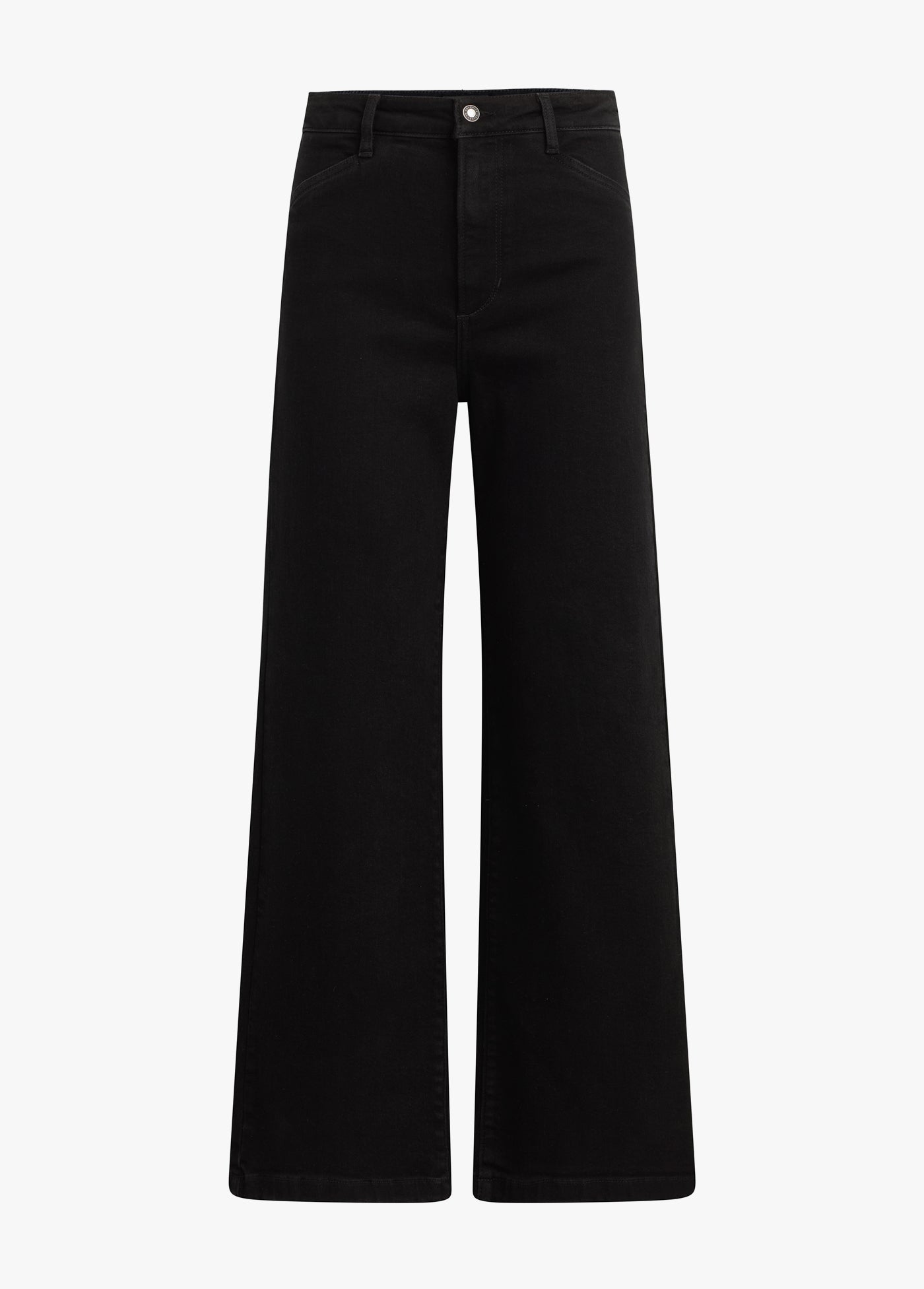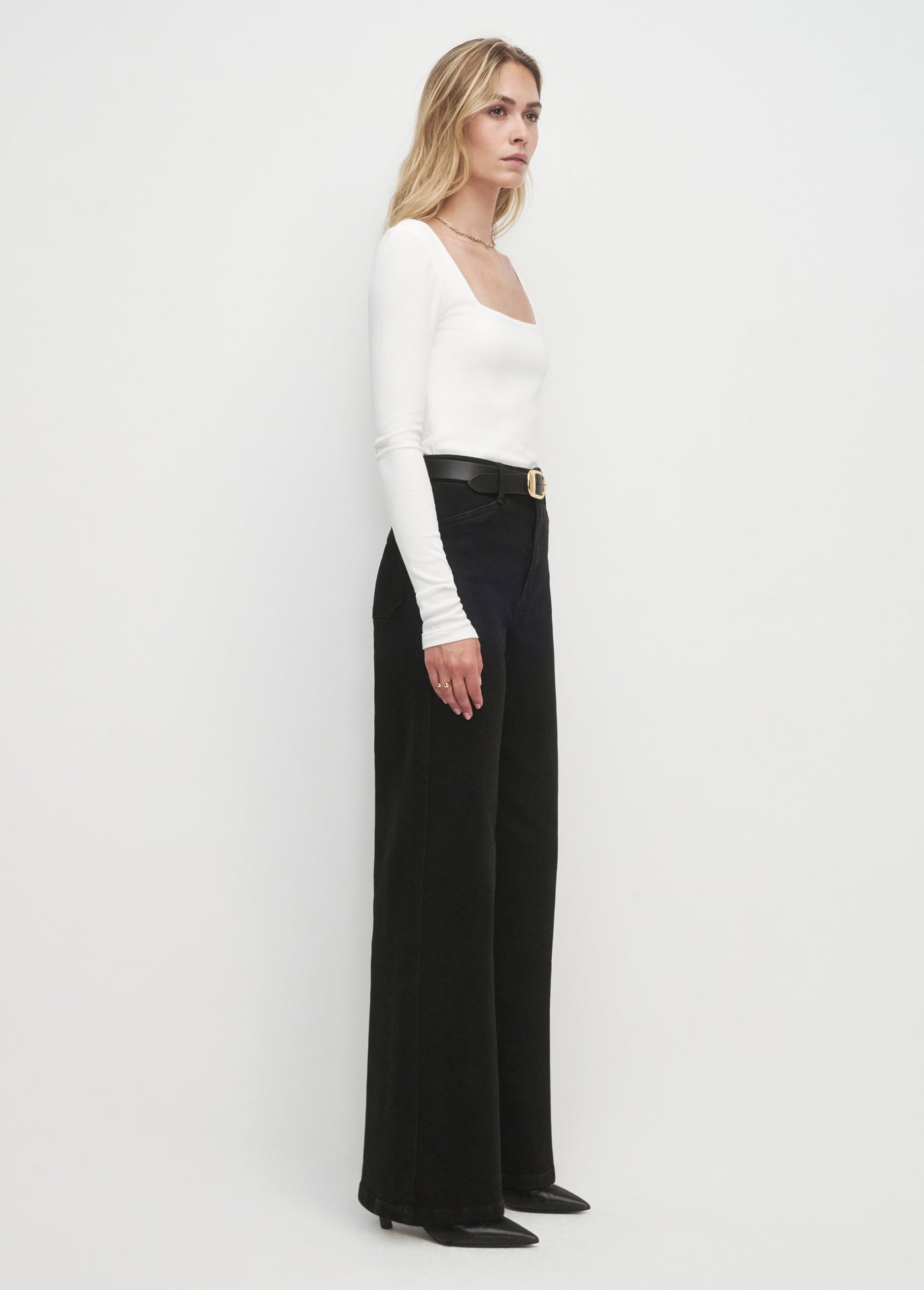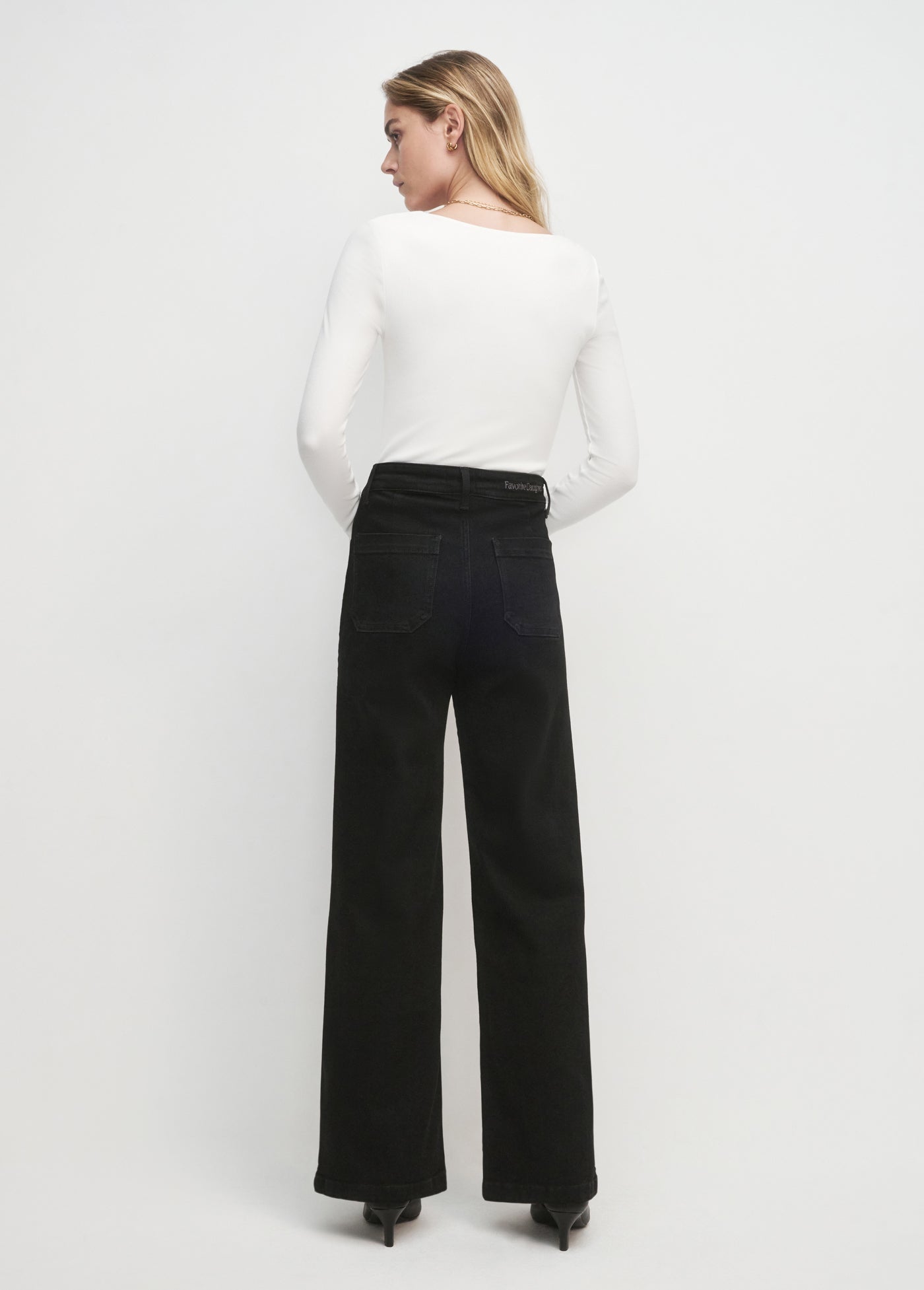 The wide leg, wide hem Mischa jean has a 11.75" super high-rise that's slightly pinched at the waist and fitted through the hips with a 32" inseam. The black rinse Onyx wash fades over time and is cut from super stretch denim that hugs all the right places.