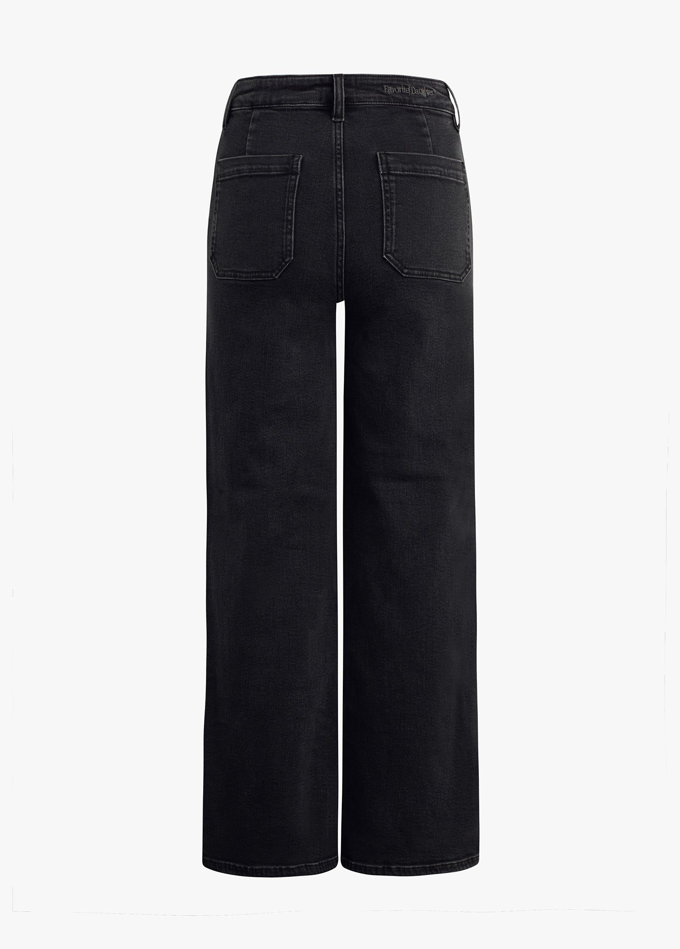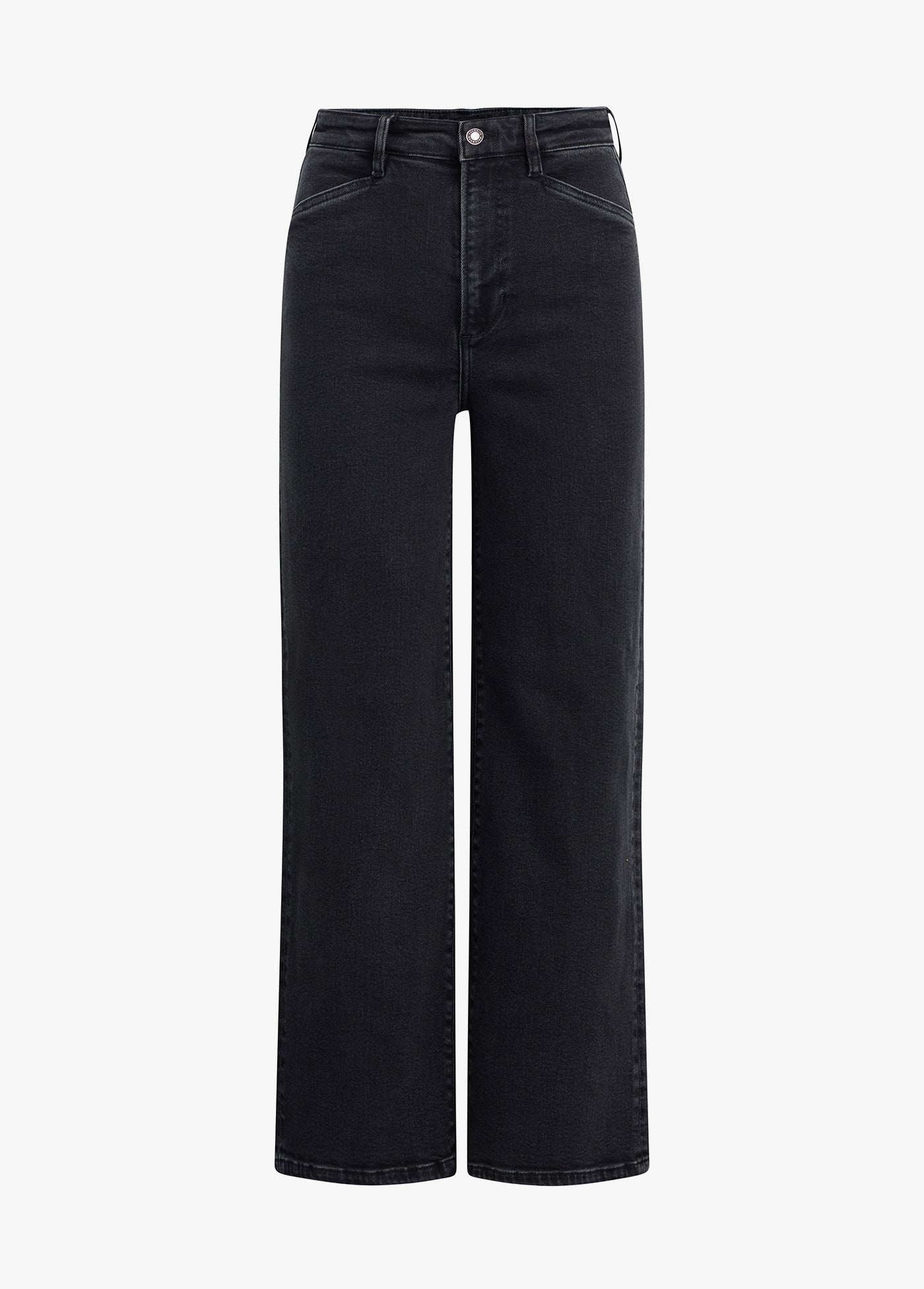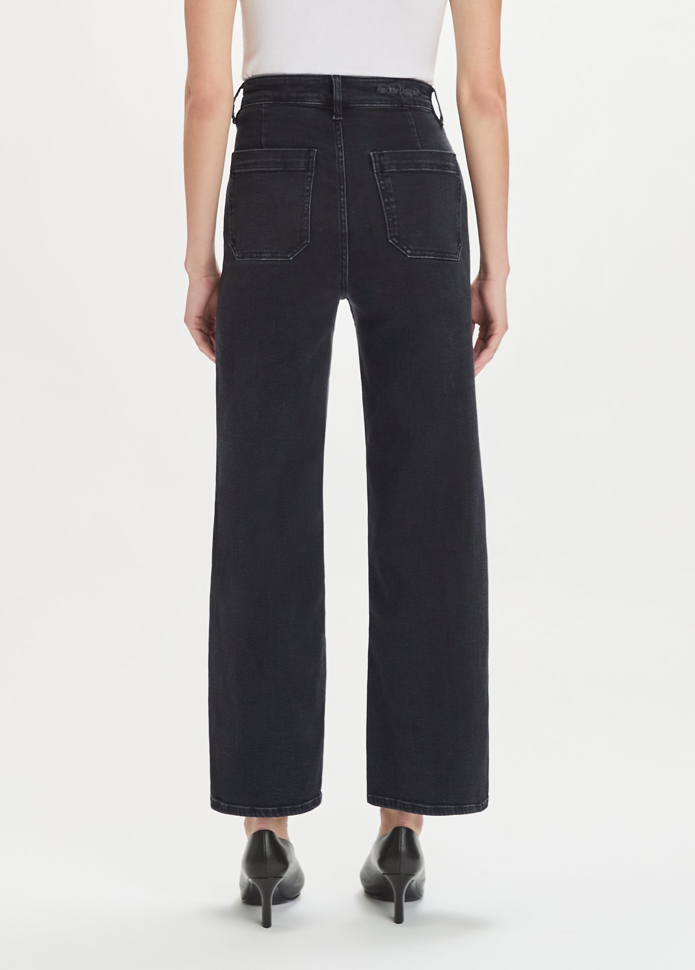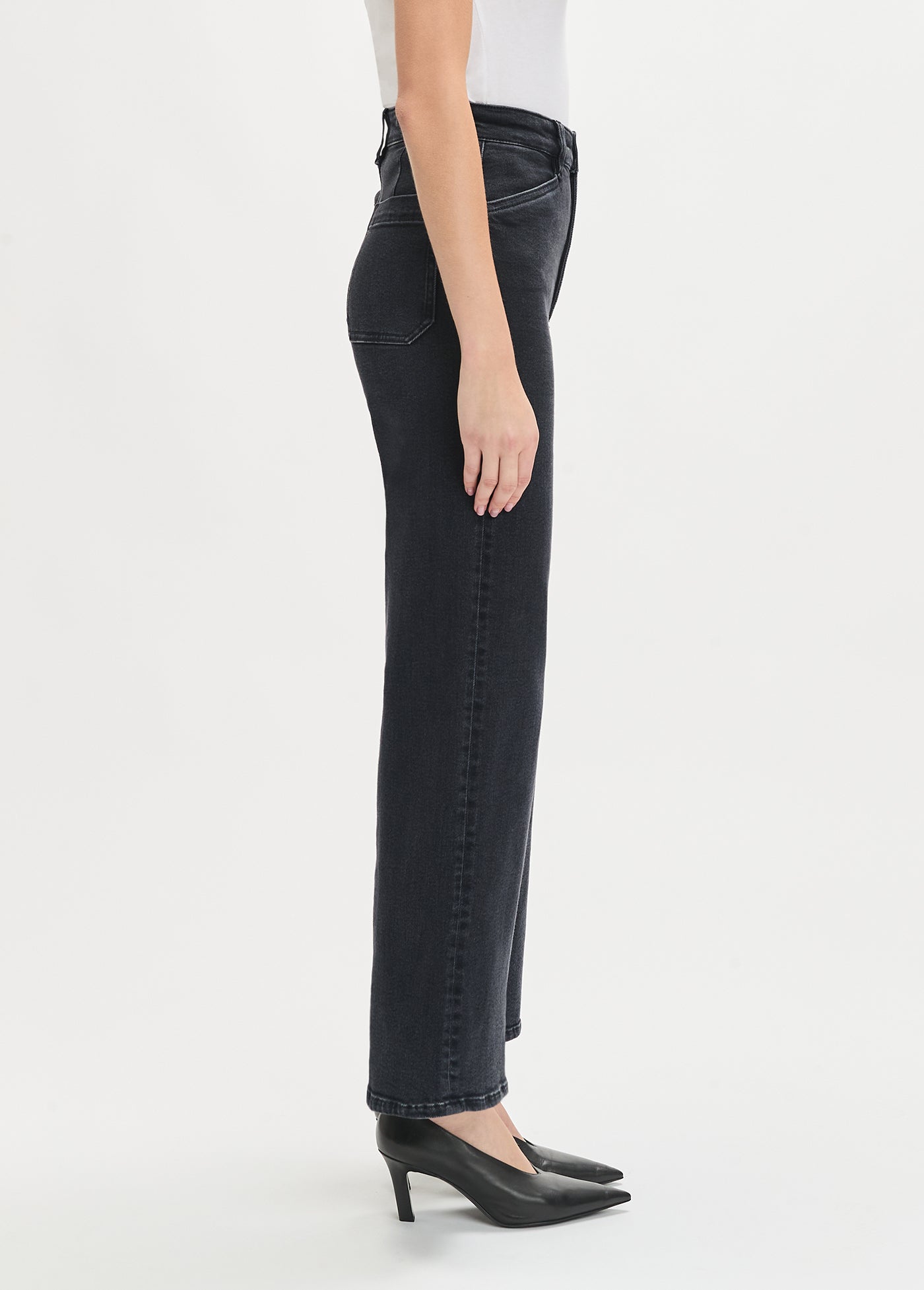 The wide leg, wide hem Mischa jean has a 11.75" super high-rise that's slightly pinched at the waist and fitted through the hips with a 32" inseam. The charcoal-base black Tupelo wash is cut from super stretch denim that hugs all the right places.