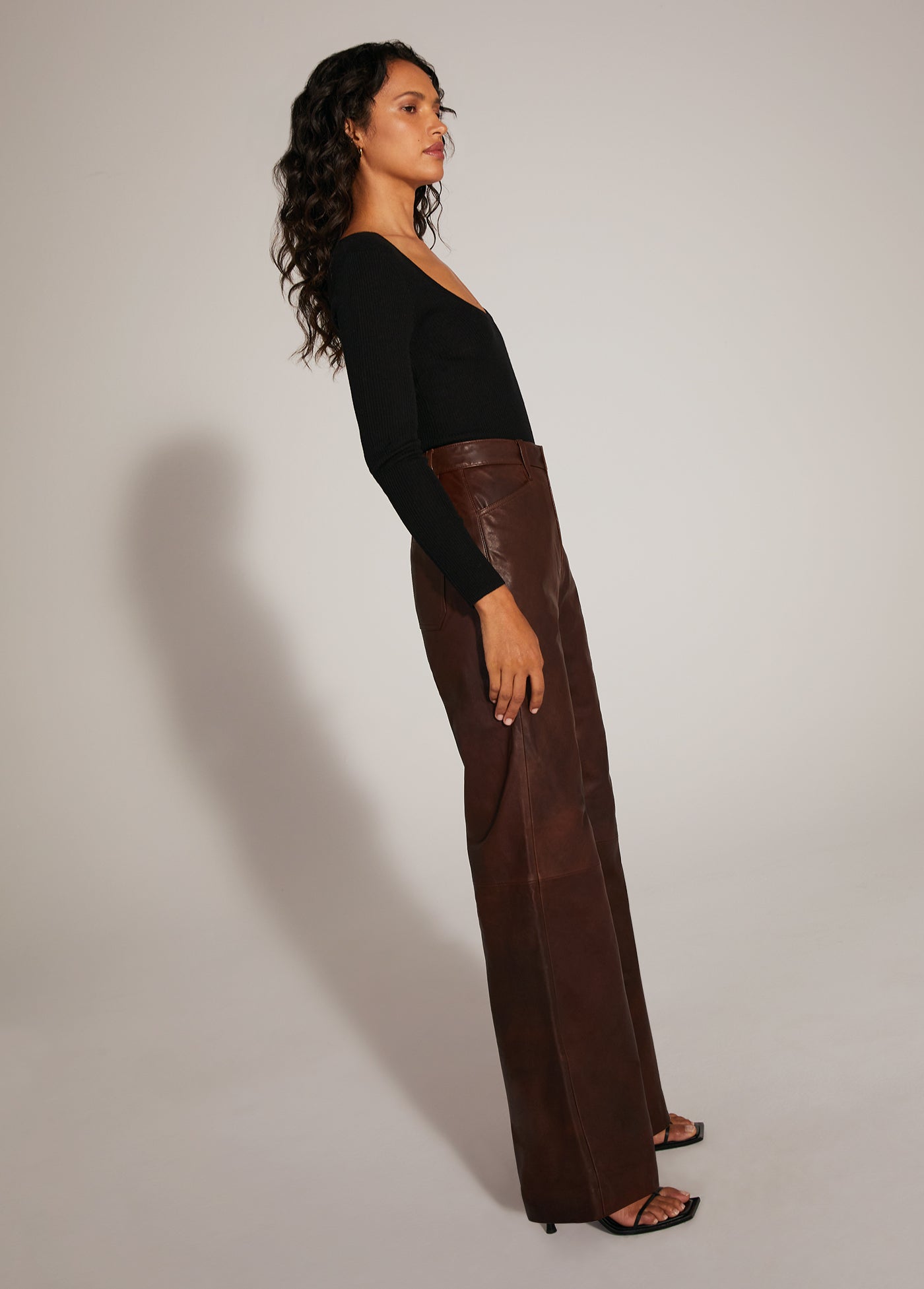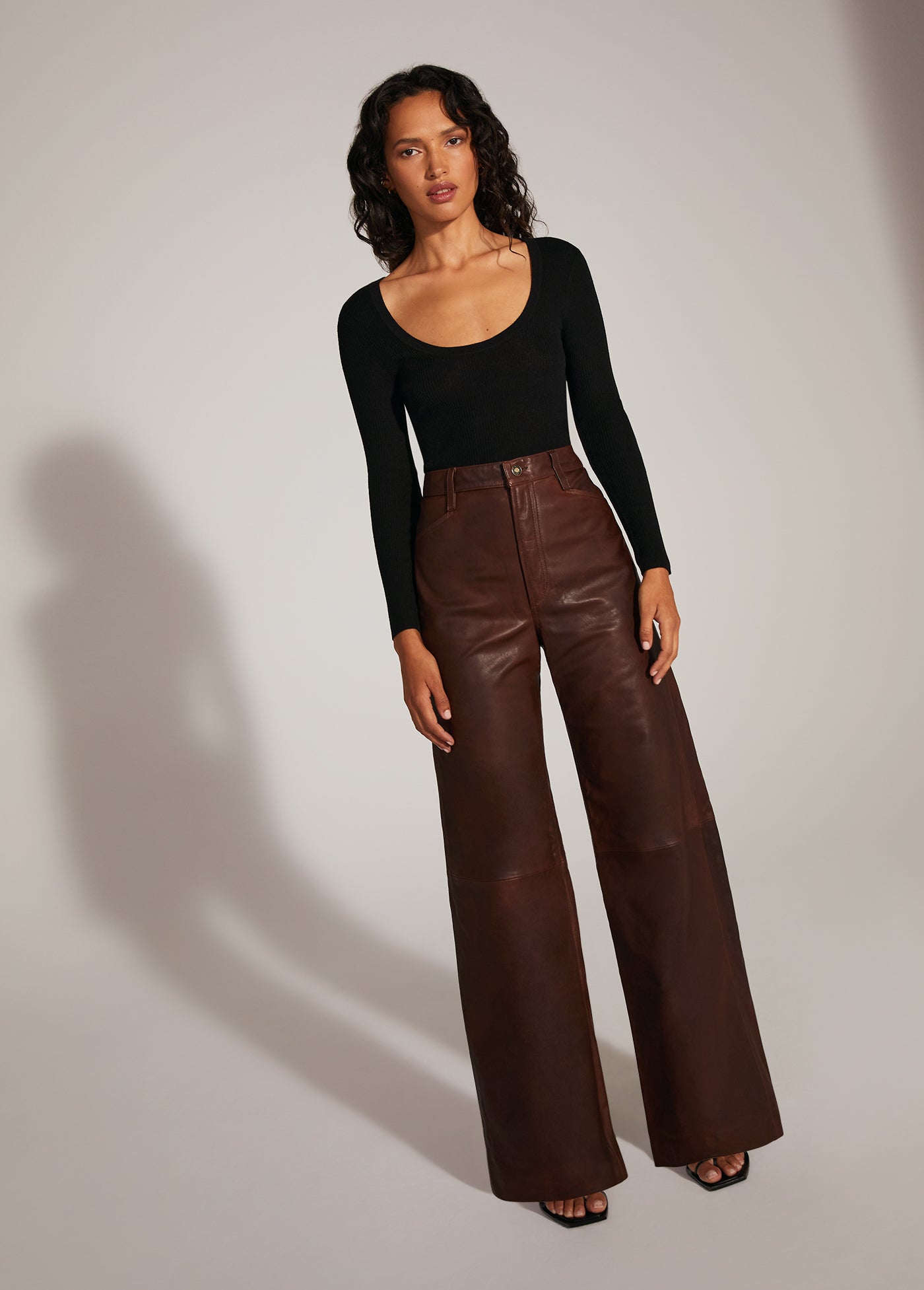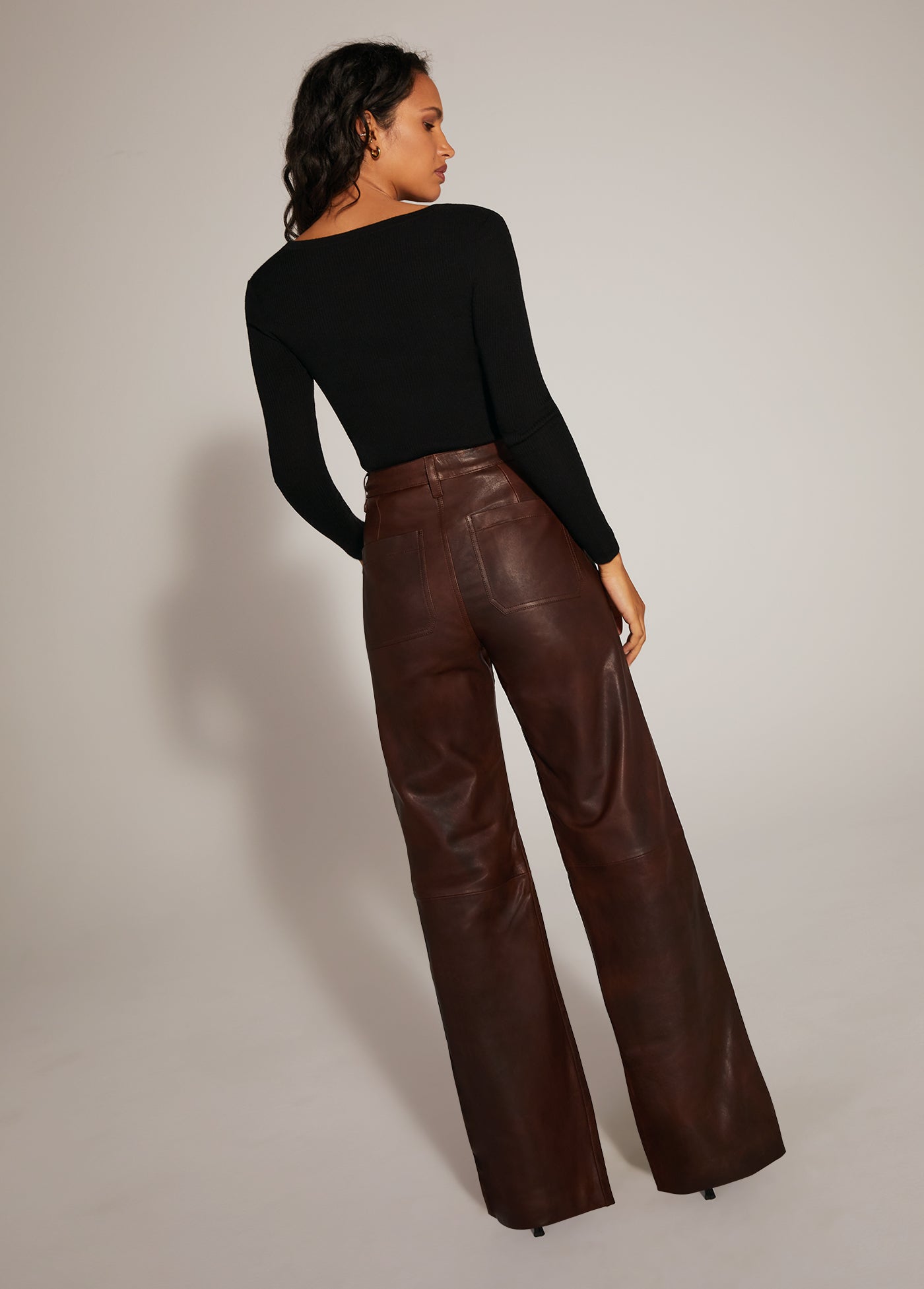 The relaxed wide leg, wide hem, high-rise Mischa makes a statement in supple Chocolate Leather. The natural fade of the cowhide adds dimension to this sophisticated, forever-in-style look.