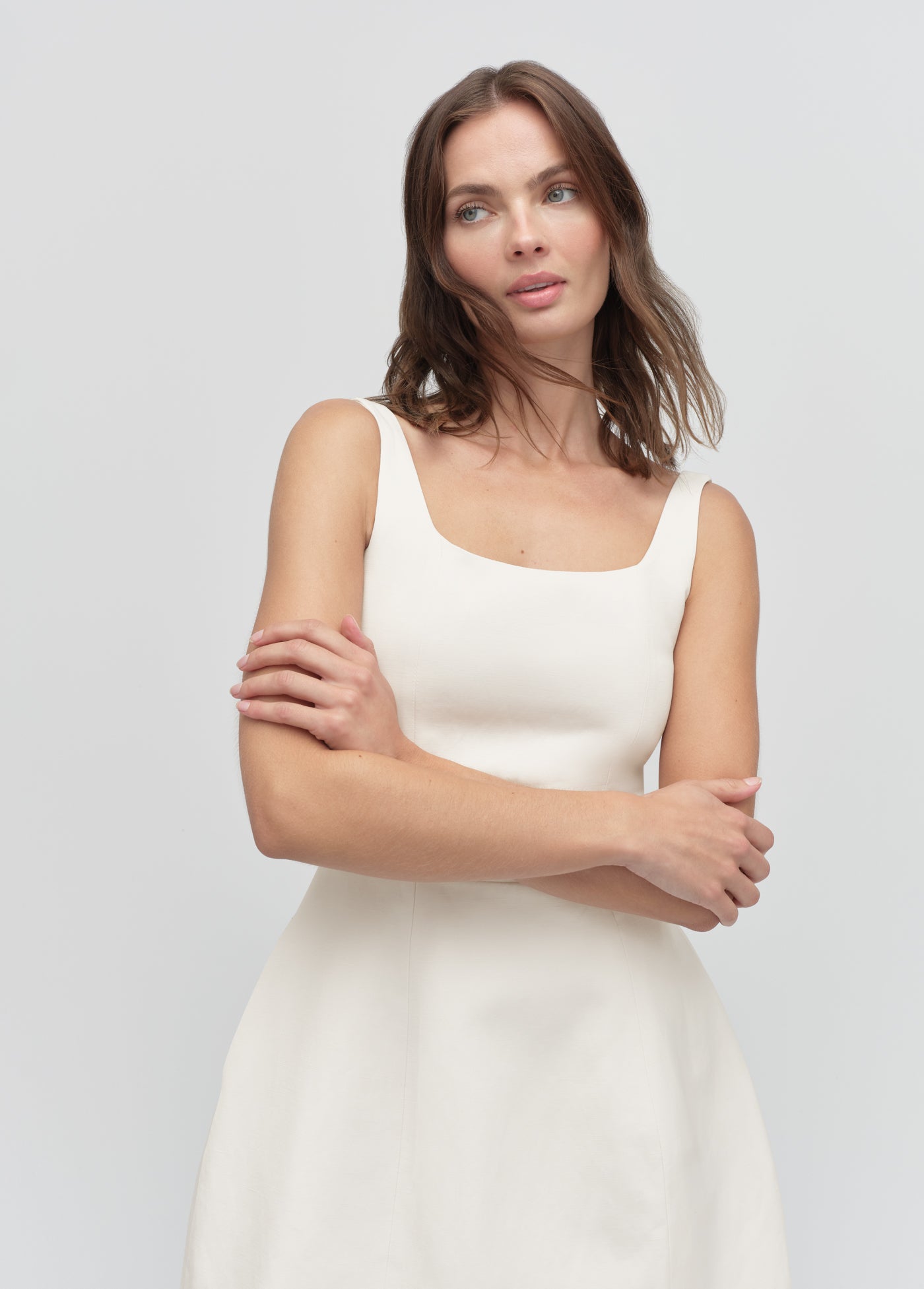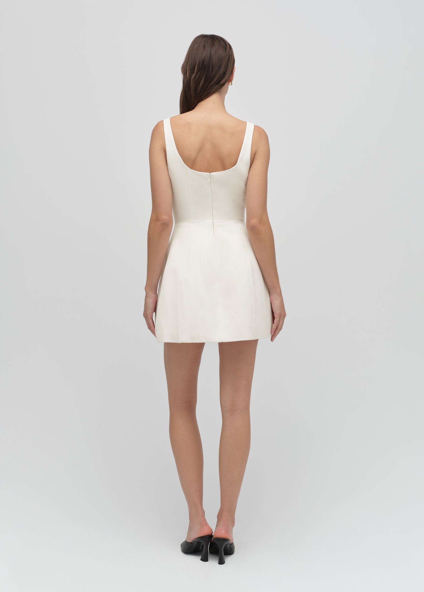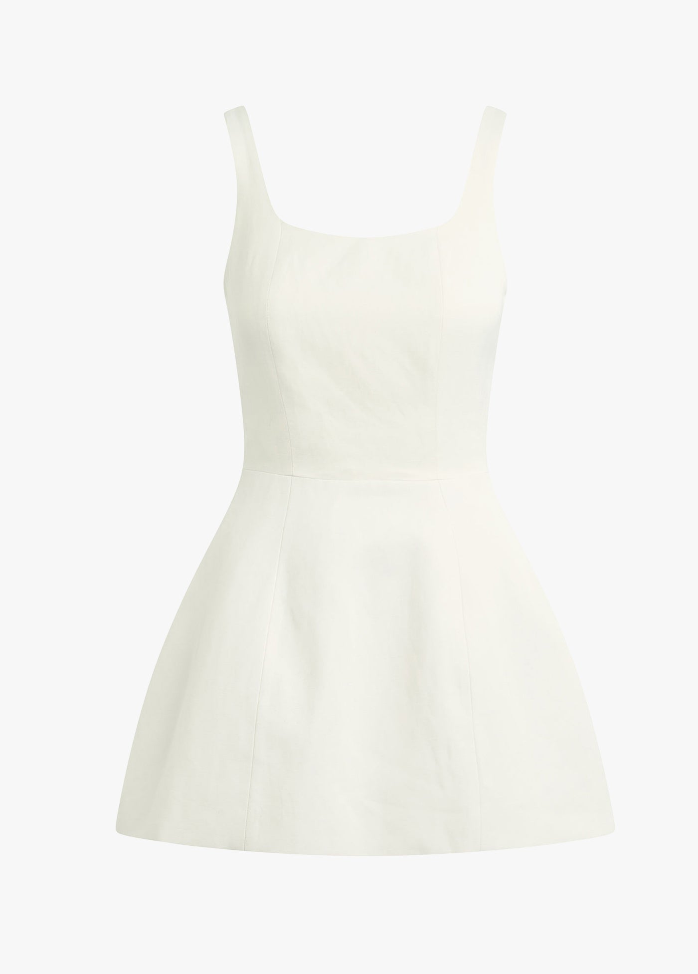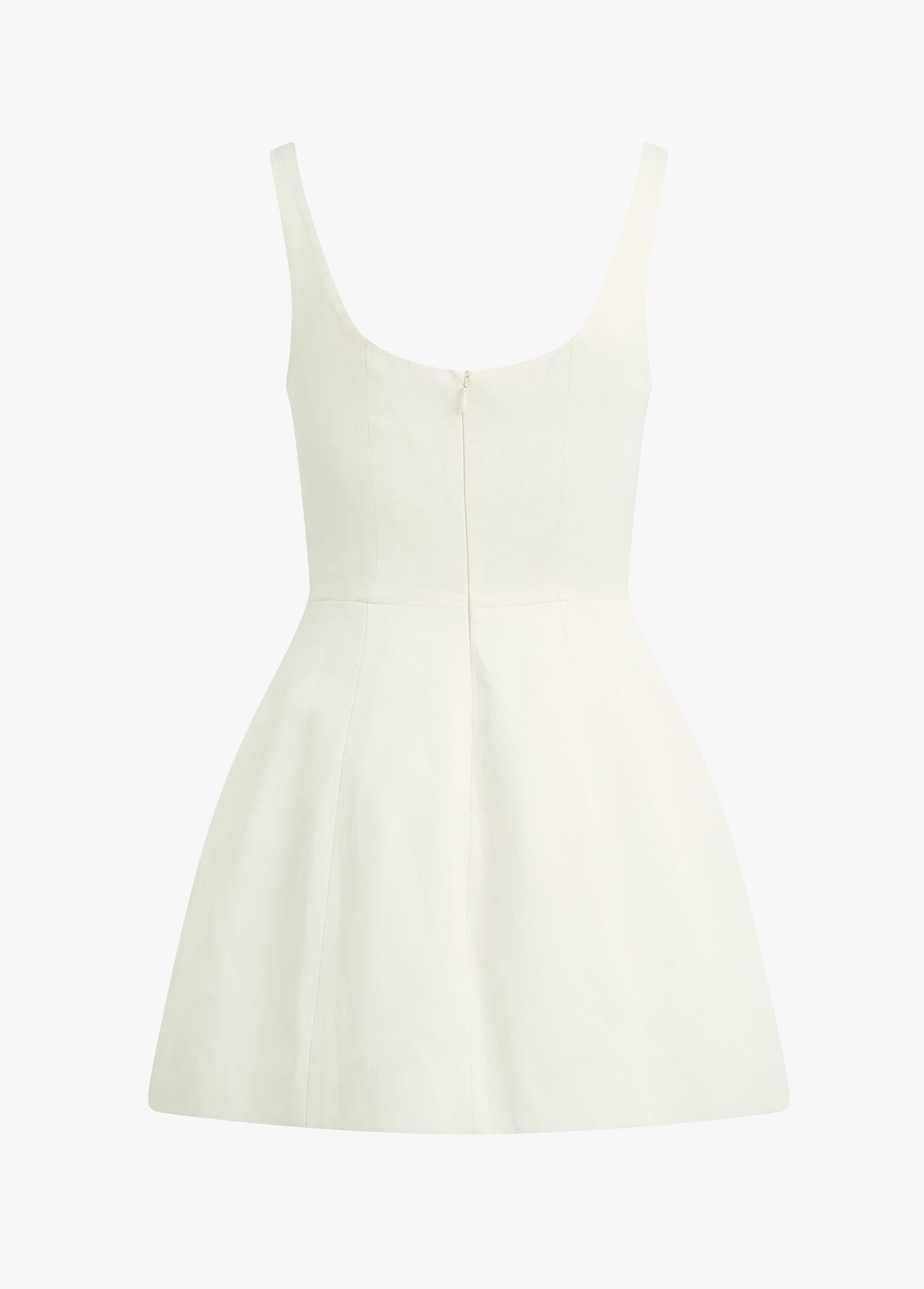 Like the sister you can’t ignore, this 32" mini makes an entrance. Scoop neck, fitted bodice, and a full, structured skirt. Cut in a linen blend that’s made for repeat drama.